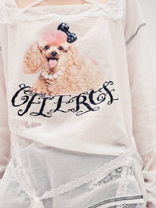 Dog Print Lace-Trim Long Sleeve T-shirt NA6649