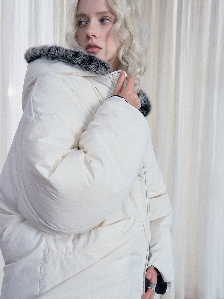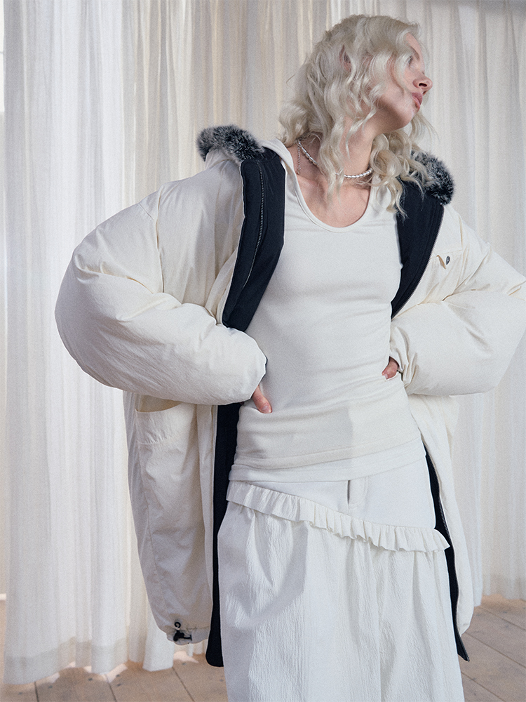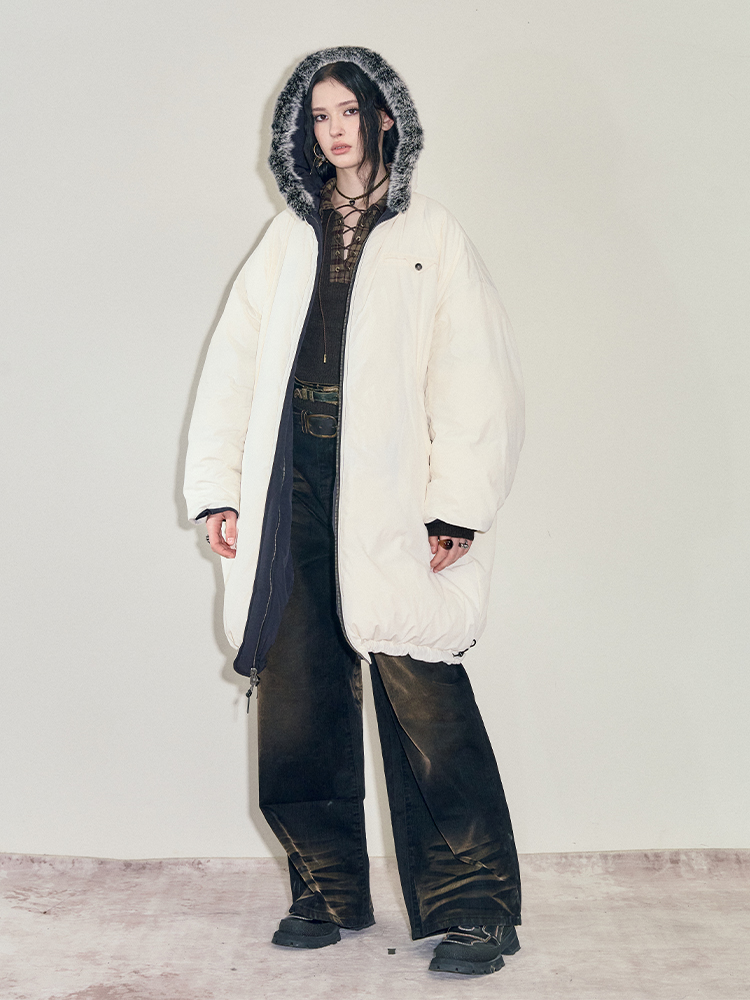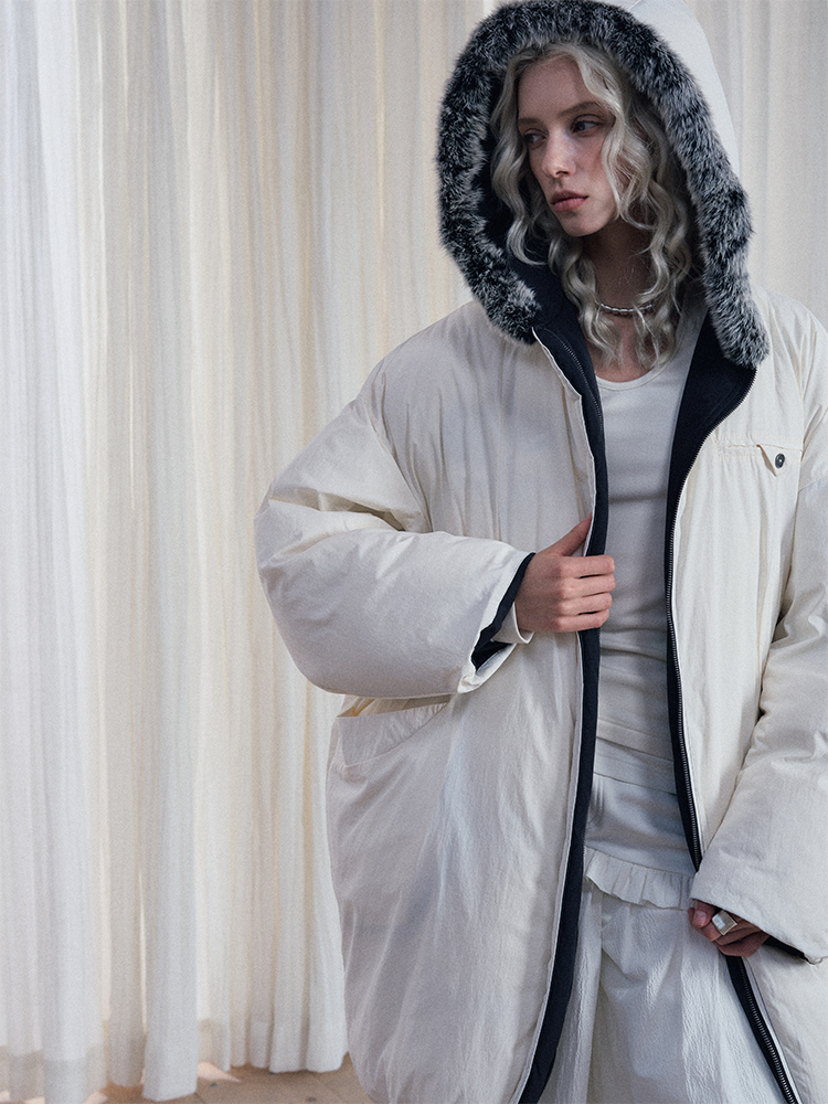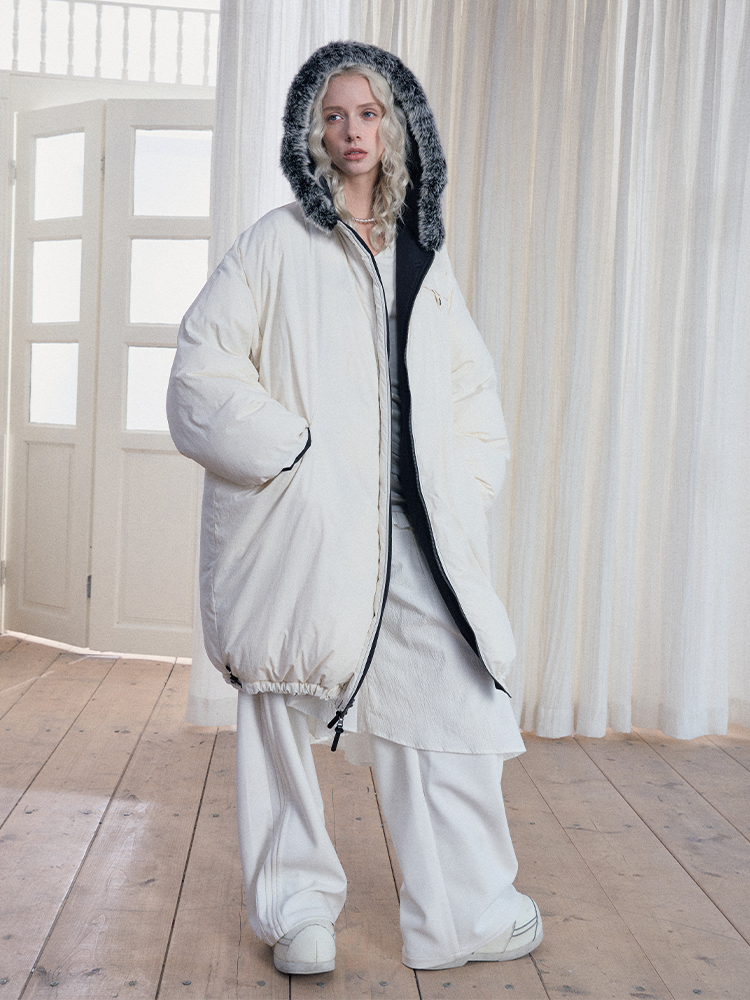 Reversible Fake Fur Hooded Puffer White Duck Down Jacket NA7869