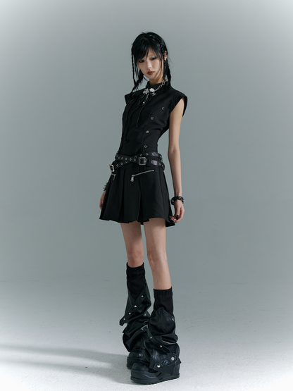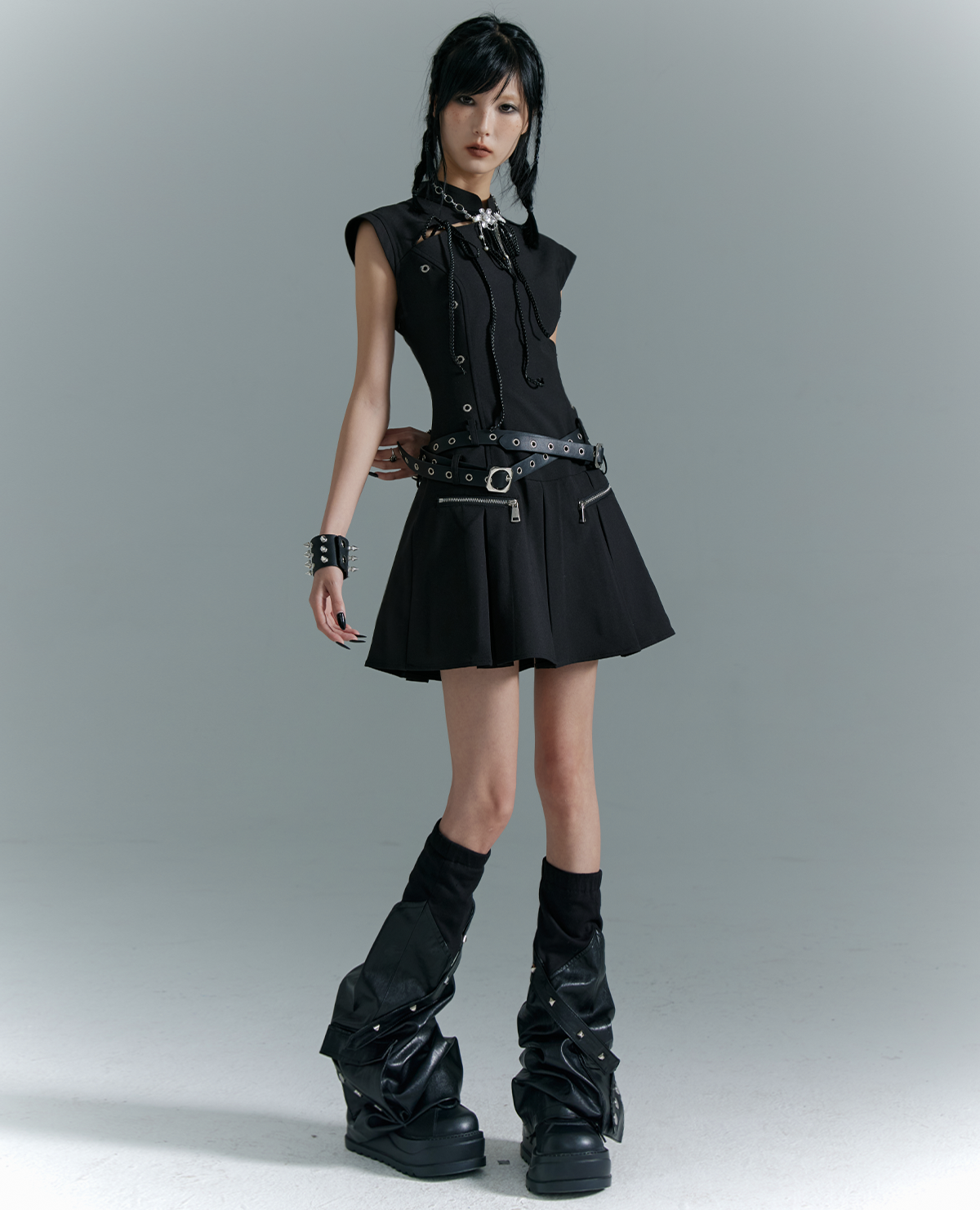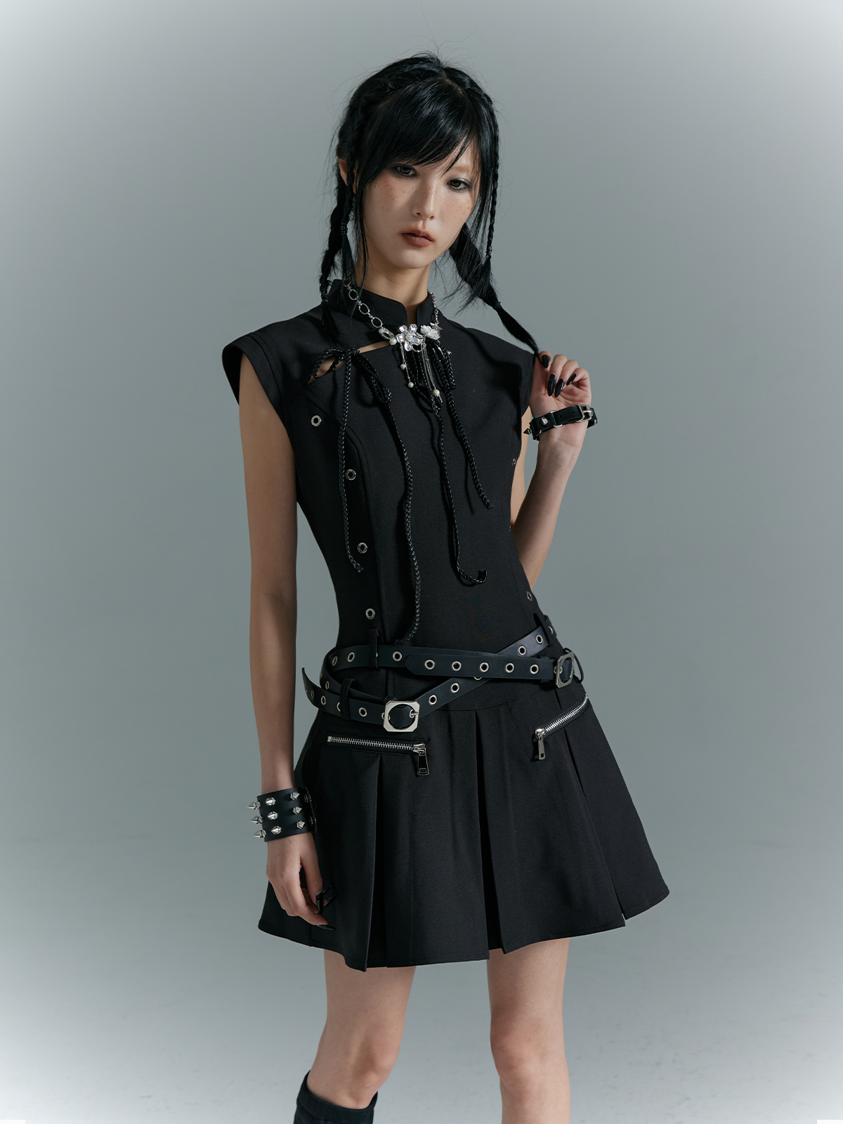 Cutout Pleats Qipao Sleeveless Dress with Belt NA8177