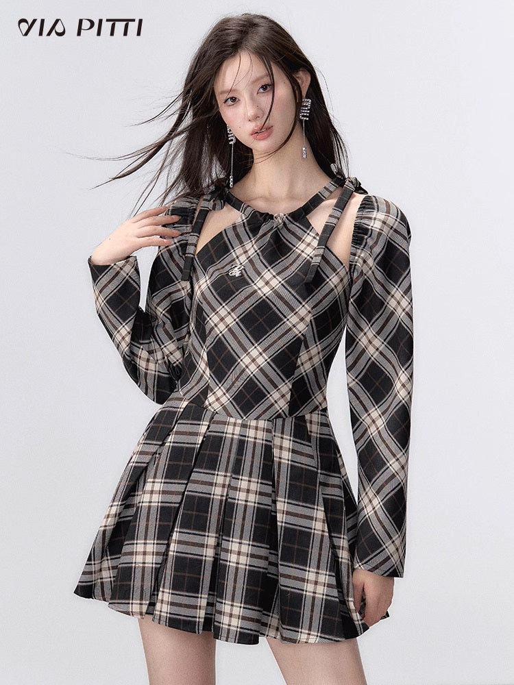Shoulder Cut Plaid A-line Pleated Dress NA4916