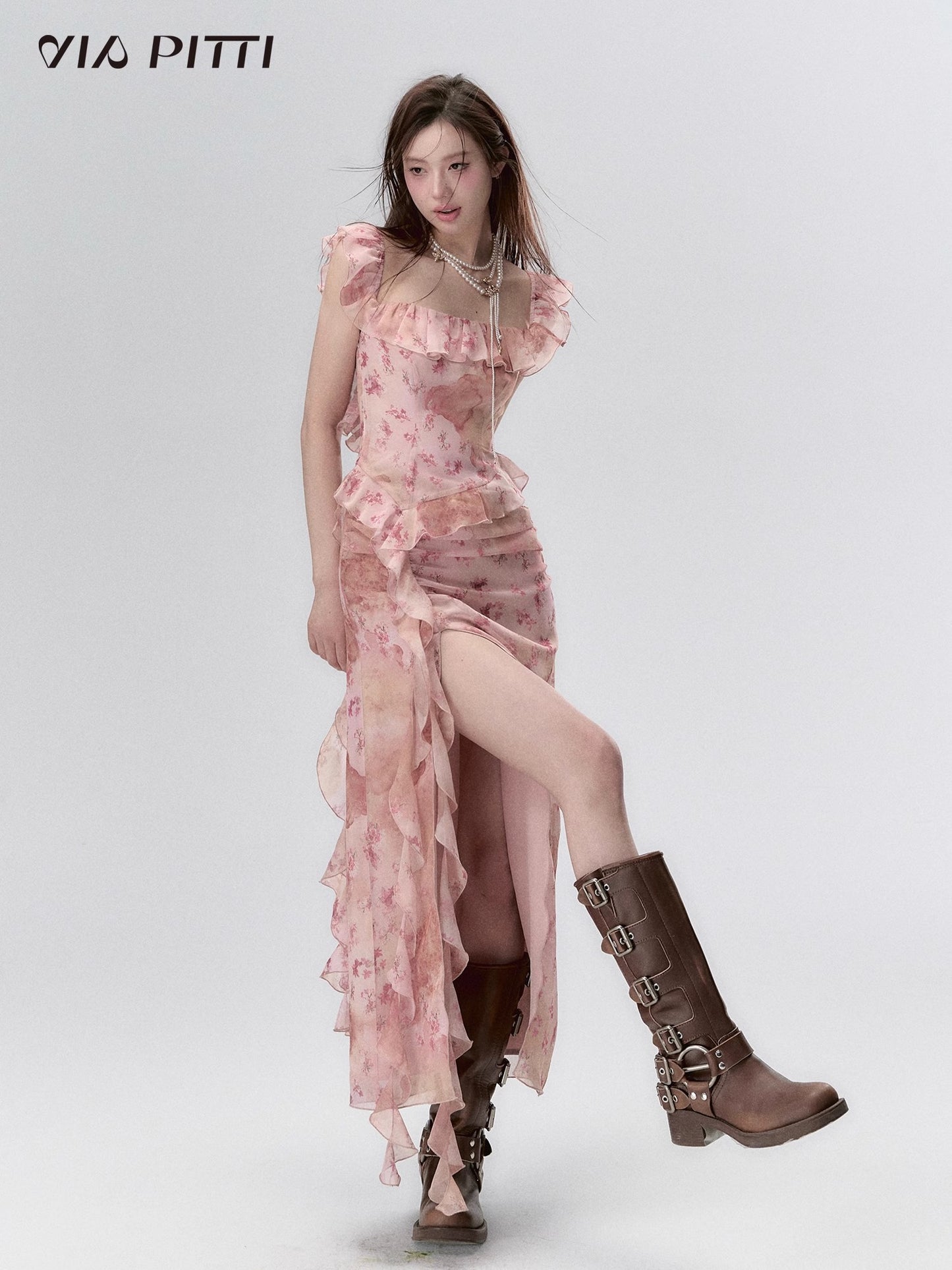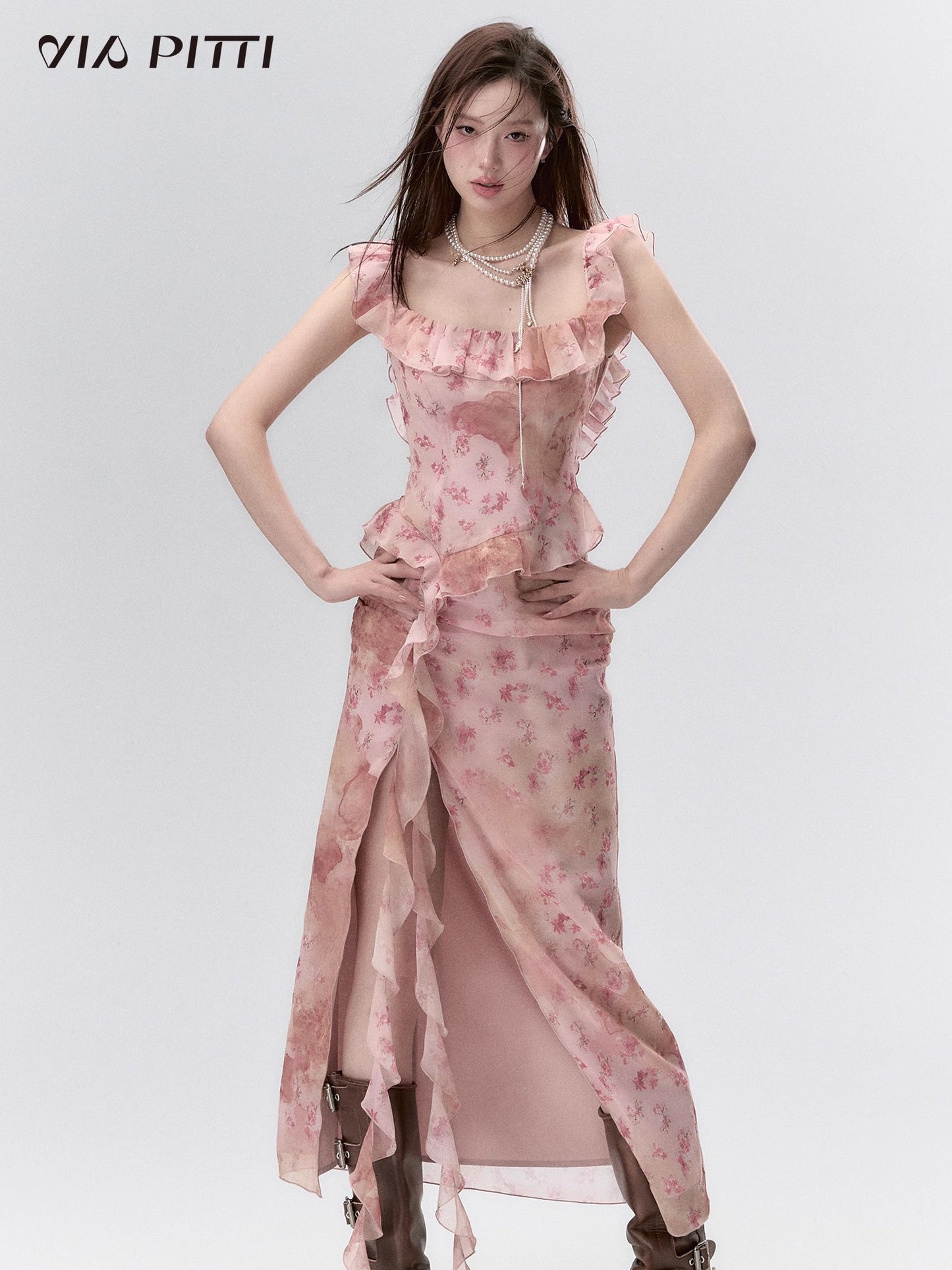 Flower Print Ruffle Long Dress With Slit NA4955