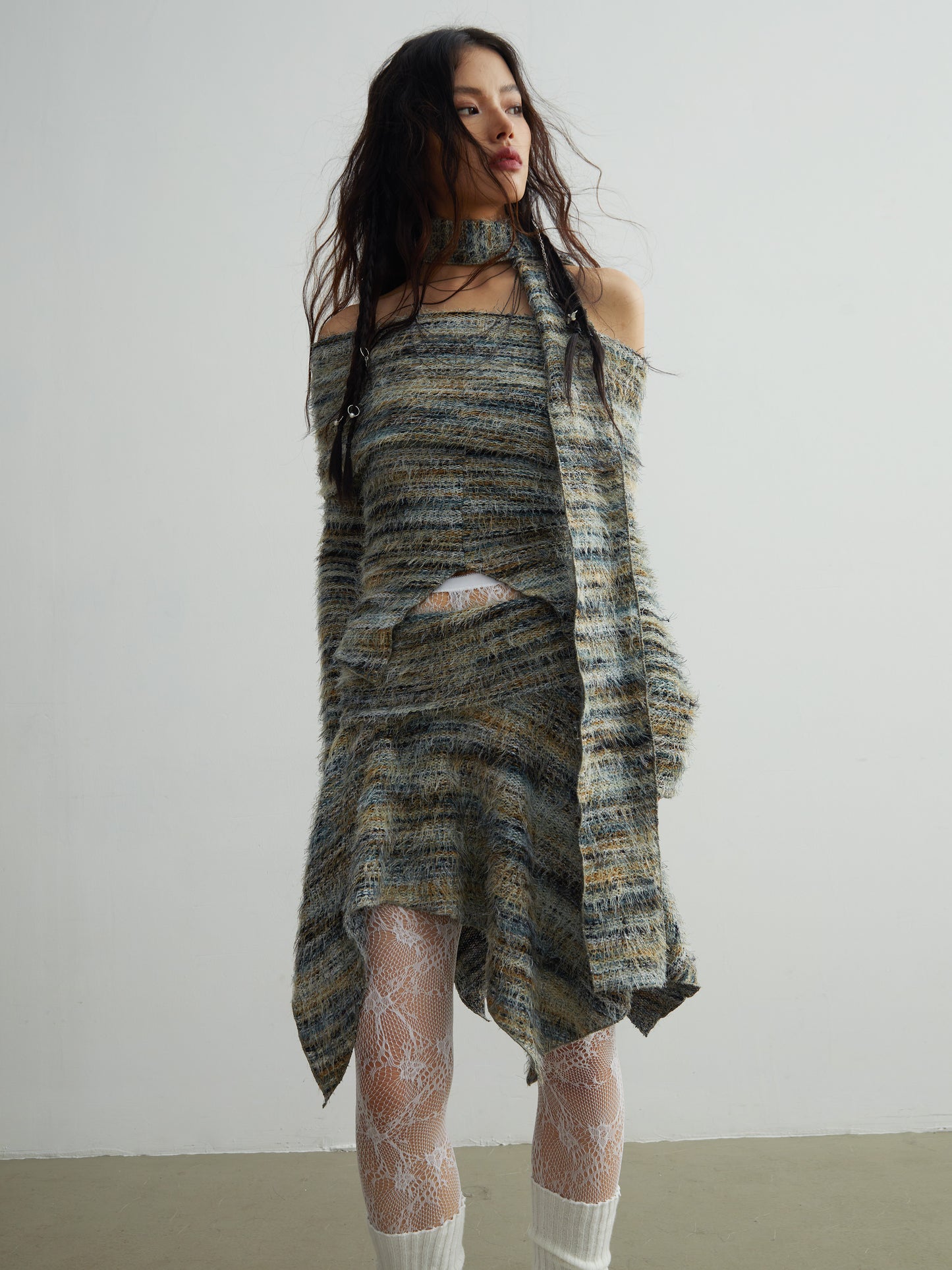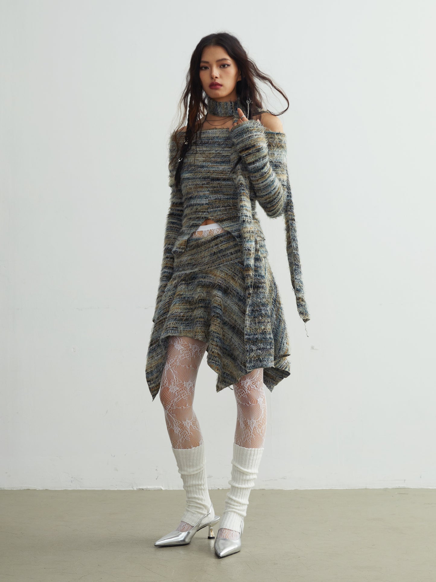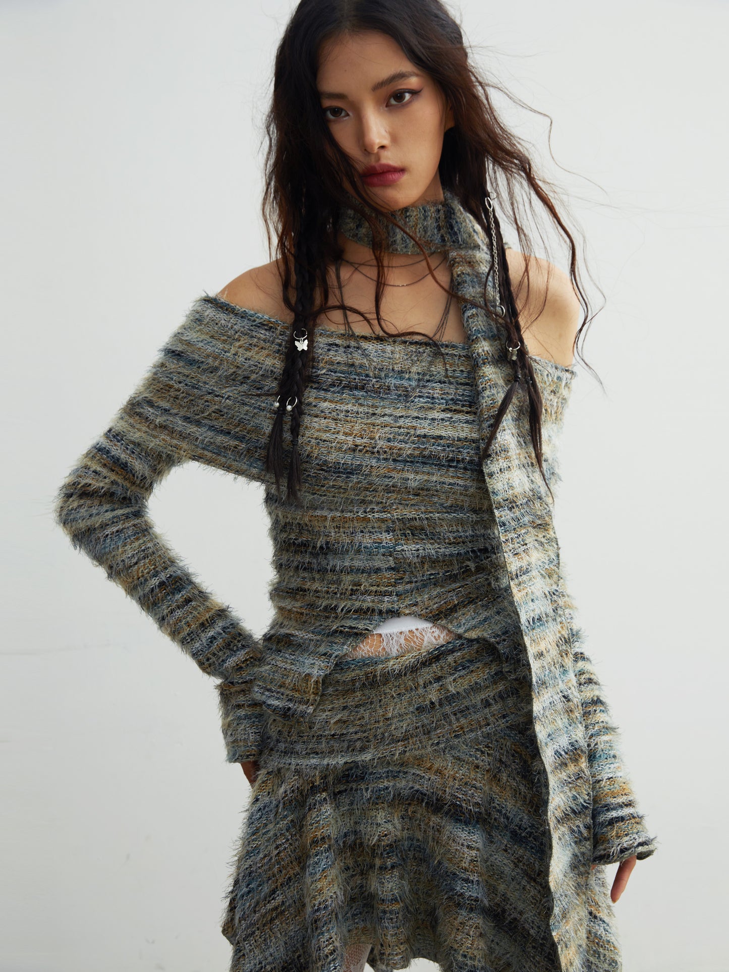 With Scarf Off Shoulder Knit Sweater & Irregular Hem Length Knit Skirt Setup NA5161