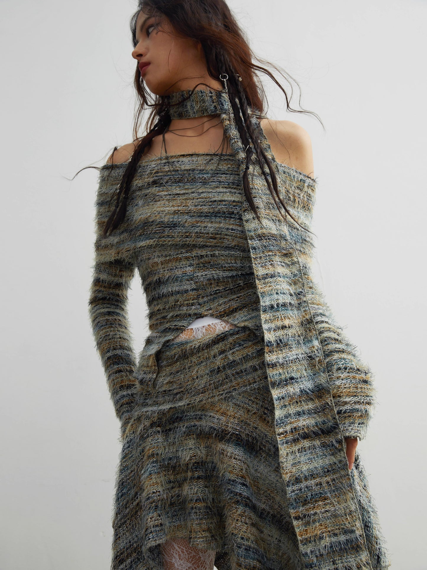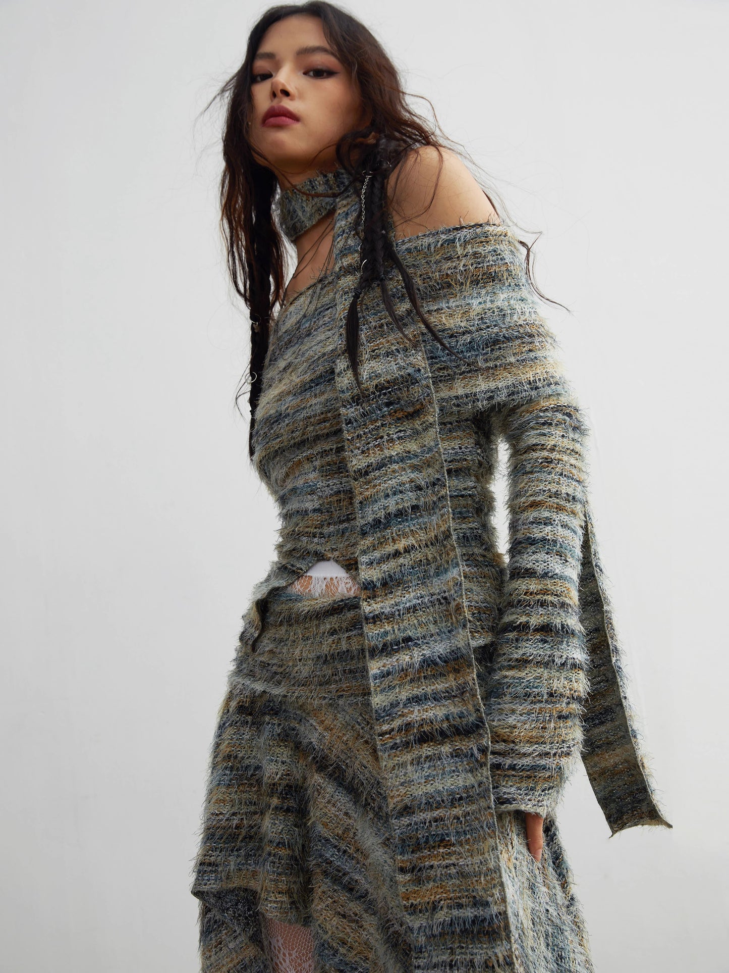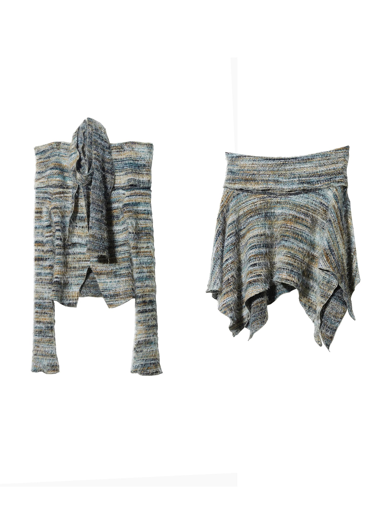 With Scarf Off Shoulder Knit Sweater & Irregular Hem Length Knit Skirt Setup NA5161