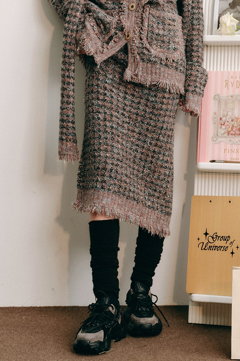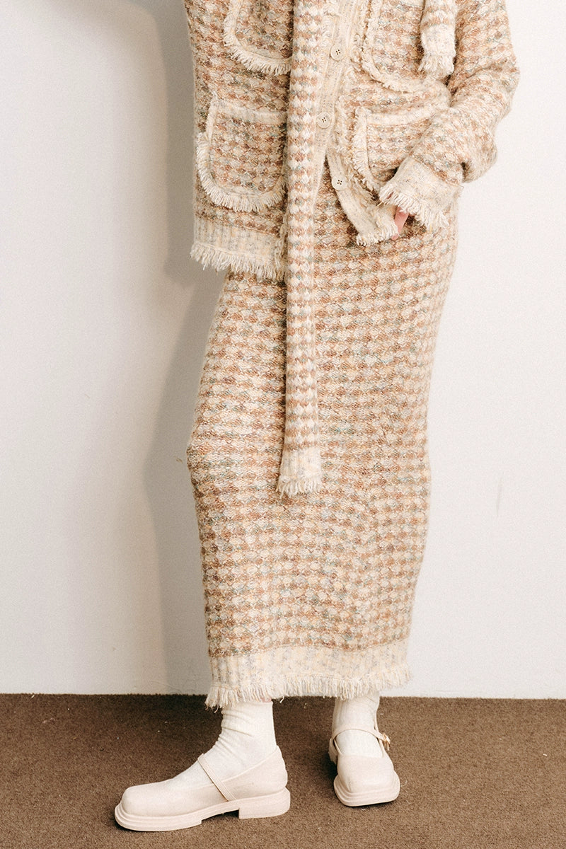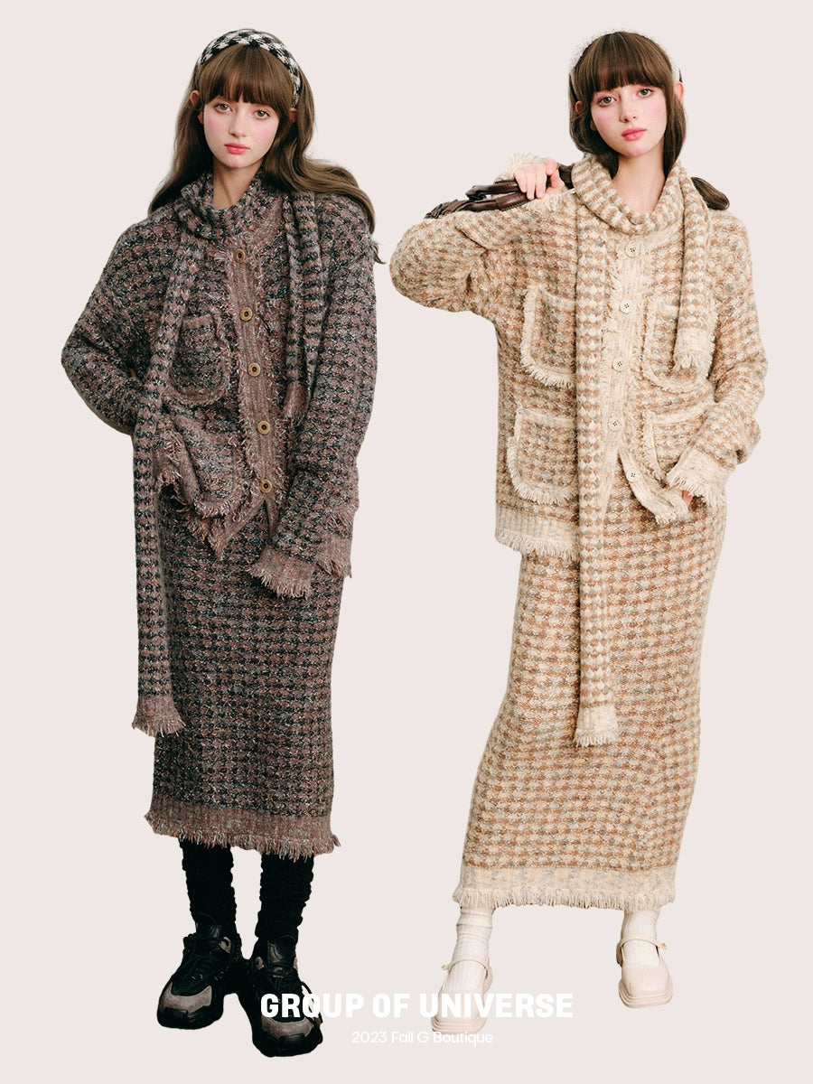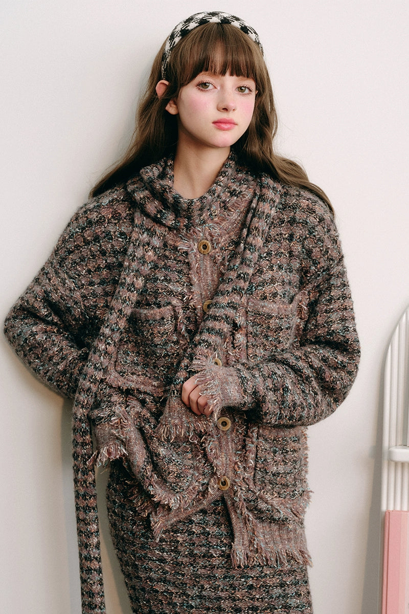 Plaid Button Cardigan & Scarf & Long Skirt Setup NA5877