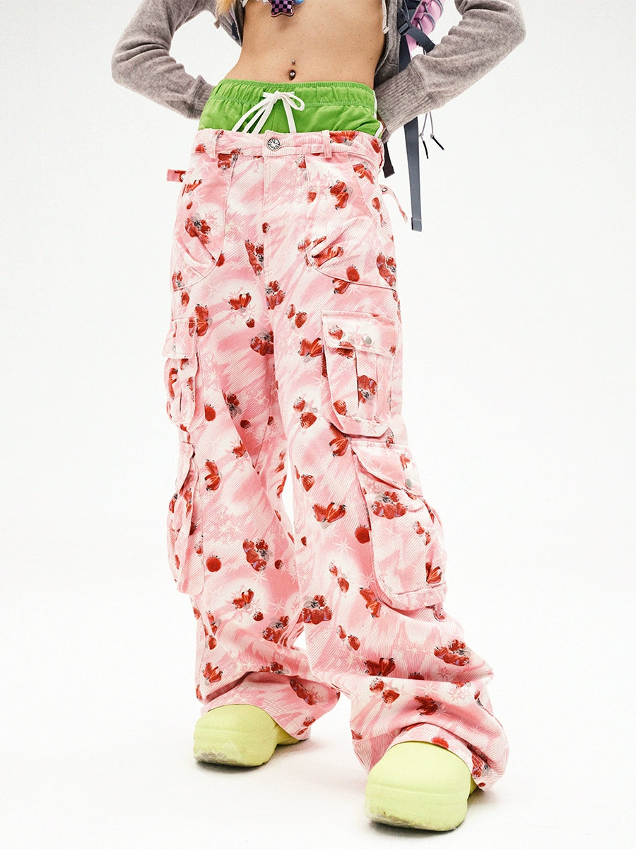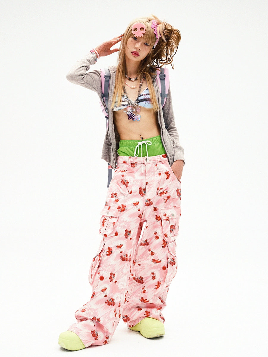 Strawberry Print Wide-Leg Cargo Denim Jeans NA6647
