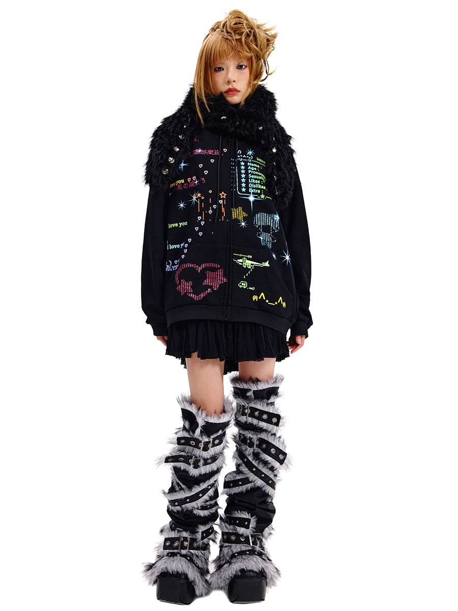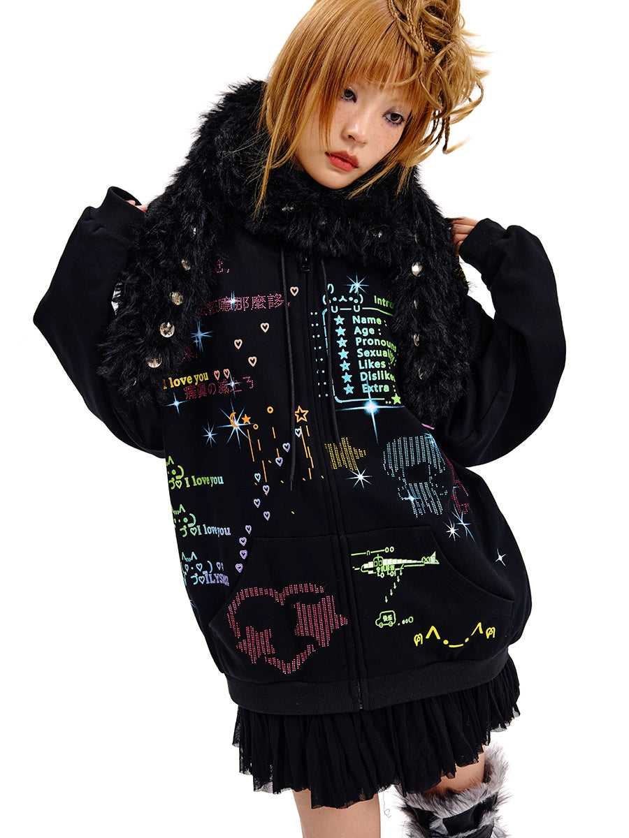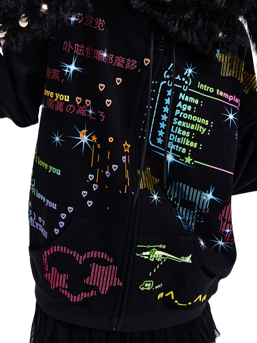 Letter Rhinestone Print Zipper Hoodie NA6695