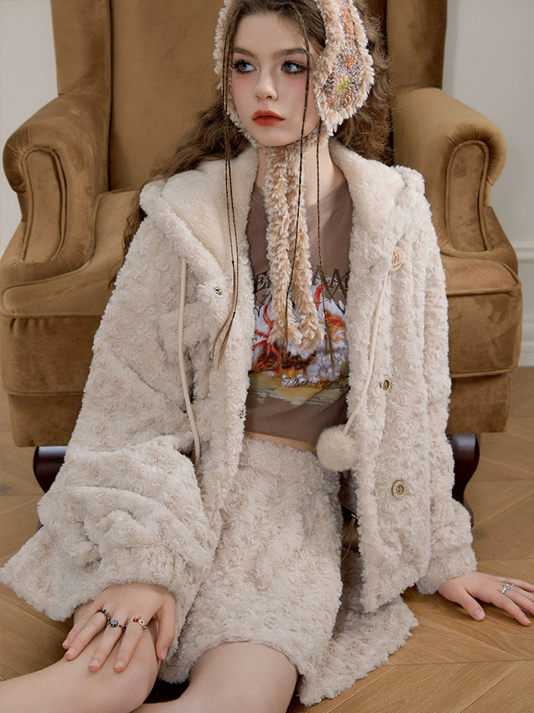 Fake Shearling Hooded Jacket & Short Skirt Setup NA6895