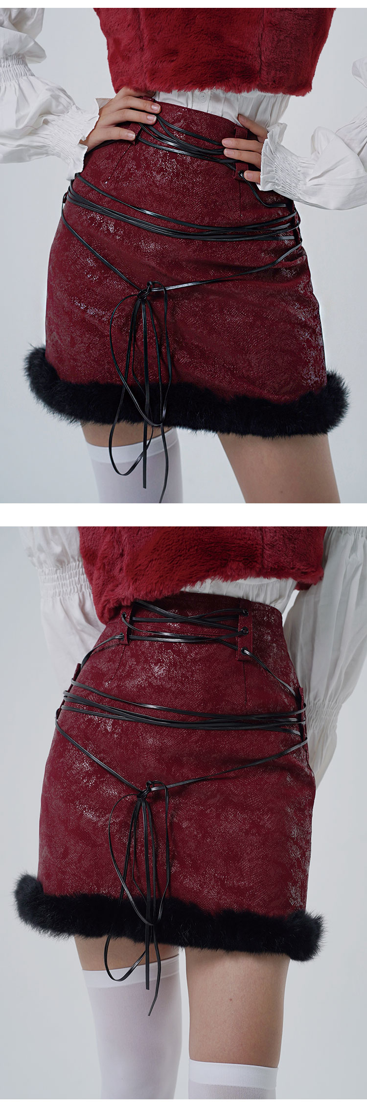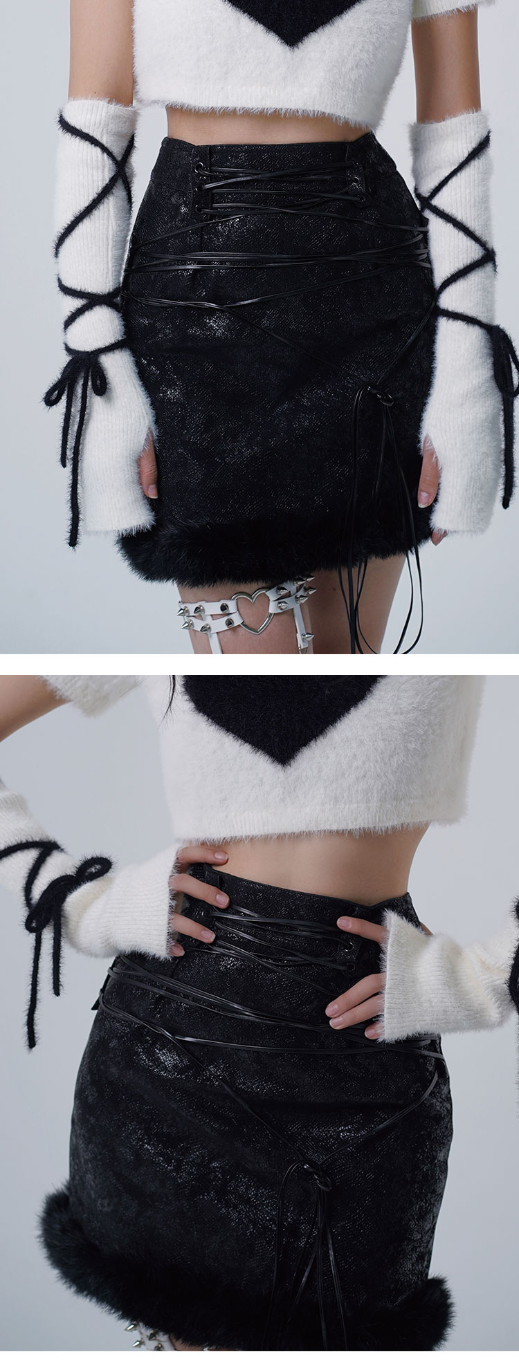 Fur Patchwork Tie-Strap PU Leather Skirt NA7752
