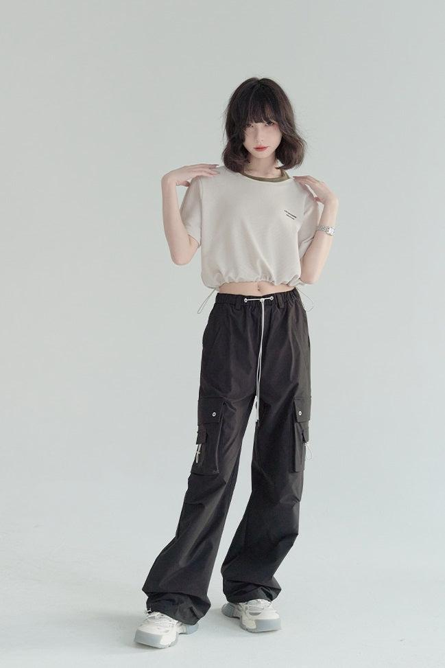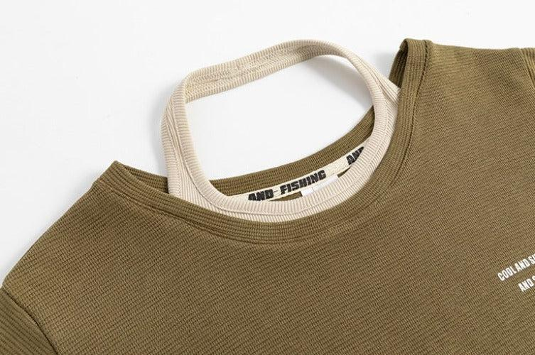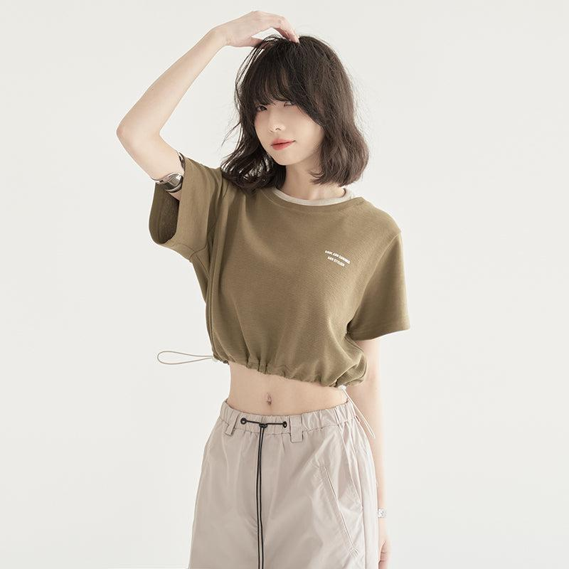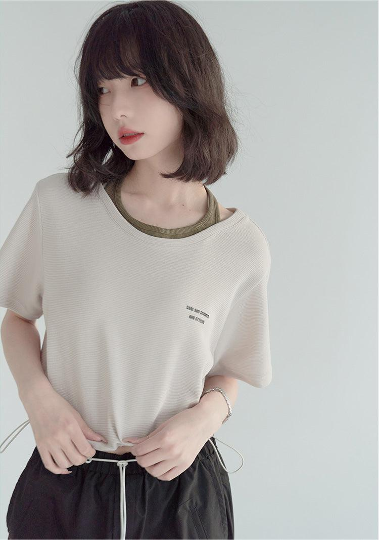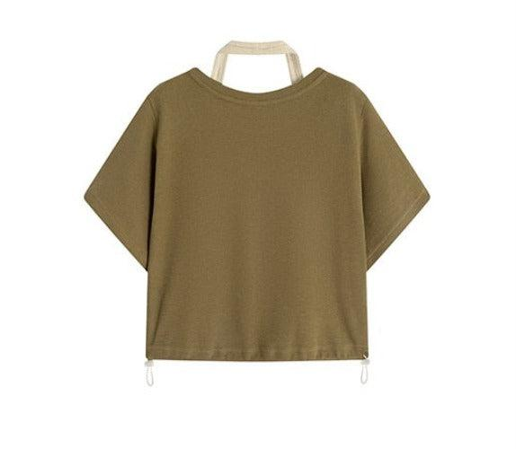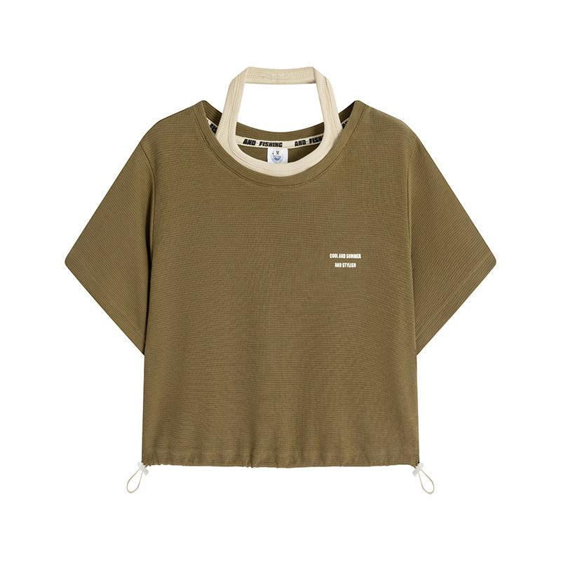 Drawstring Fake Two-piece Halterneck Short-sleeve T-shirt WNW1417