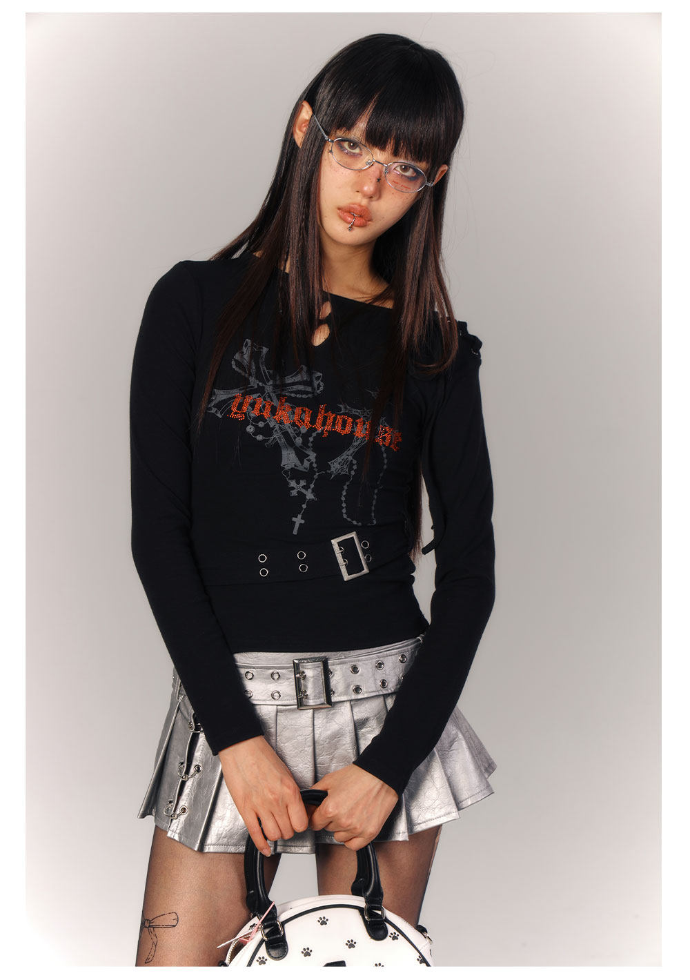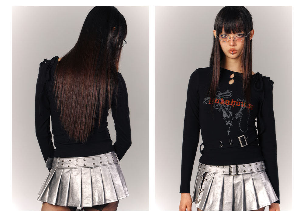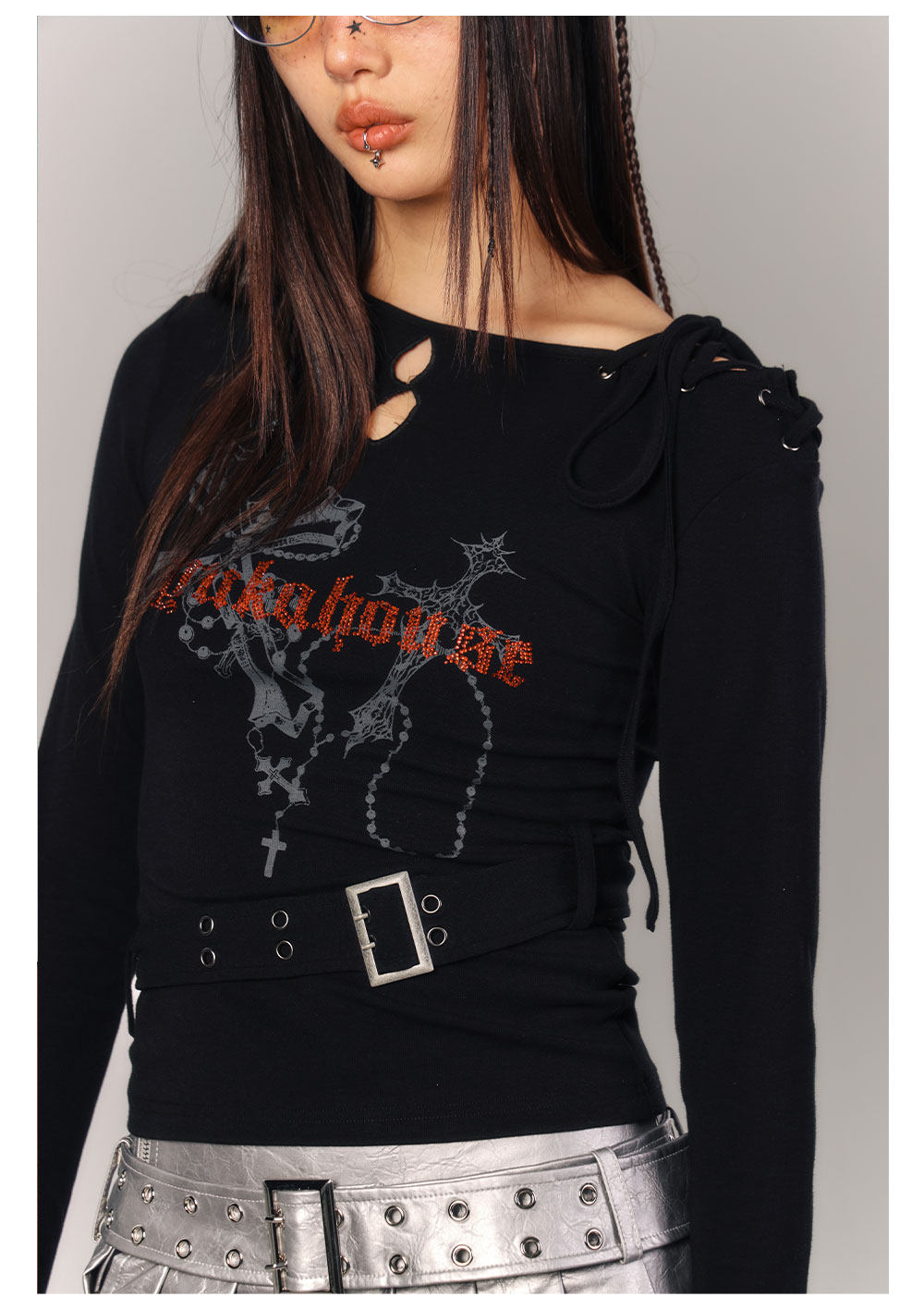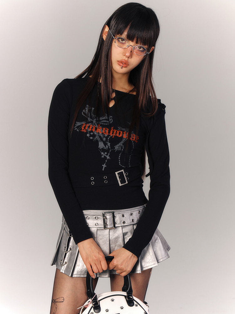 Cross Print Strap Buckle Cutout Long Sleeve T-Shirt NA9220