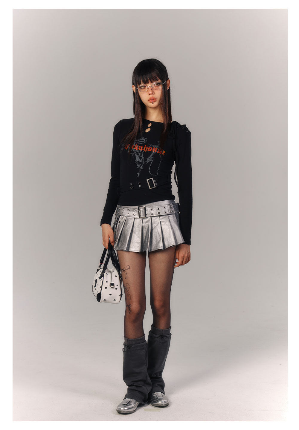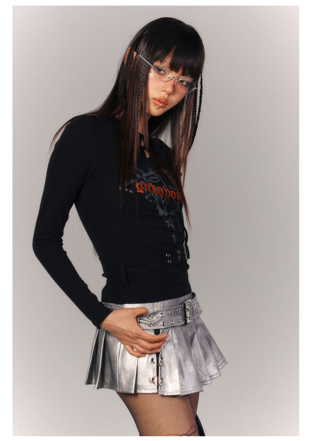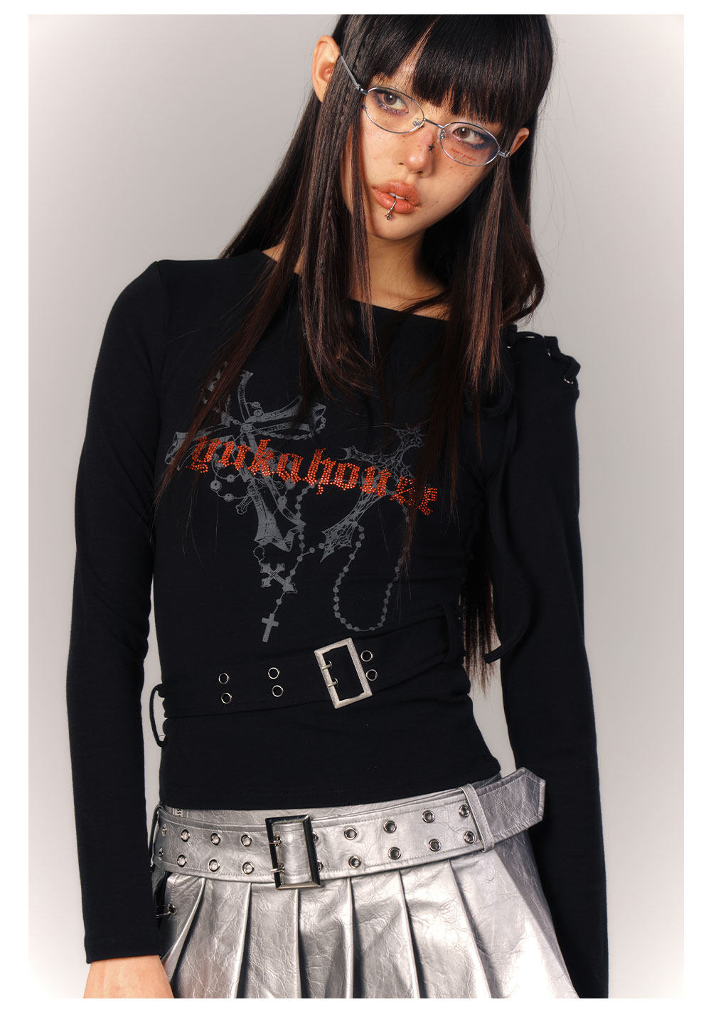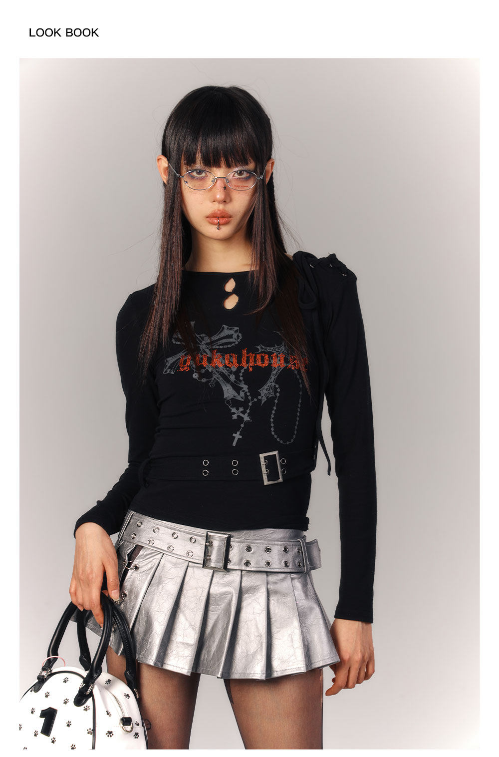 Cross Print Strap Buckle Cutout Long Sleeve T-Shirt NA9220