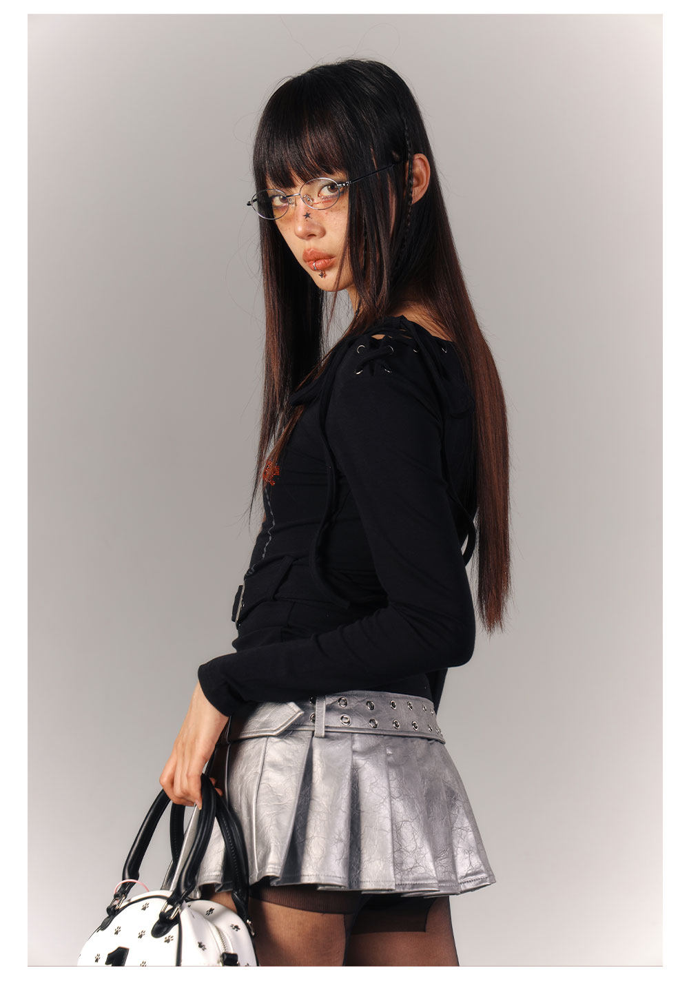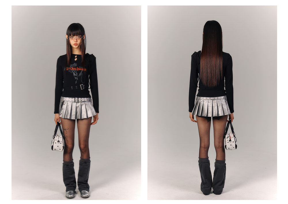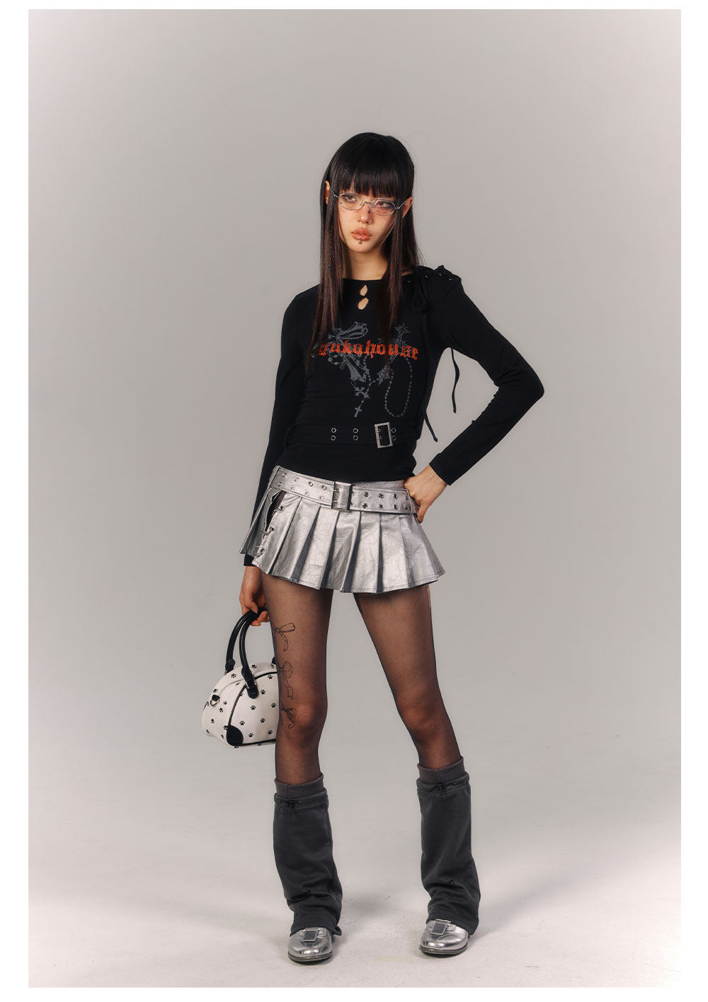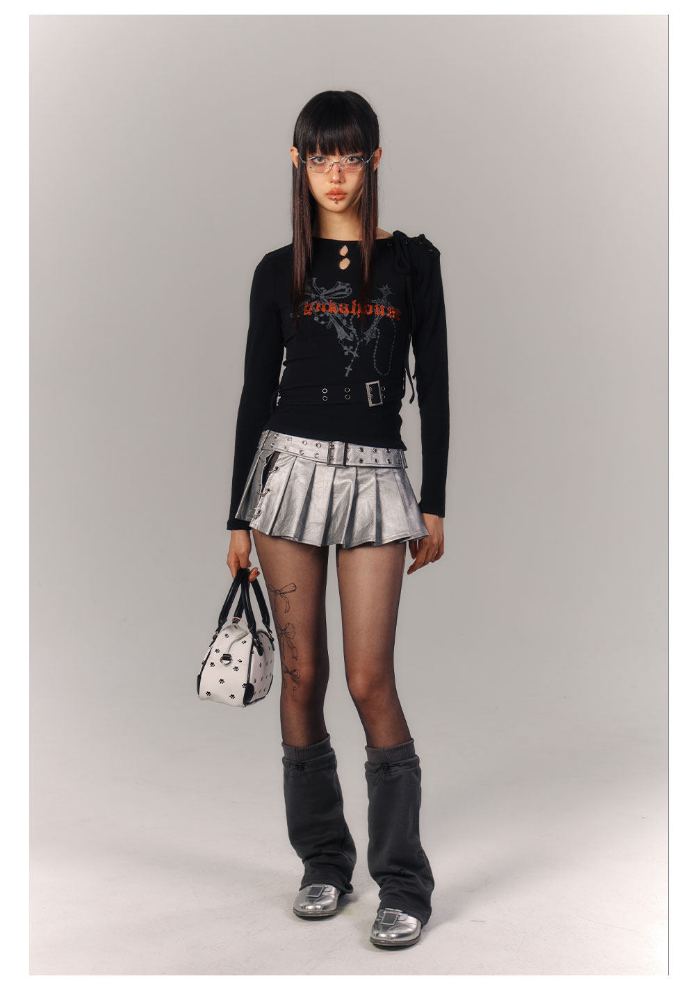 Cross Print Strap Buckle Cutout Long Sleeve T-Shirt NA9220