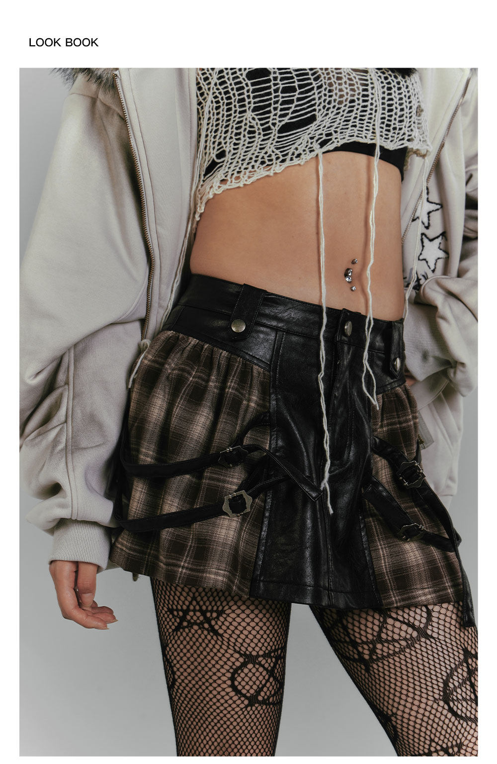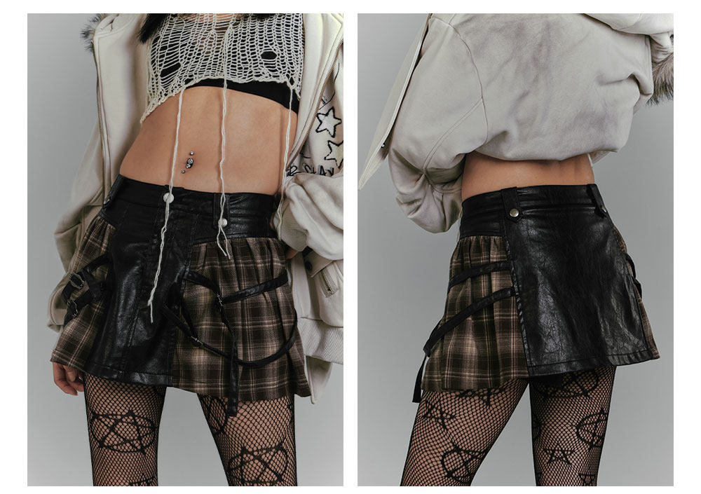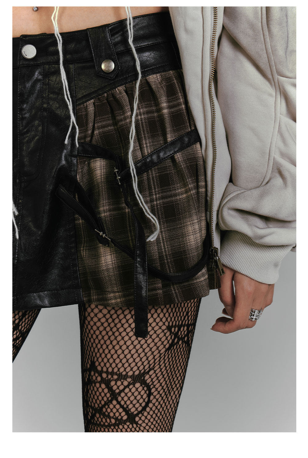 Plaid PU Leather Mix Patchwork Short Skirt NA9221