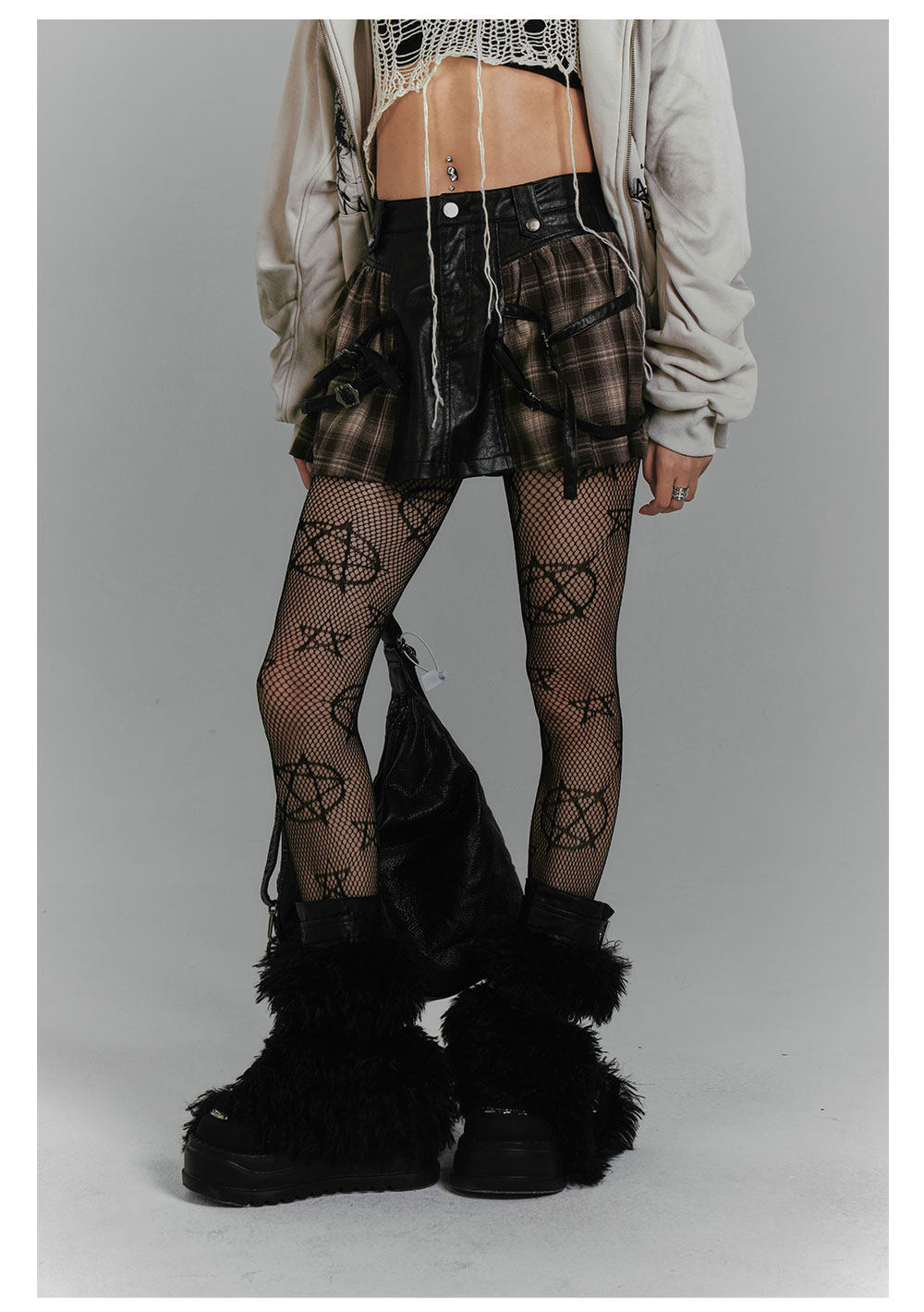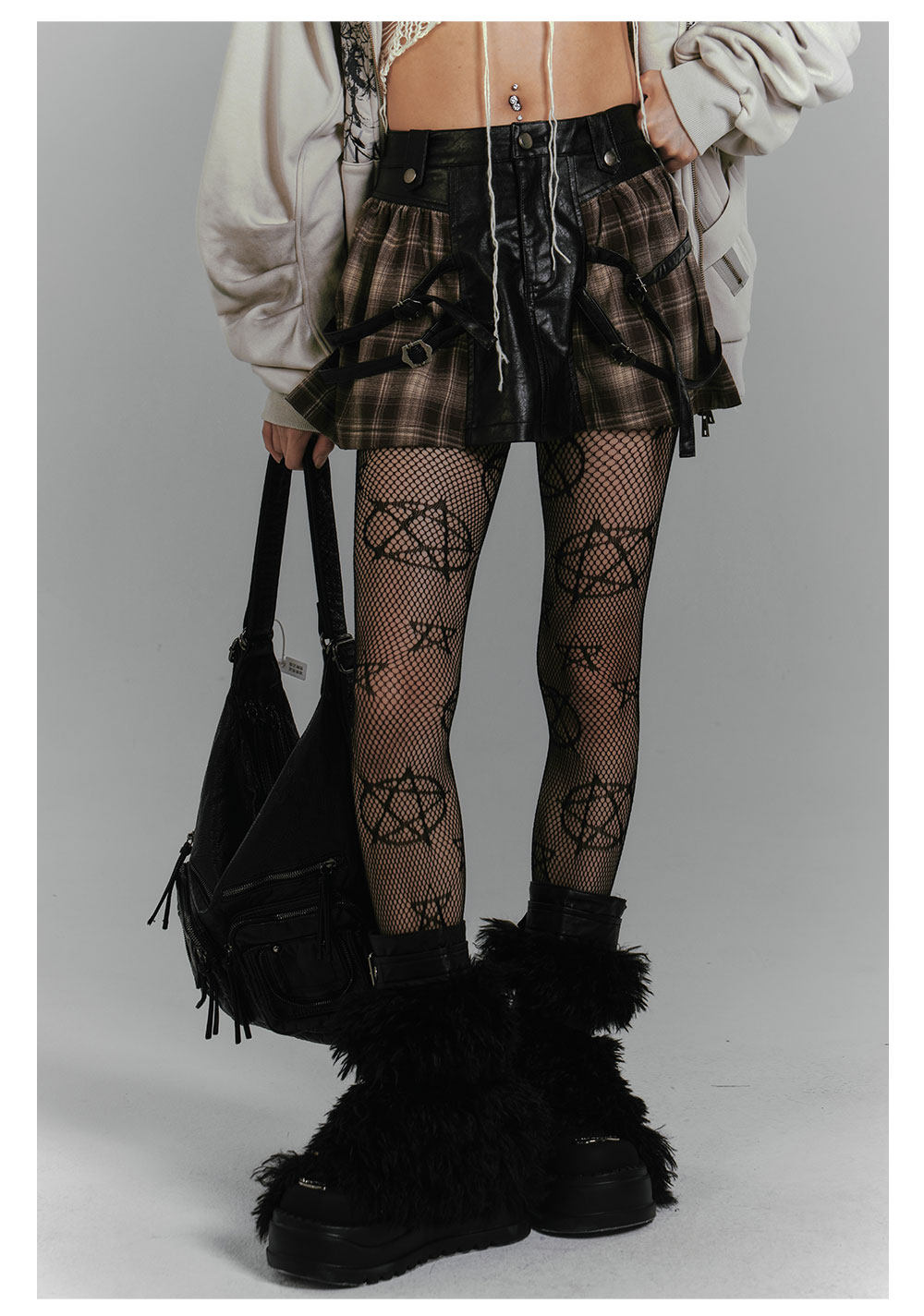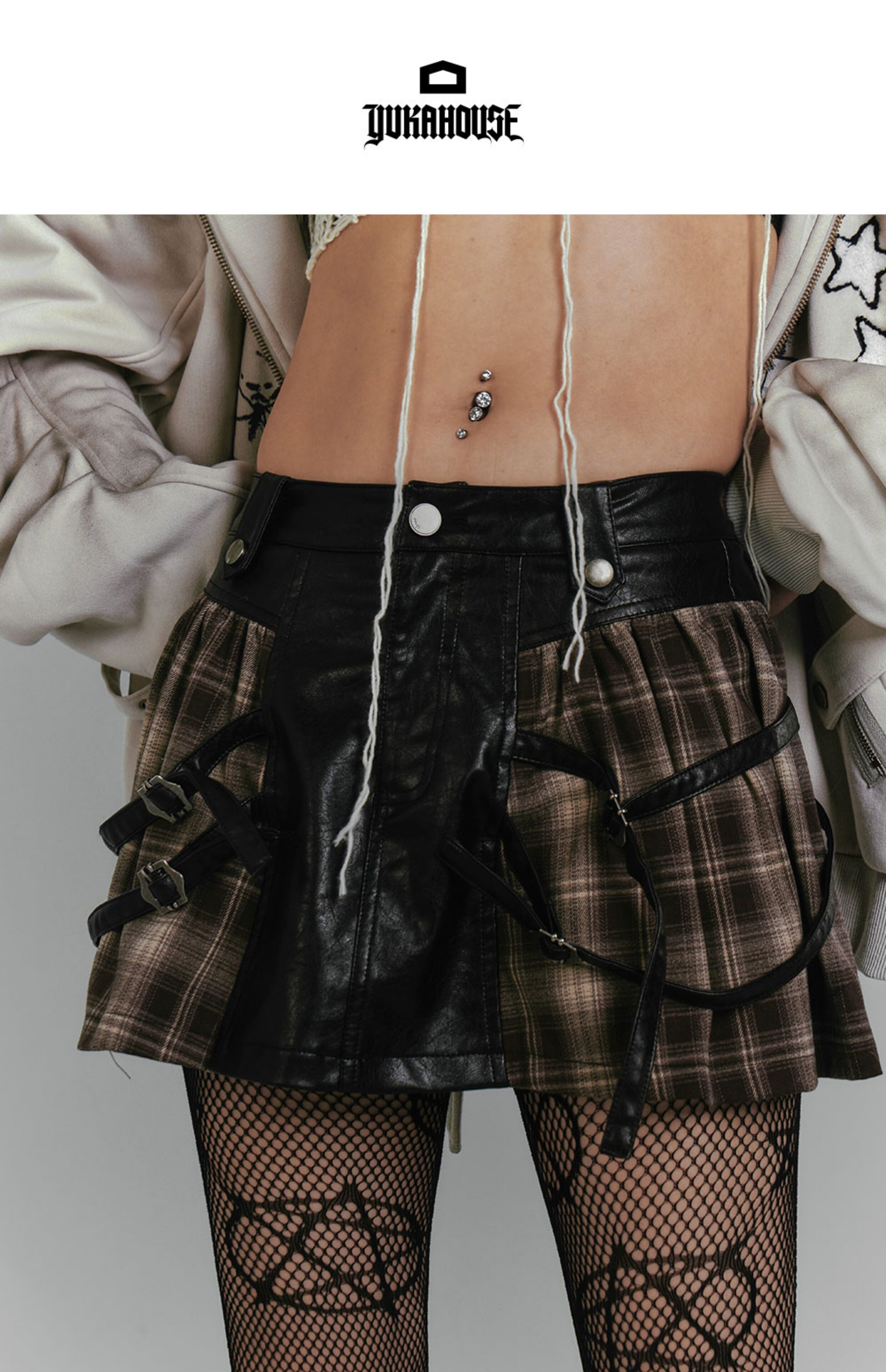 Plaid PU Leather Mix Patchwork Short Skirt NA9221