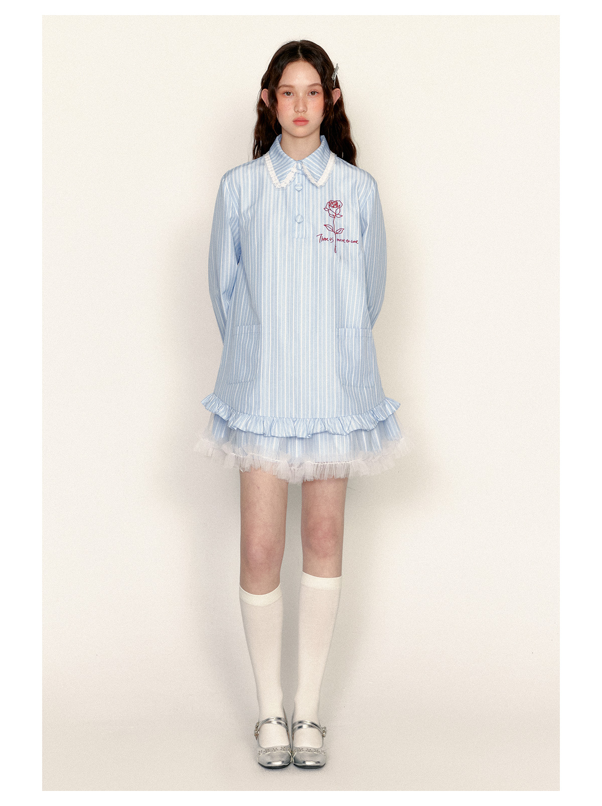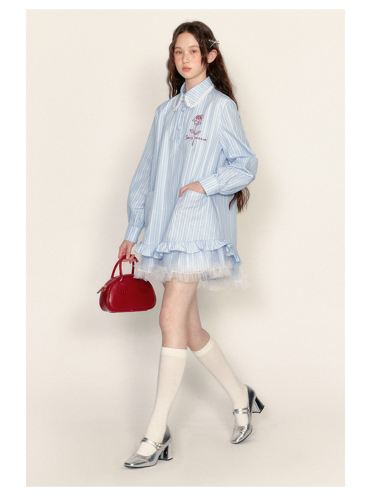 Blue Striped Lace-Trim Doll Collar Long Sleeve Dress NA7013