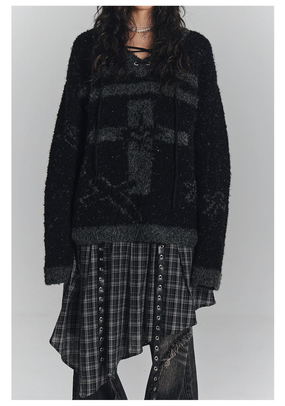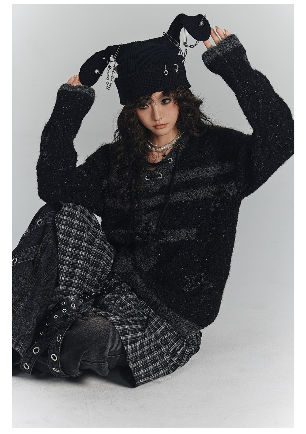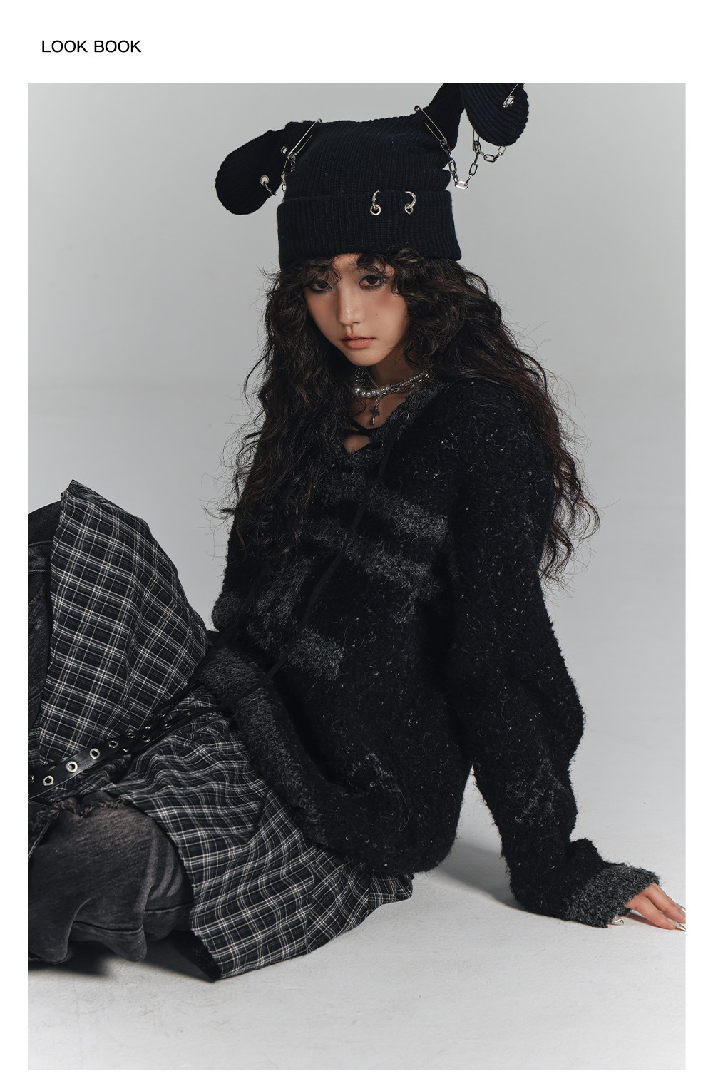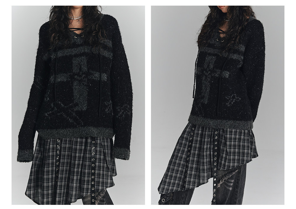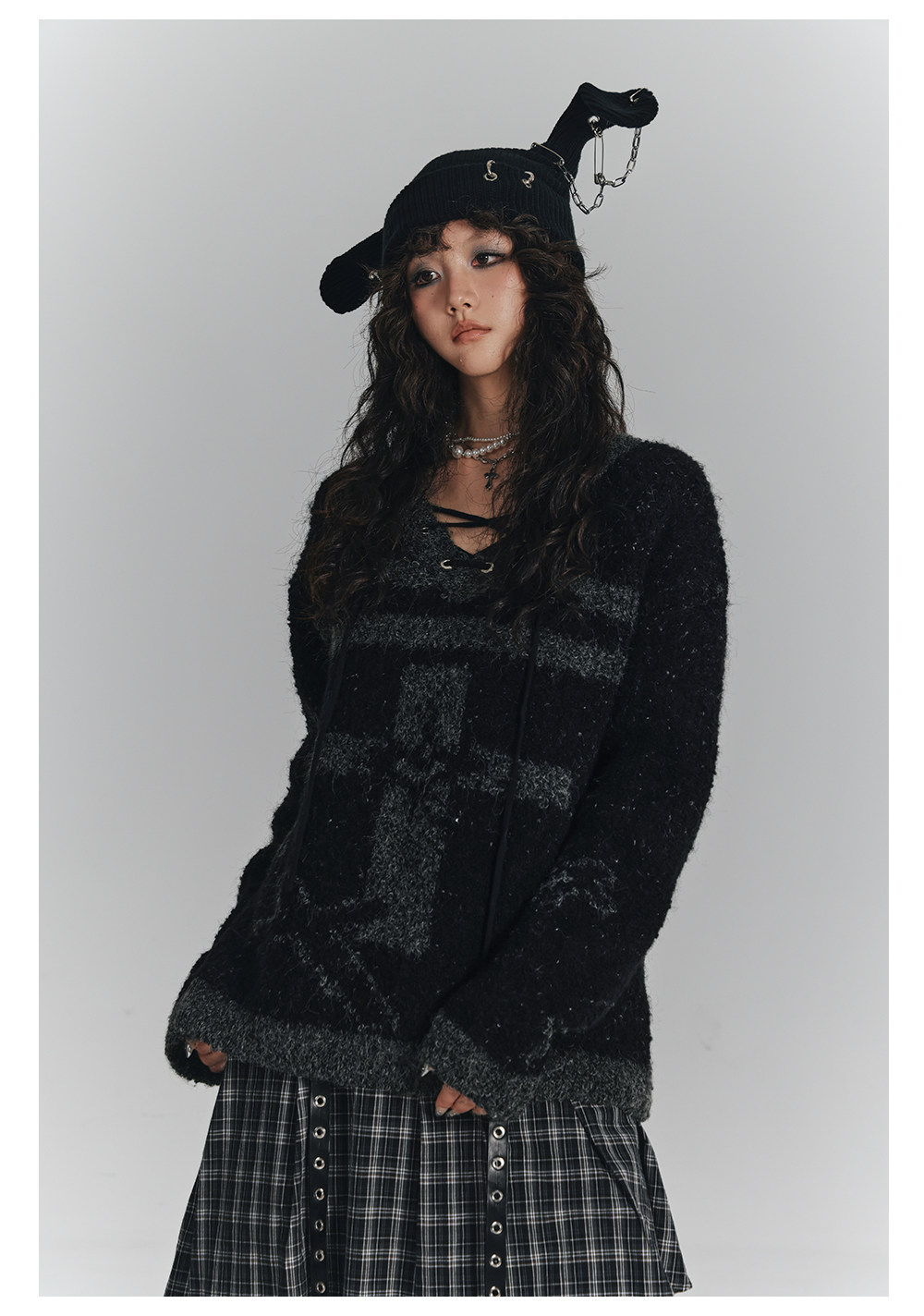 Cross Detail Drawstring Oversize V-Neck Knit Sweater NA8890