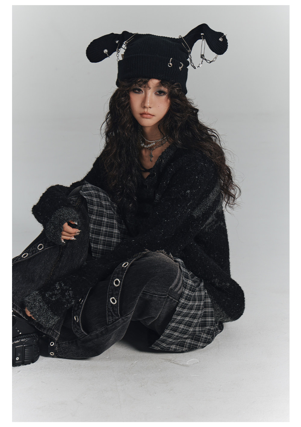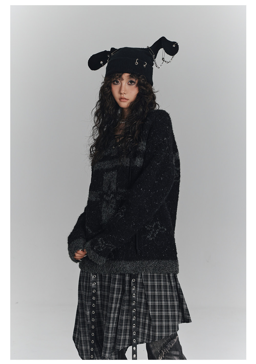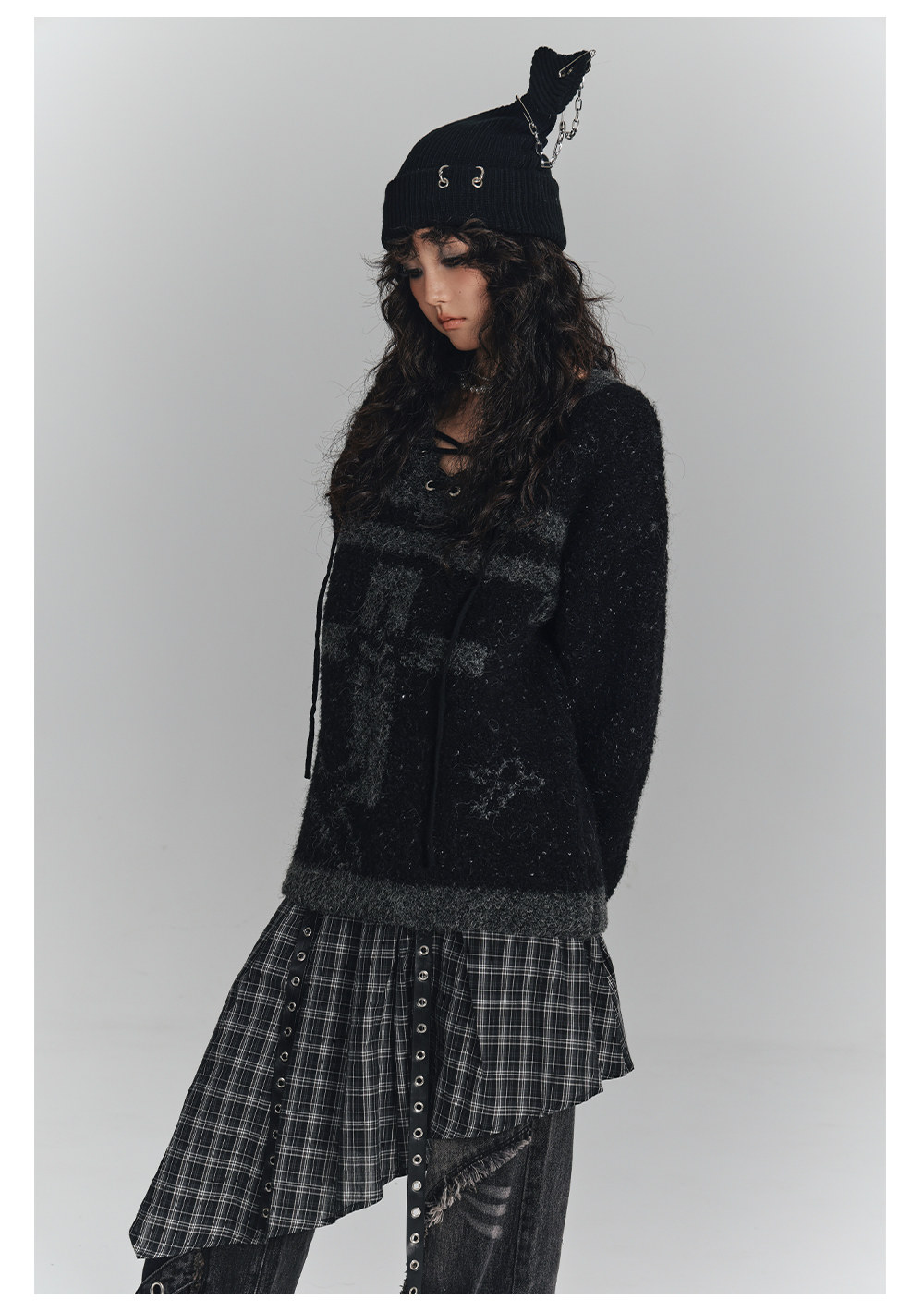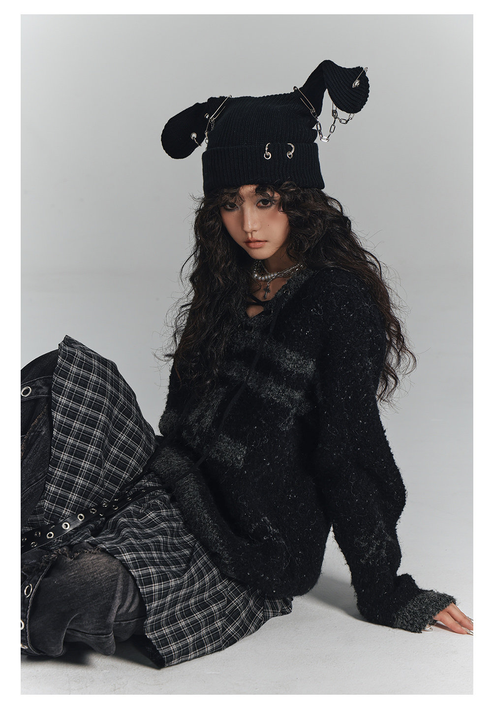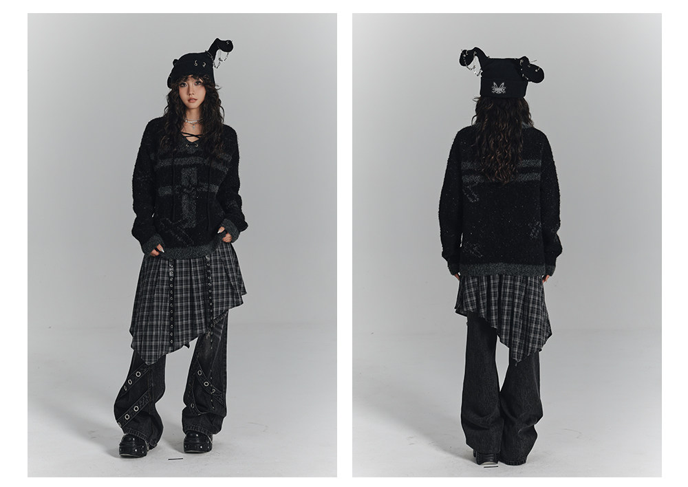 Cross Detail Drawstring Oversize V-Neck Knit Sweater NA8890