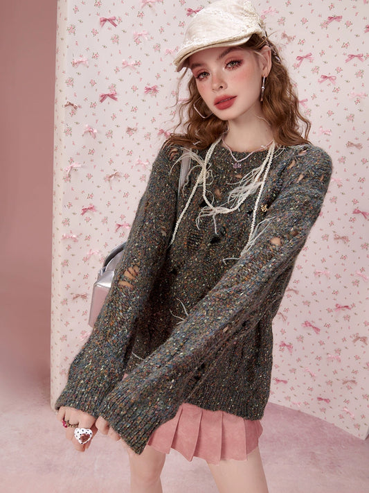 Embroidery Off-Shoulder Fringe Hem Oversize Knit Sweater NA6803