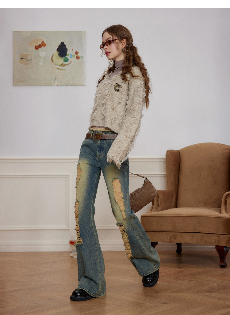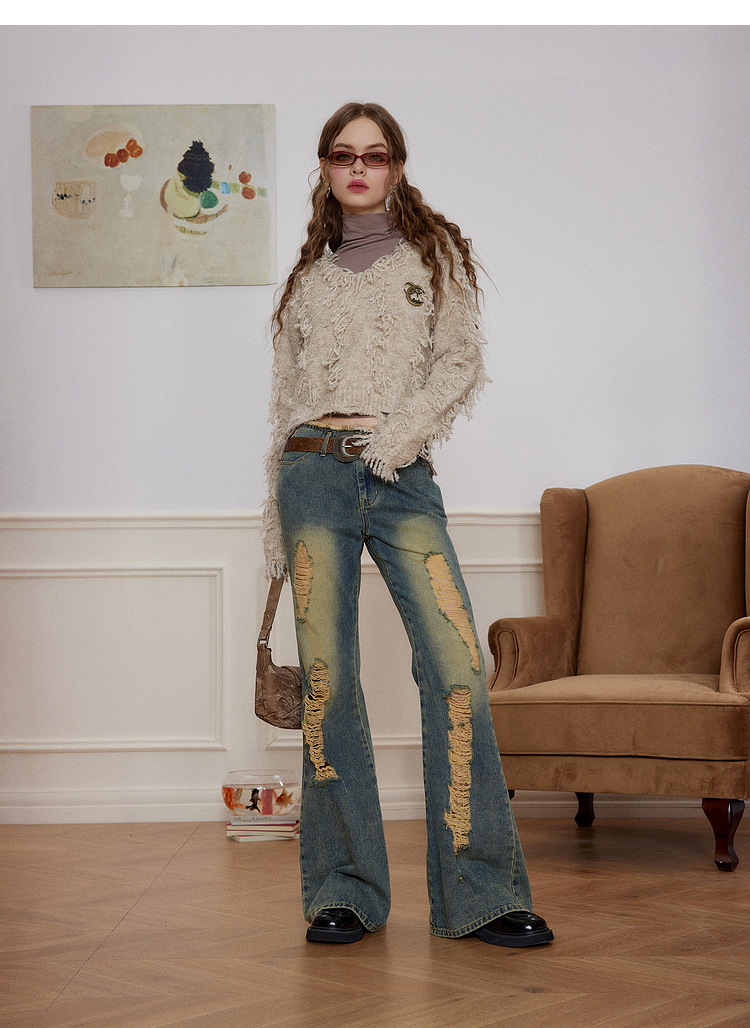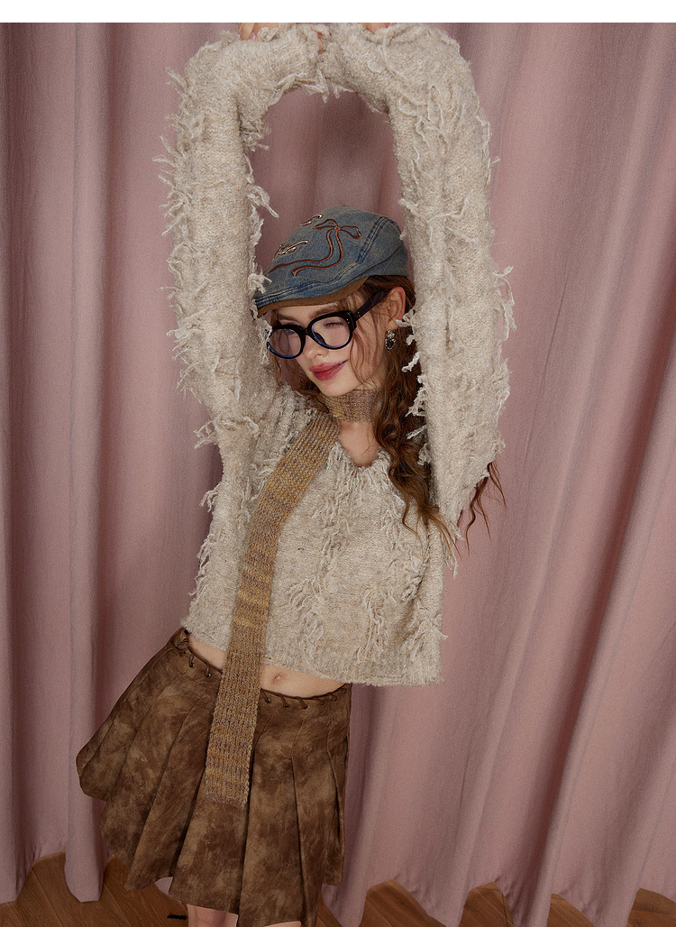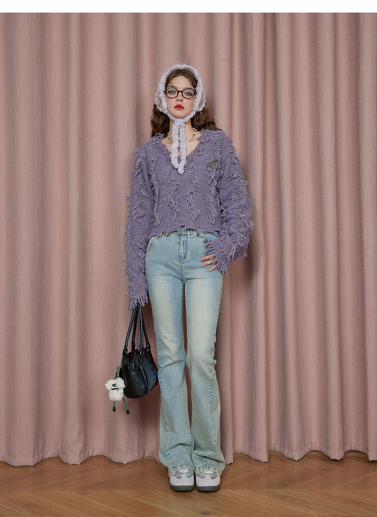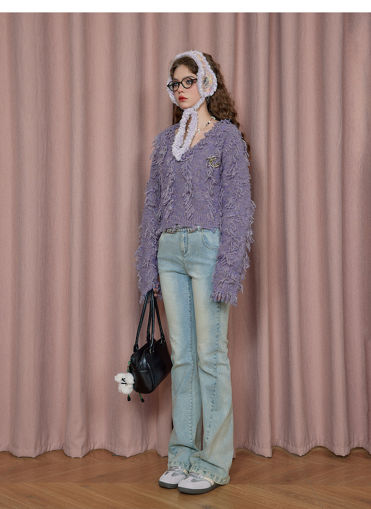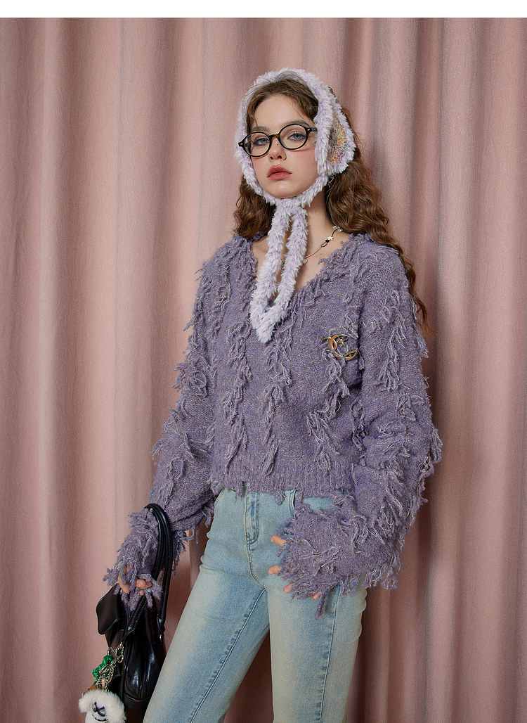 V-Neck Fringe Hem Oversize Knit Sweater NA6872