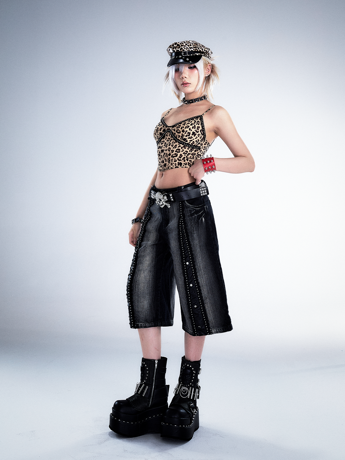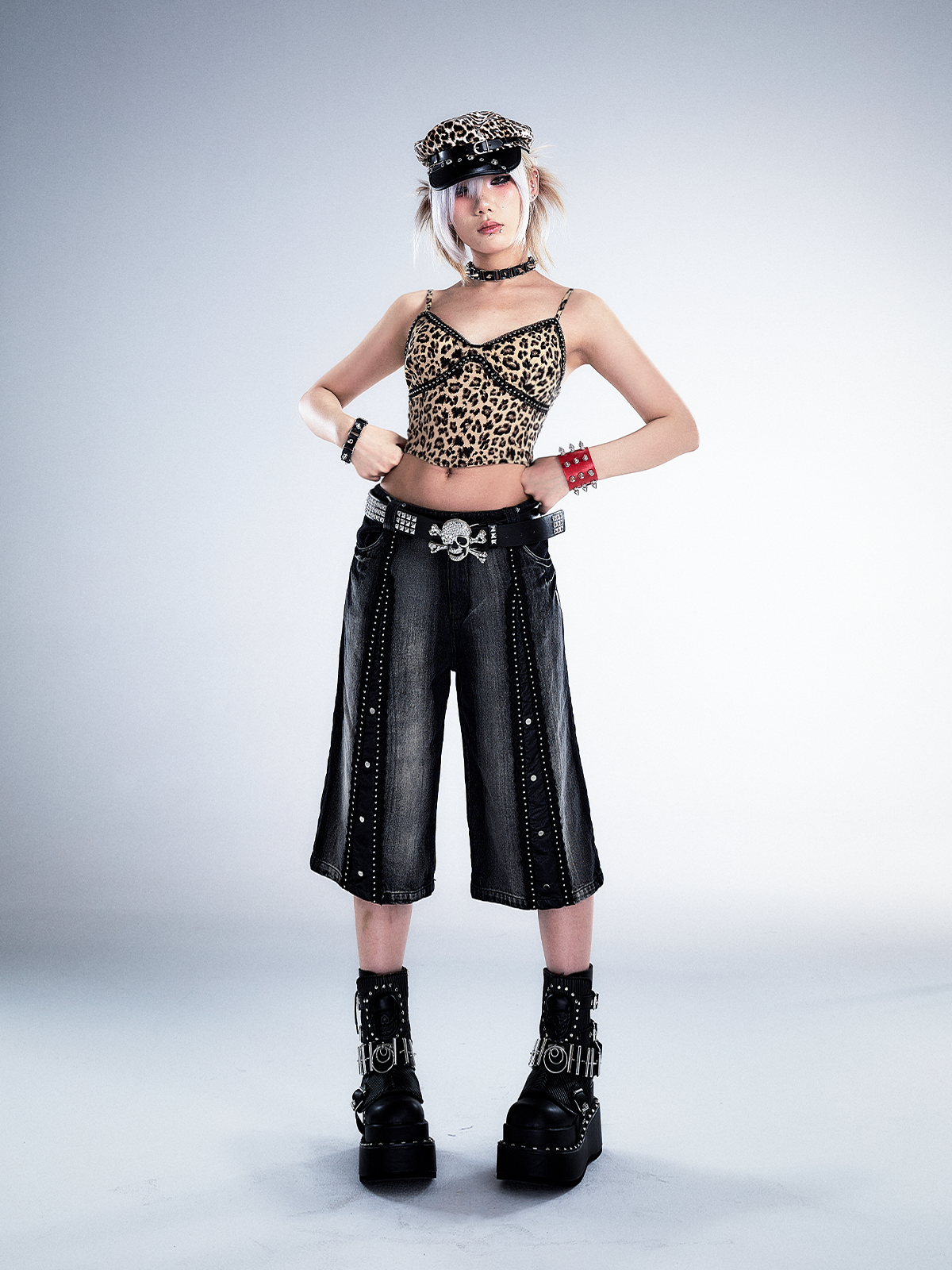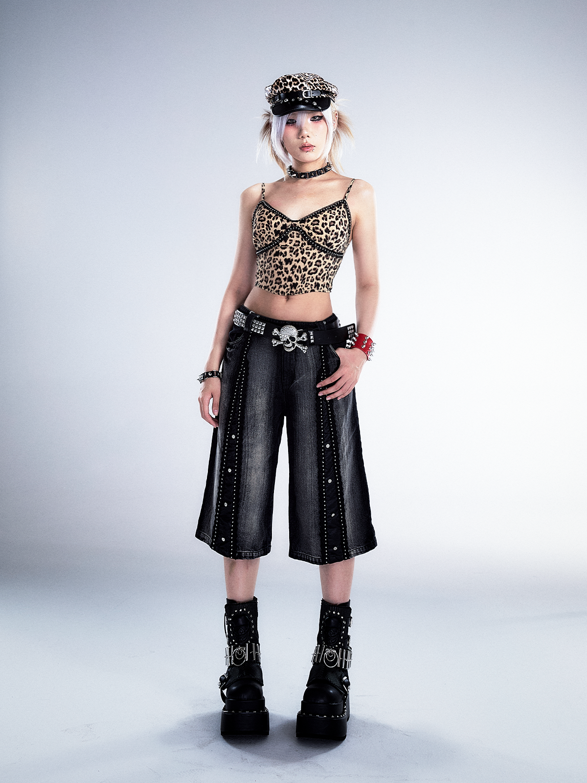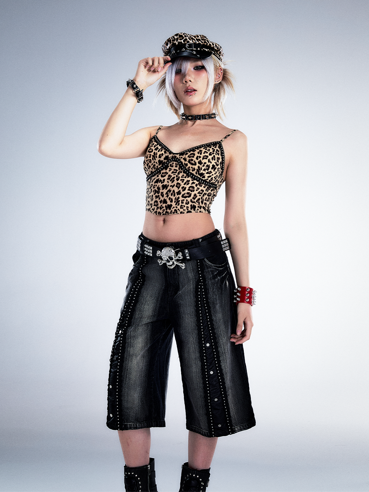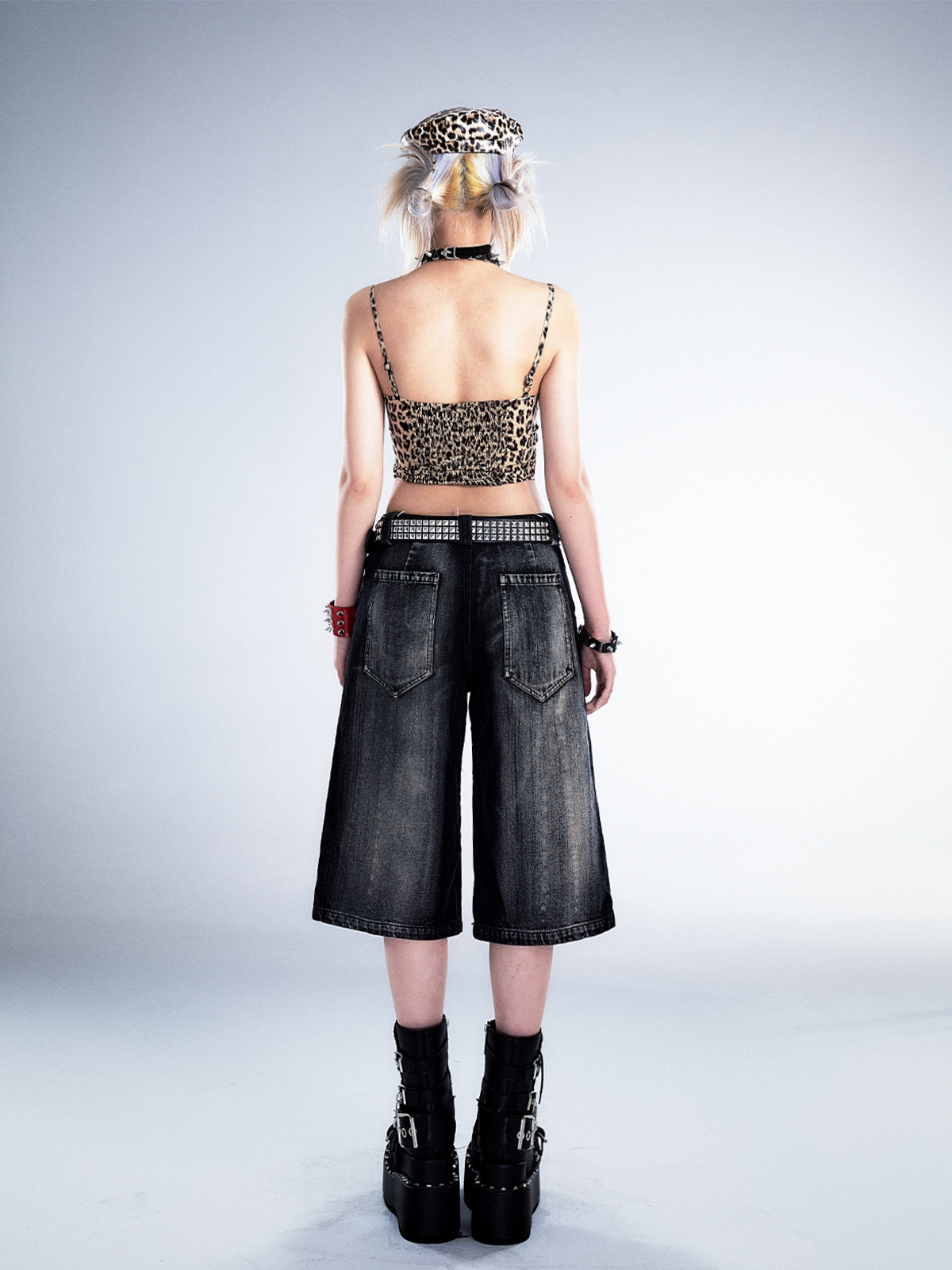 Studs Patchwork Washed Wide-Leg Cropped Denim Jeans NA8124