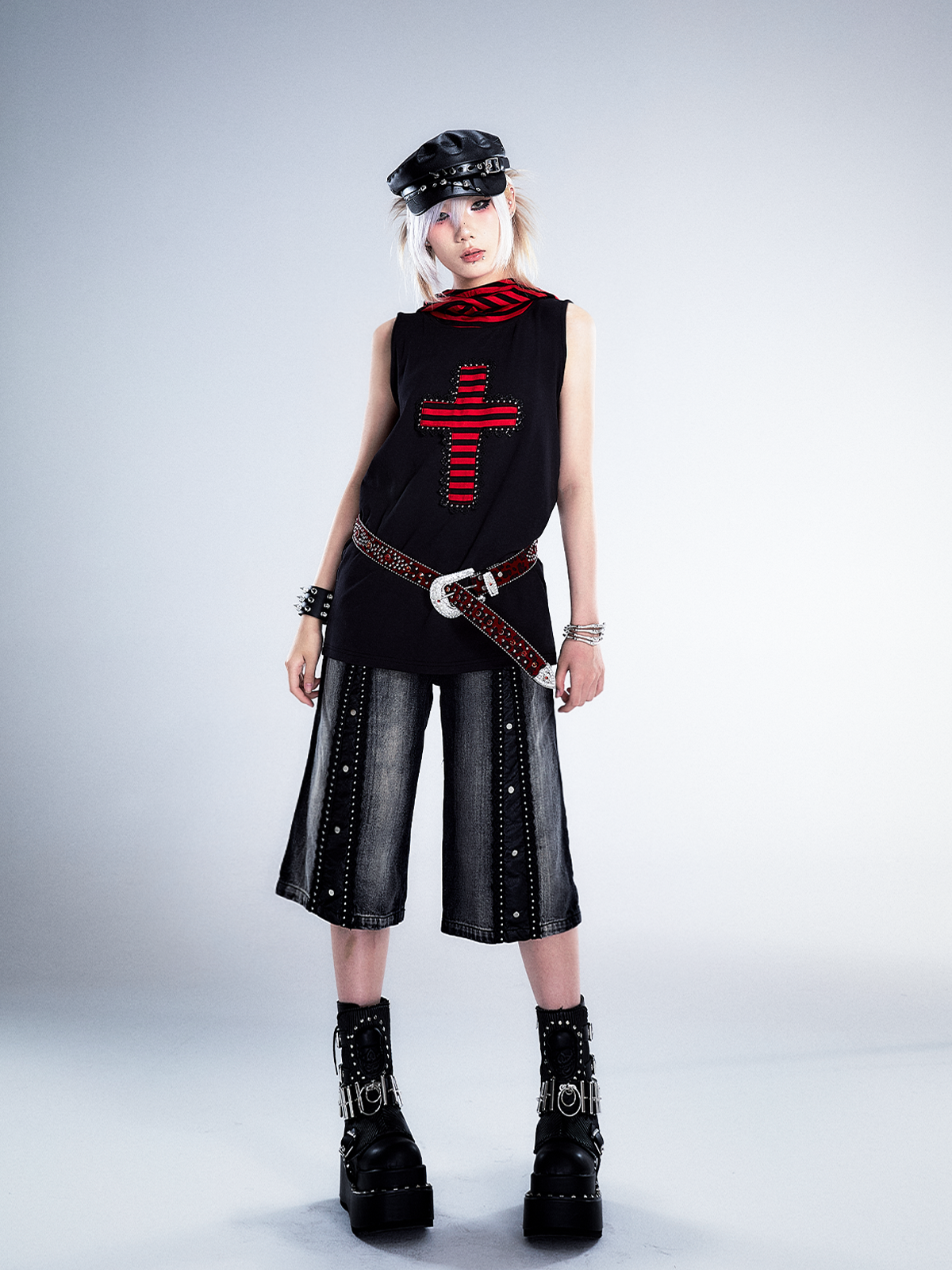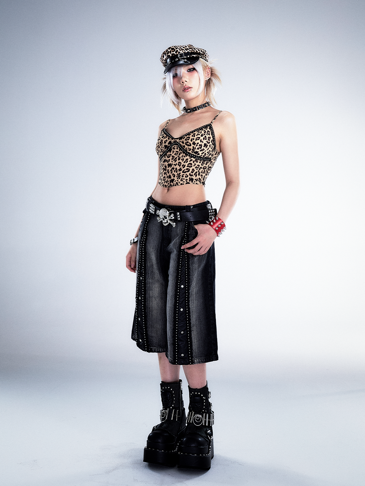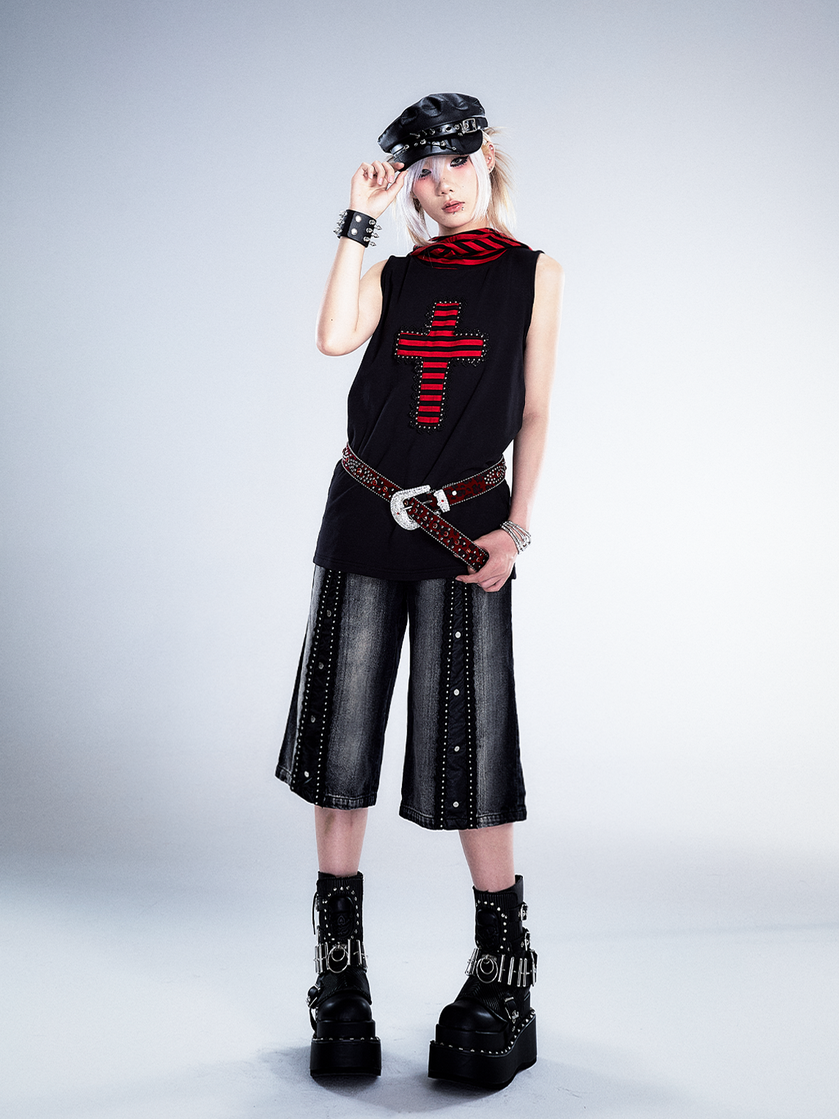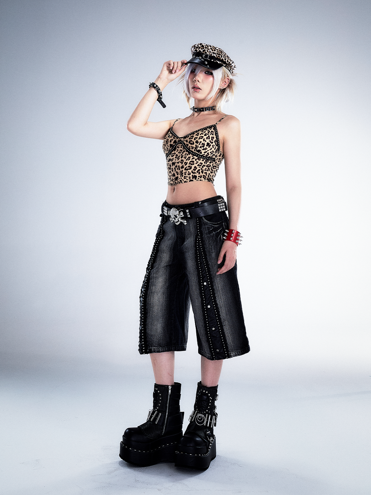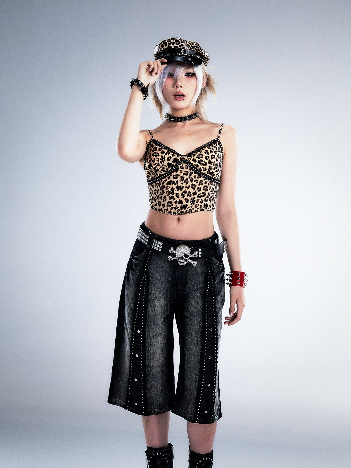 Studs Patchwork Washed Wide-Leg Cropped Denim Jeans NA8124