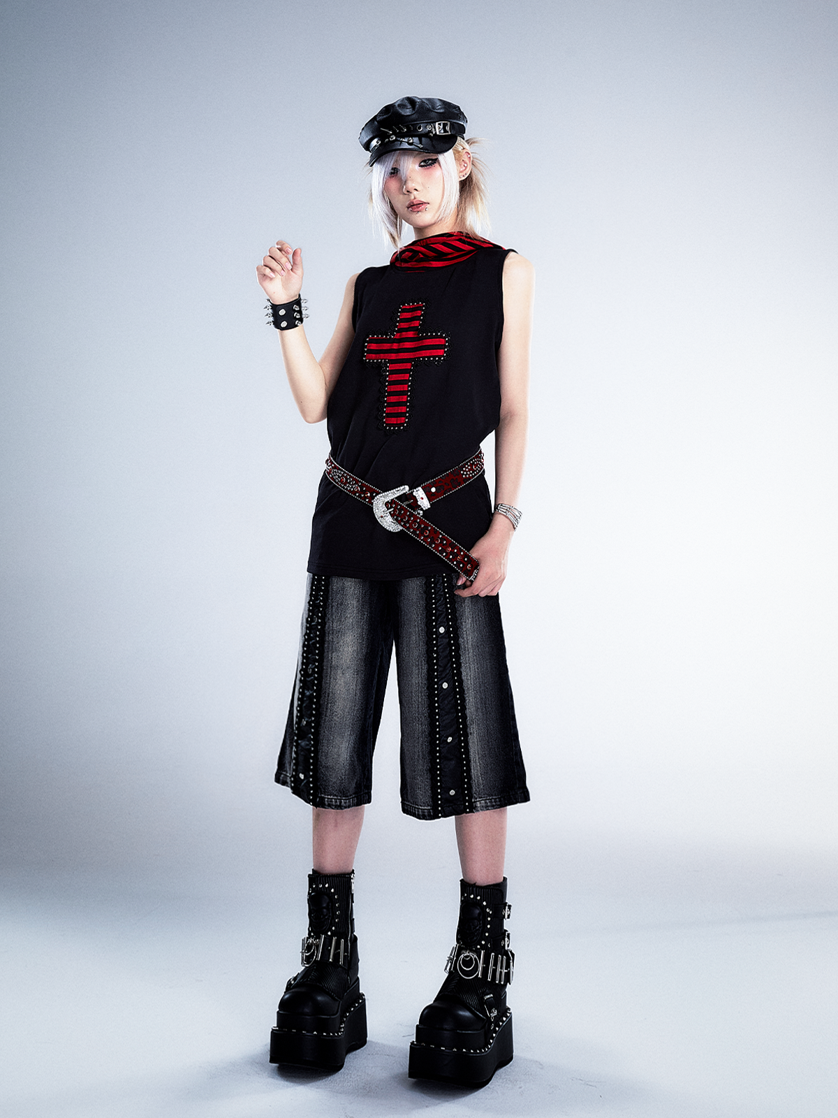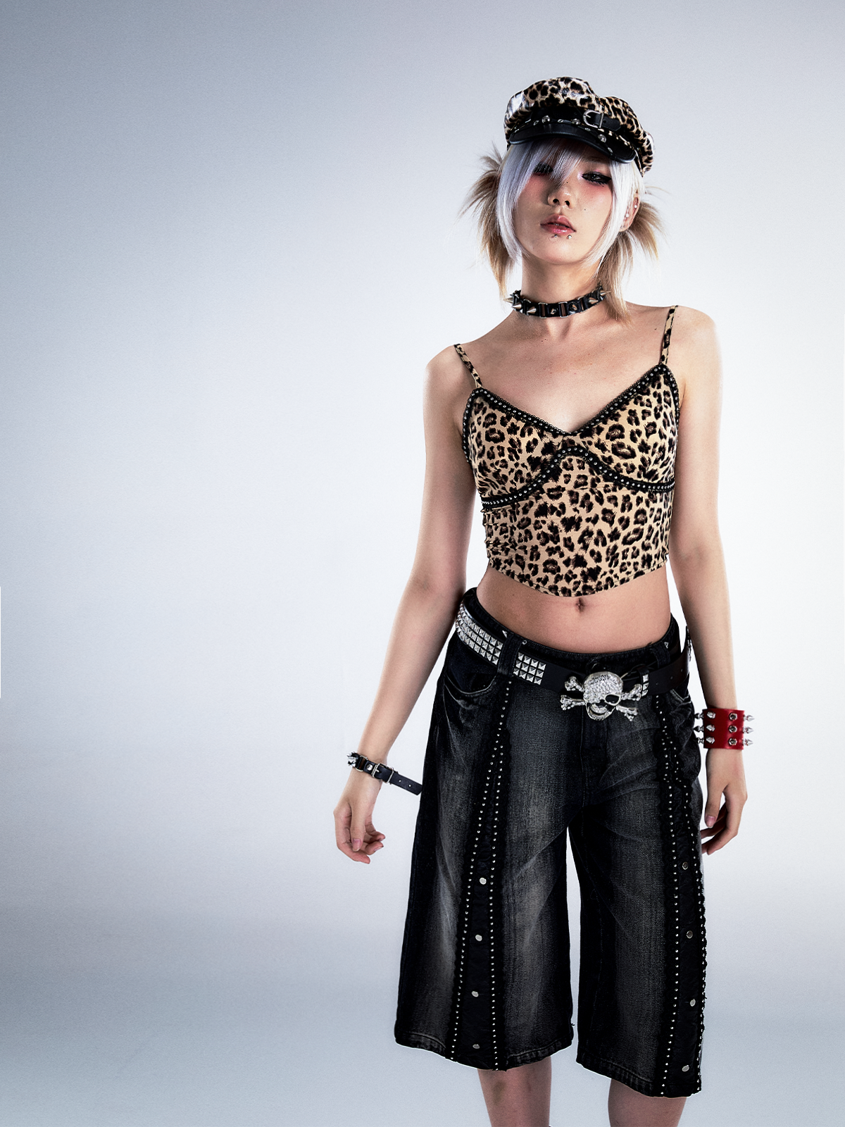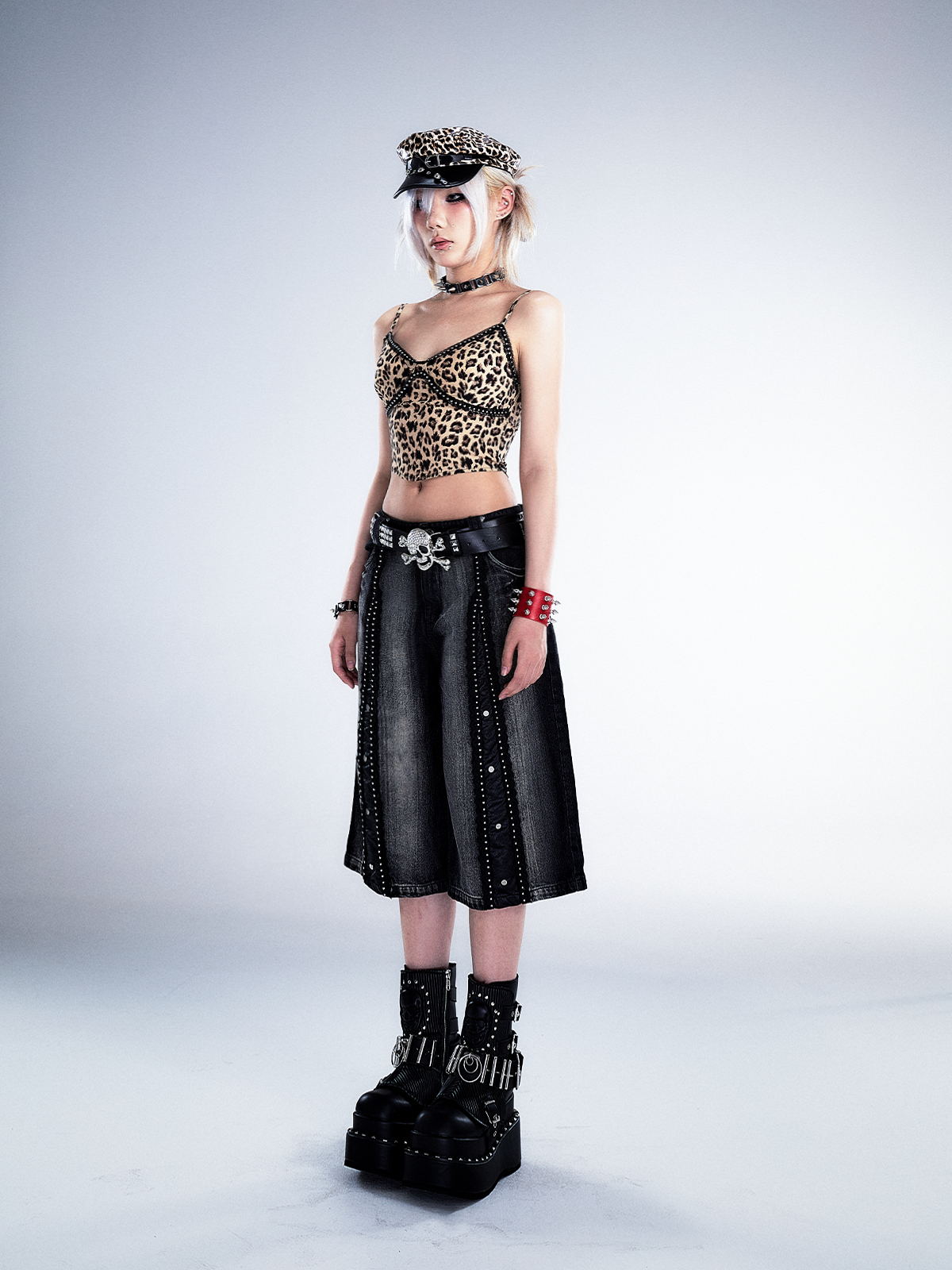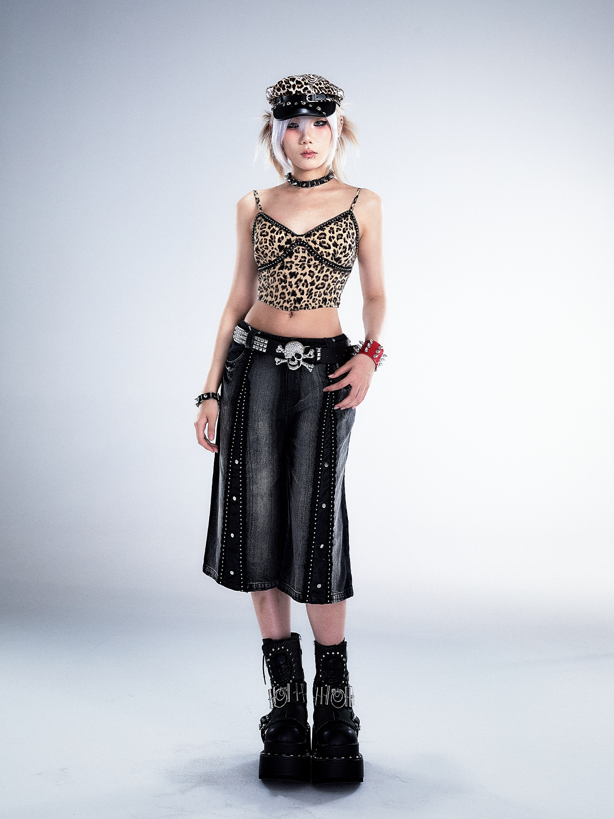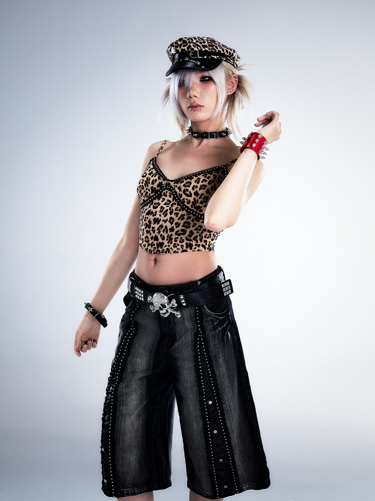 Studs Patchwork Washed Wide-Leg Cropped Denim Jeans NA8124
