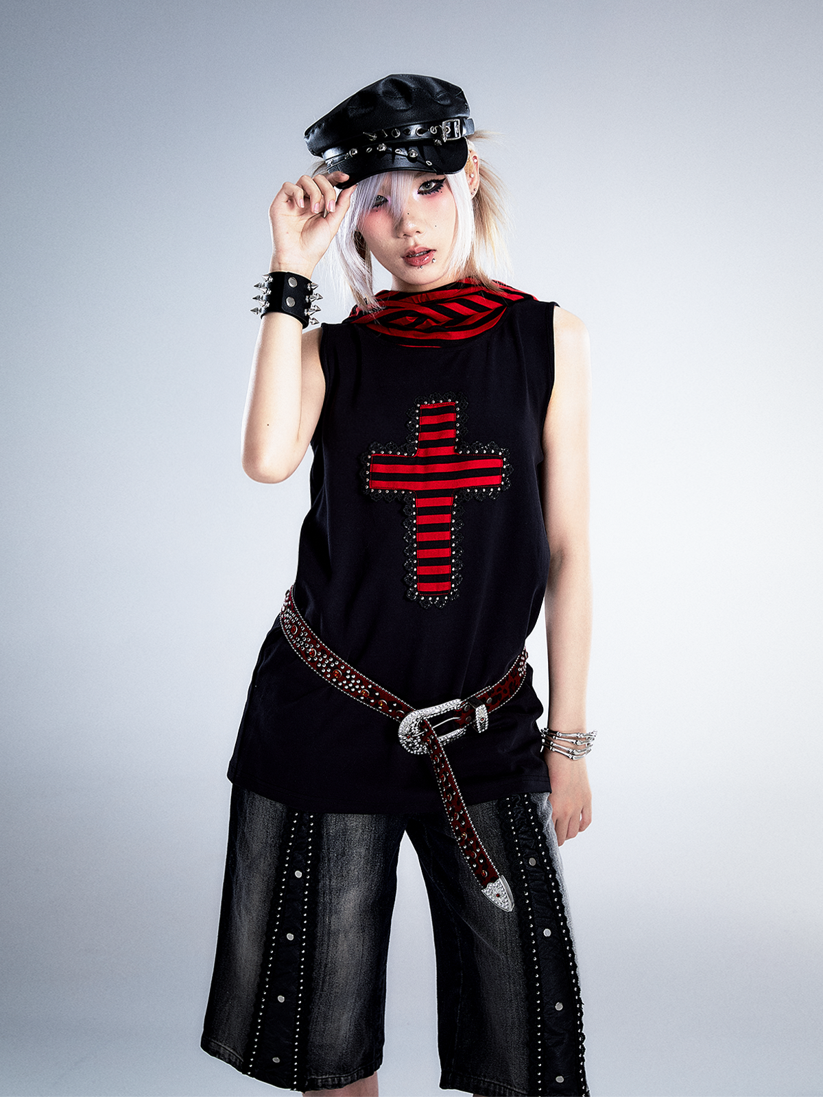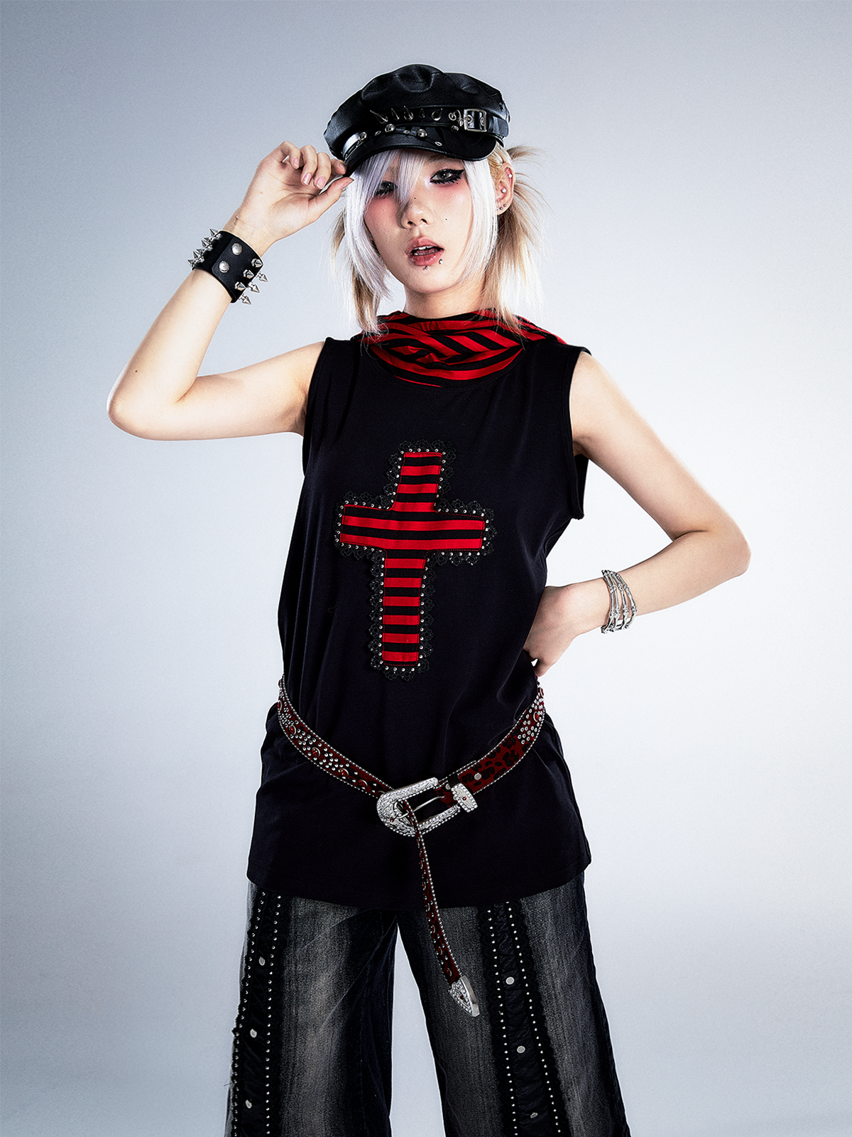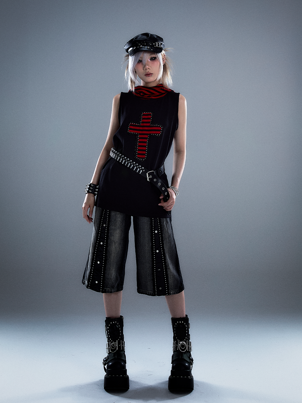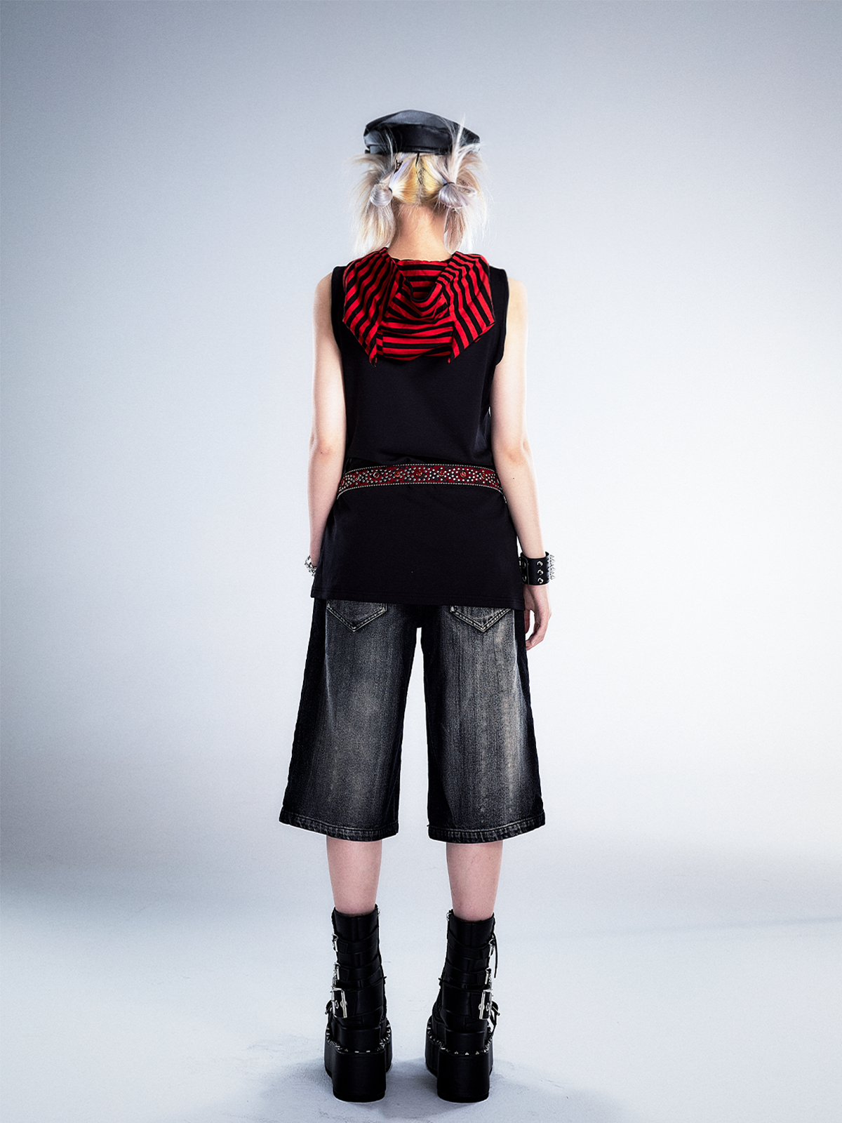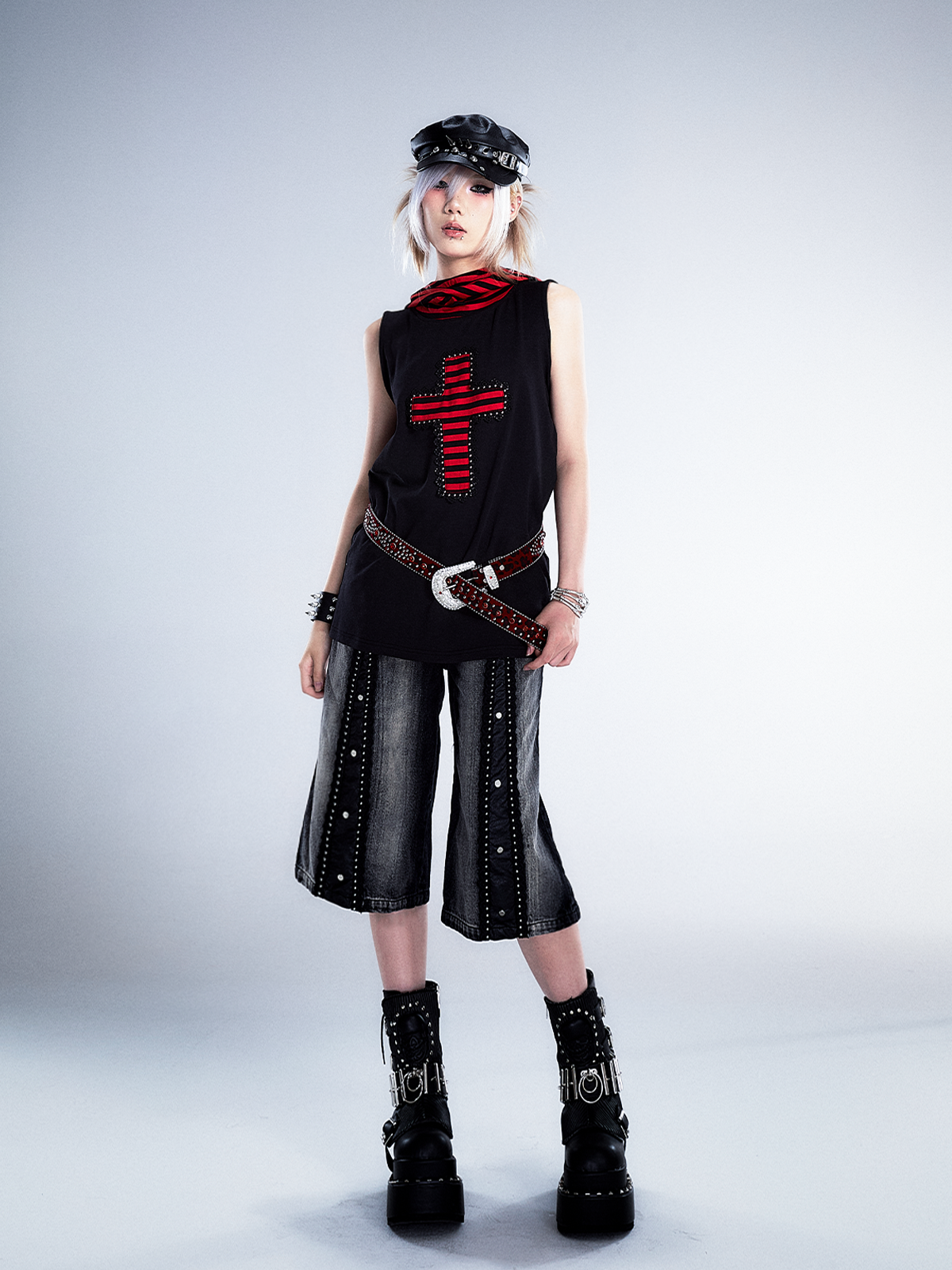 Studs Patchwork Washed Wide-Leg Cropped Denim Jeans NA8124
