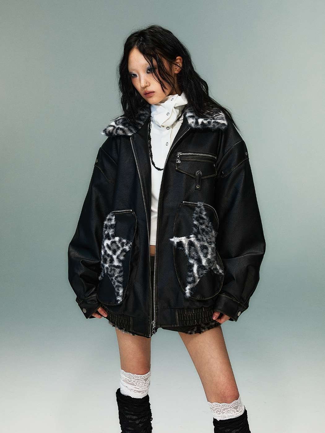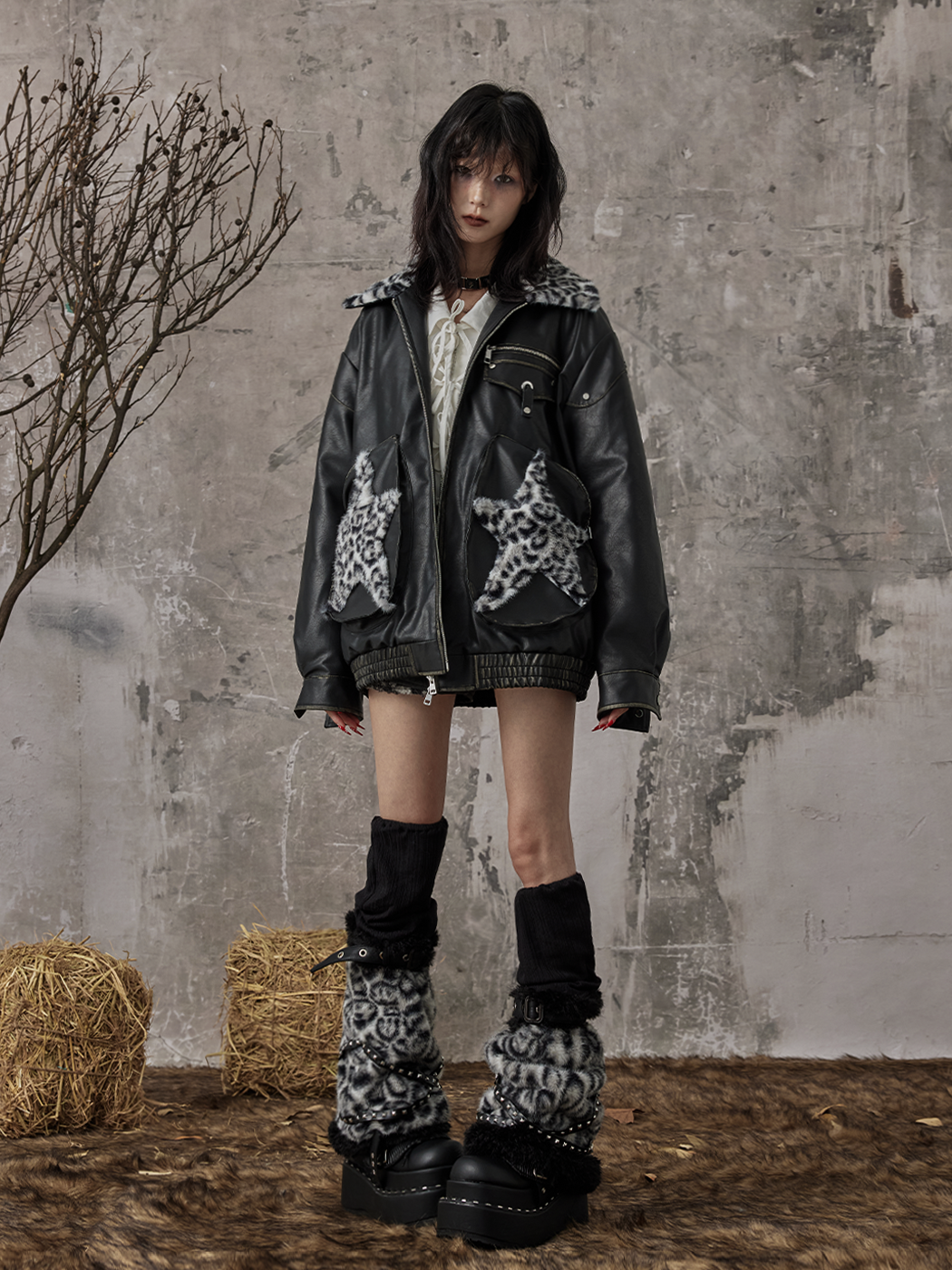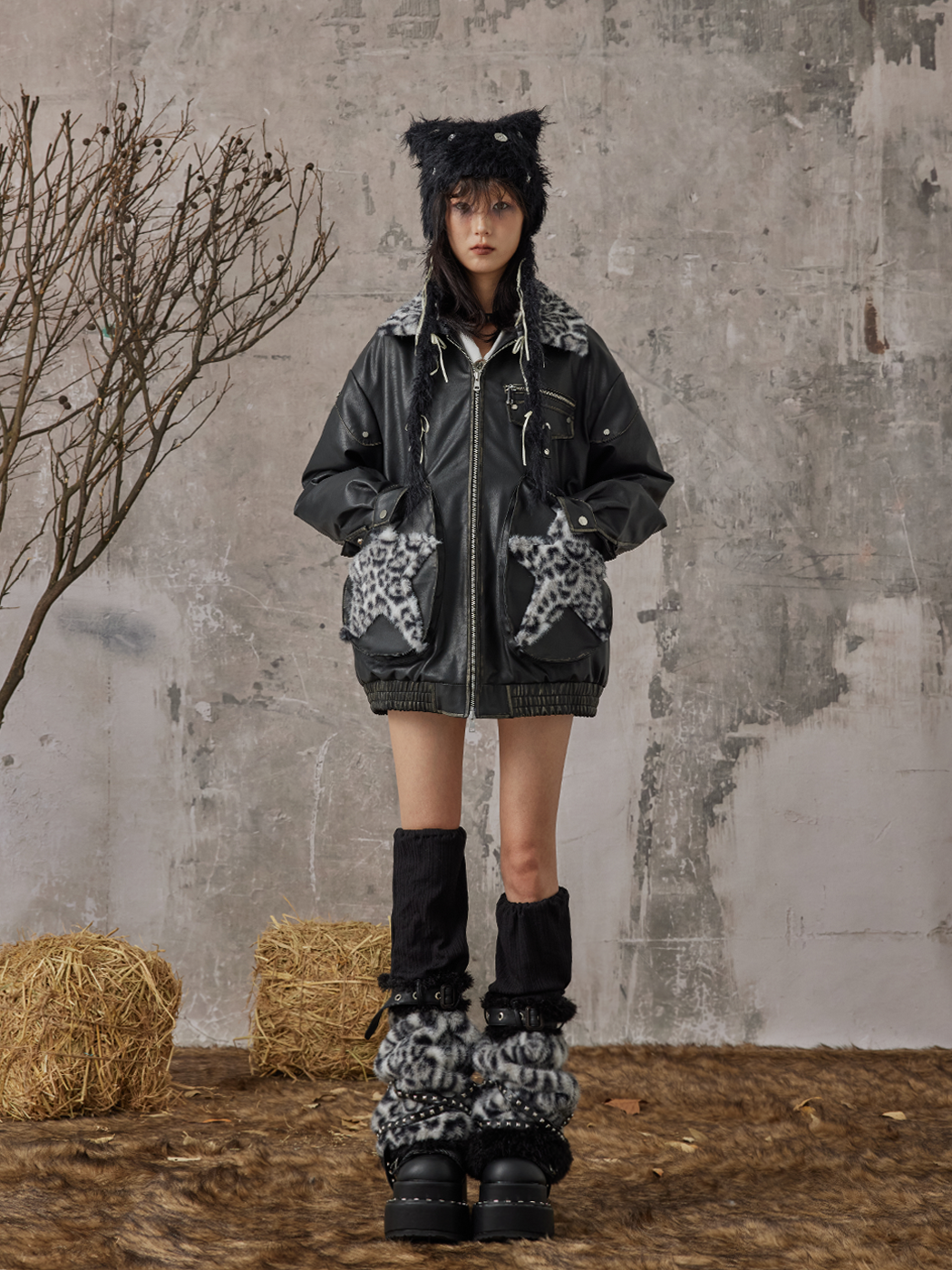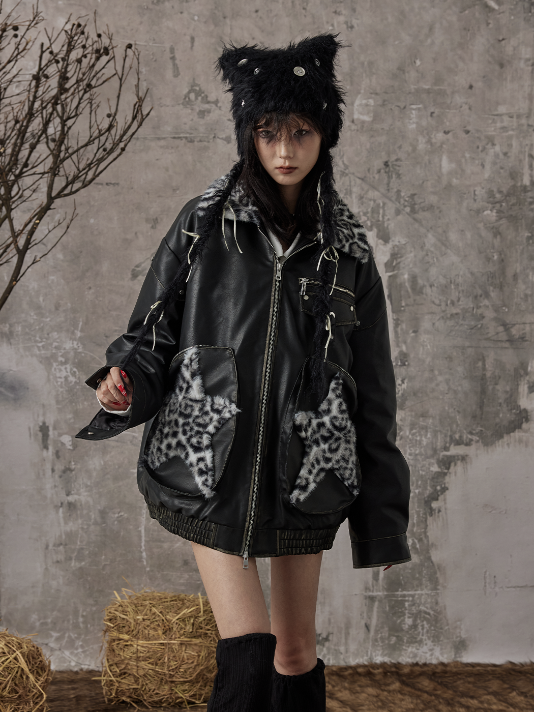 Leopard Star Patchwork Thickened PU Leather Jacket NA8140