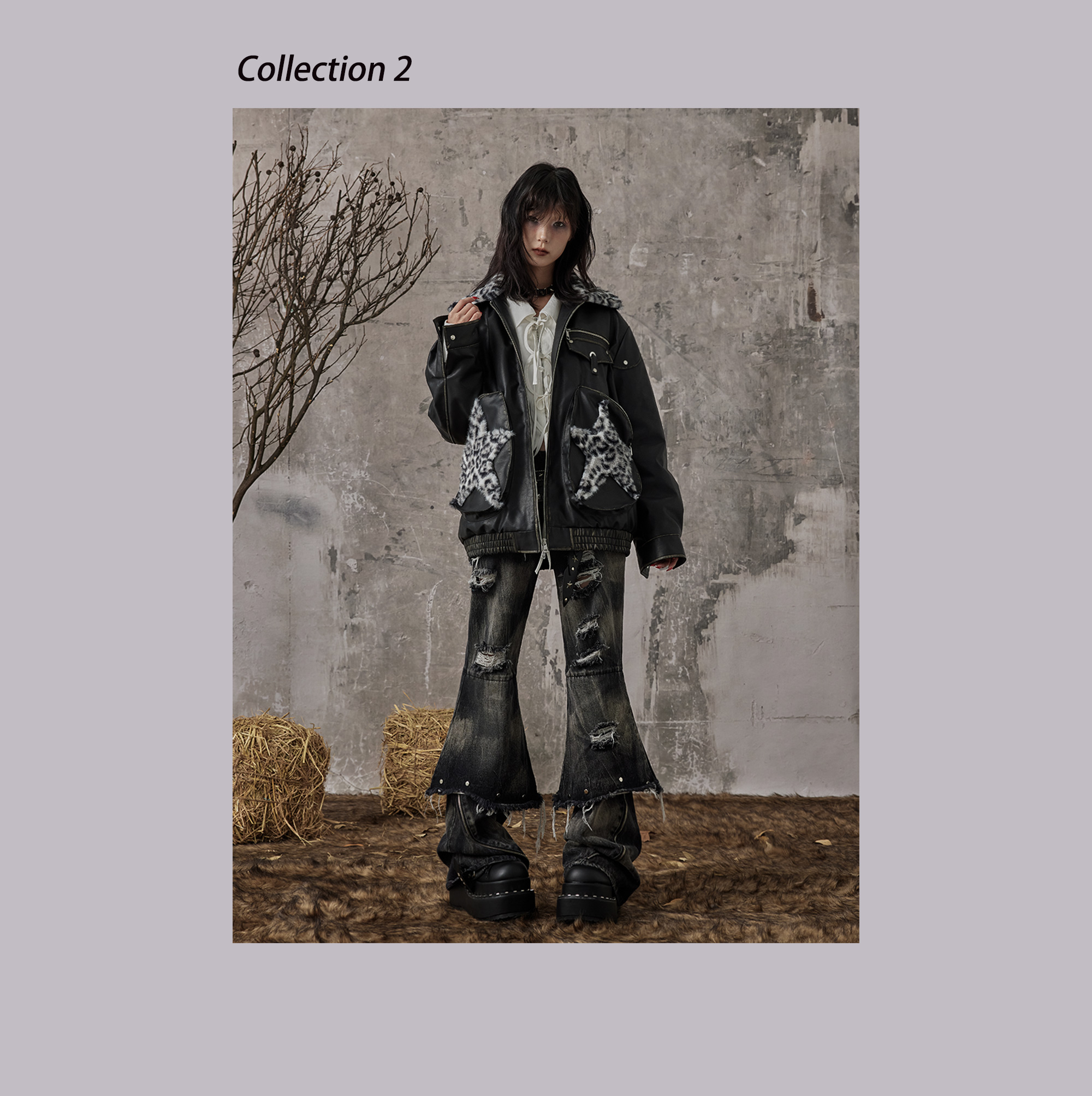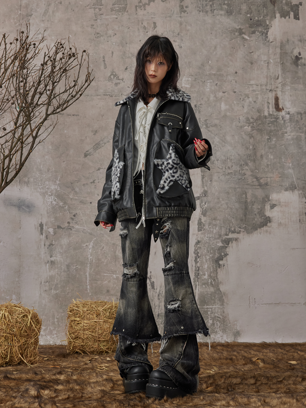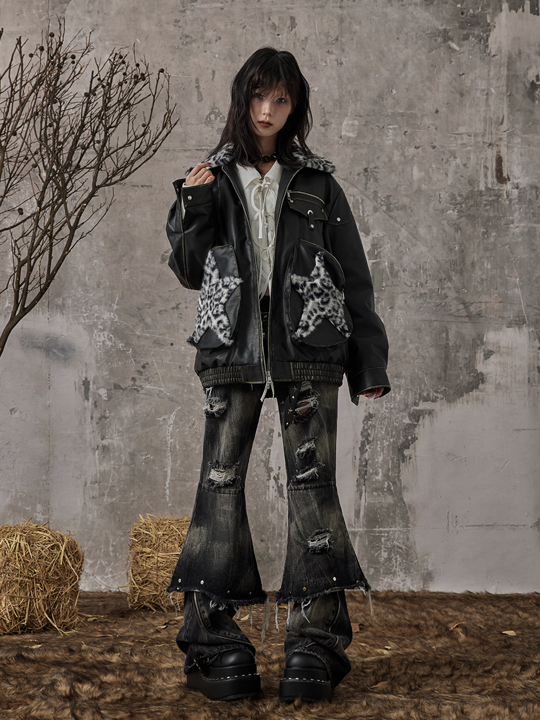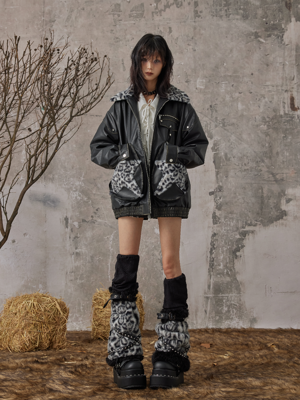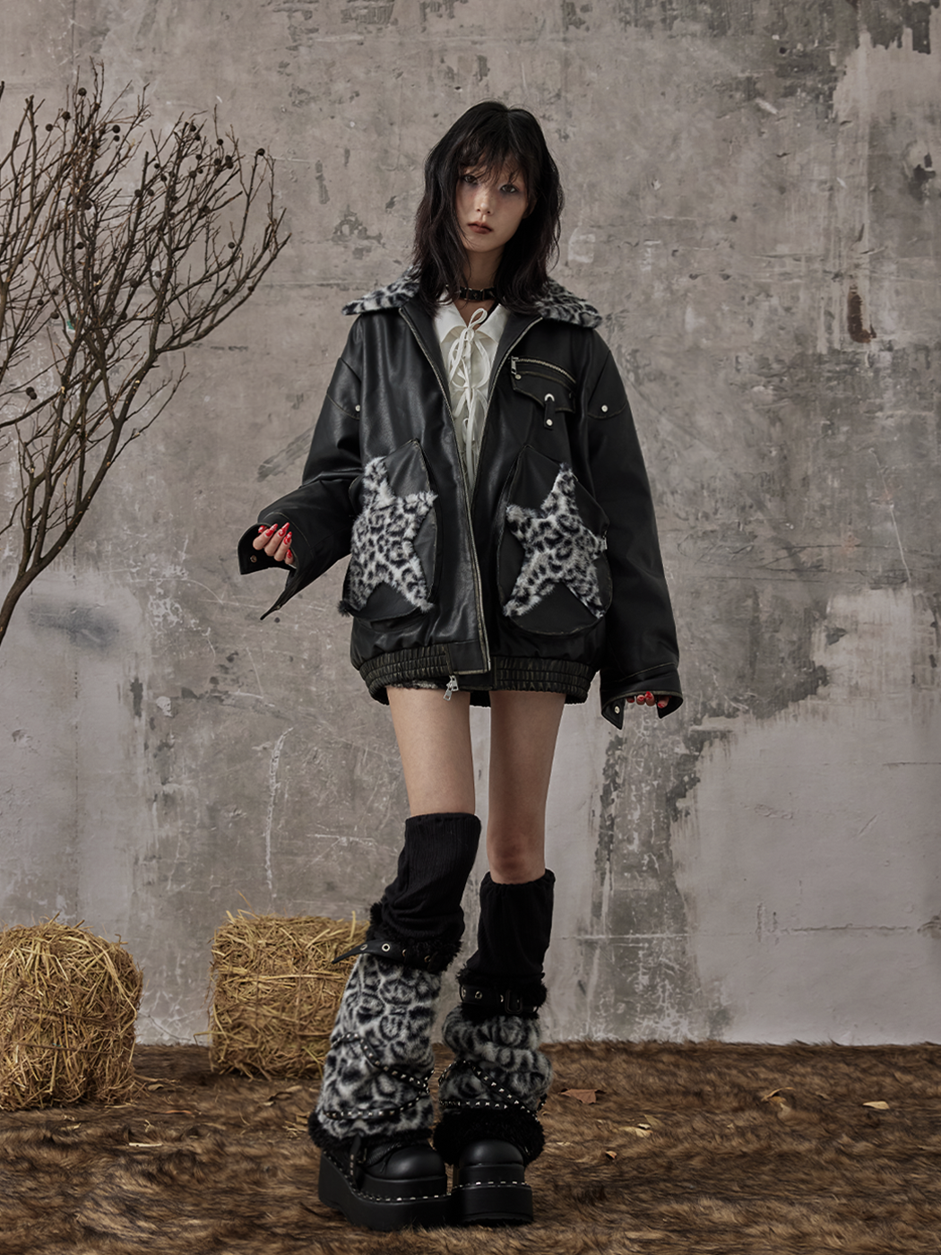 Leopard Star Patchwork Thickened PU Leather Jacket NA8140