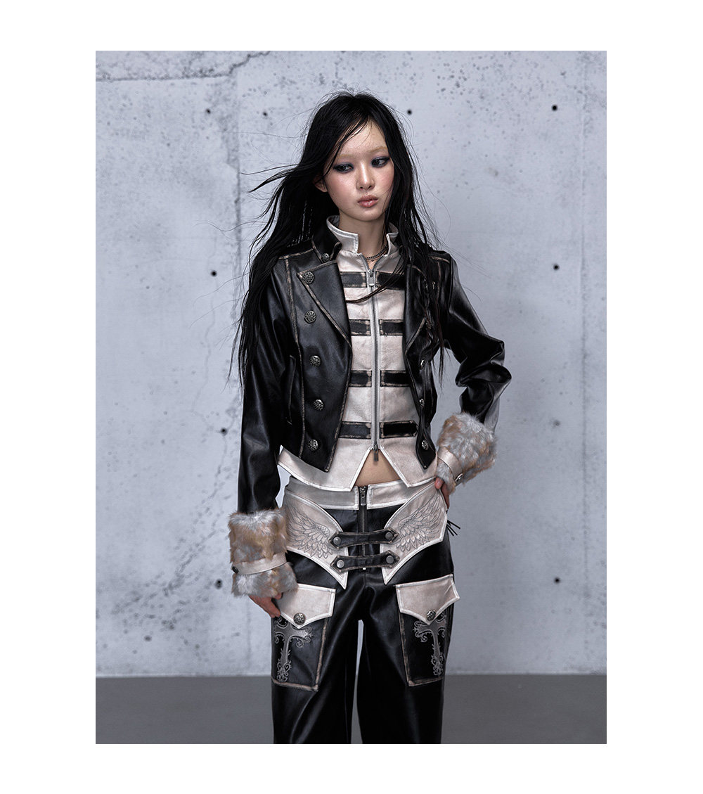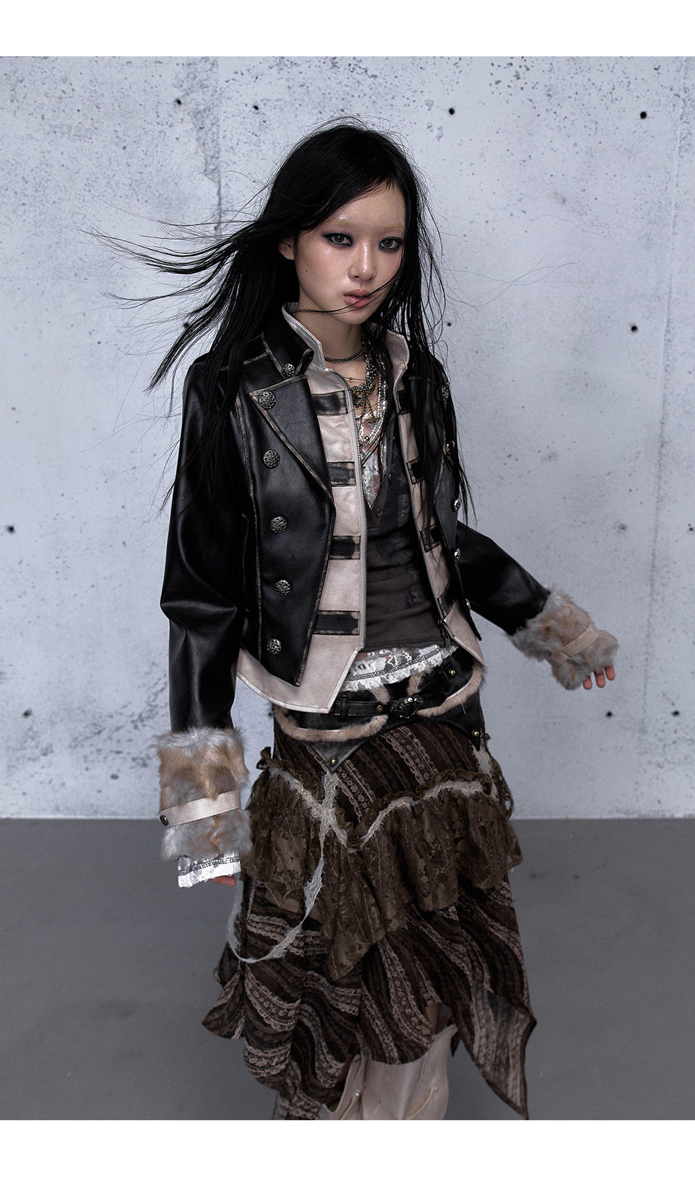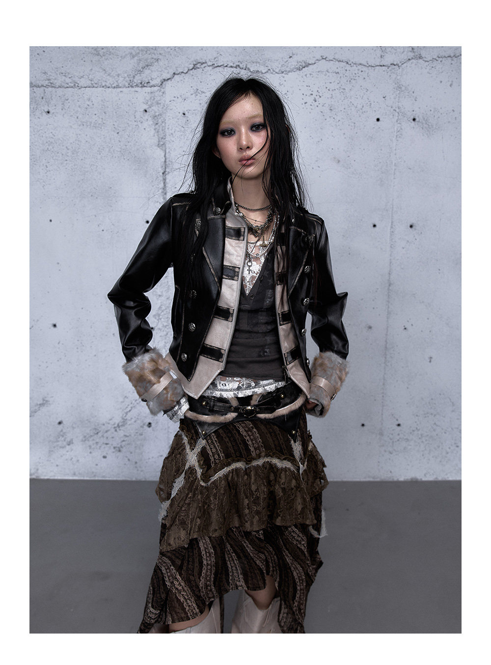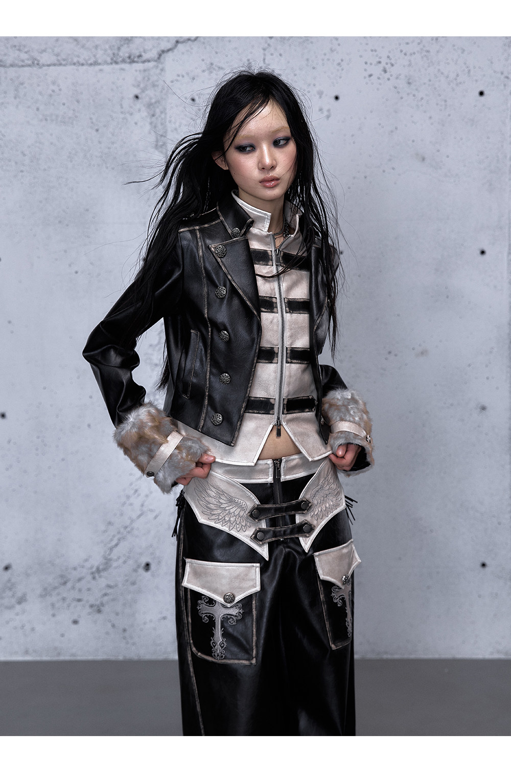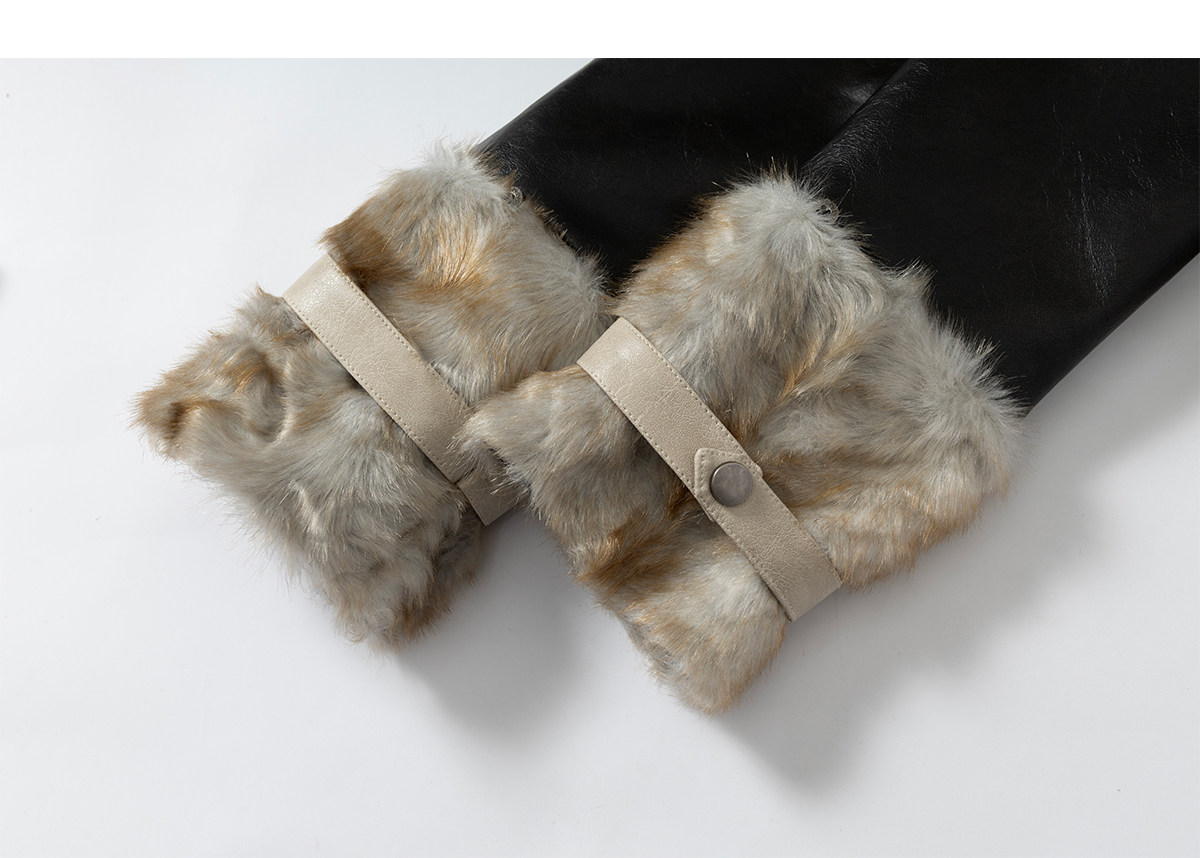Standing-Collar Belt Detail Fake Fur Cuff PU Leather Jacket NA8980