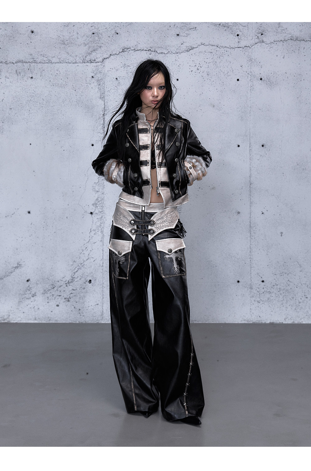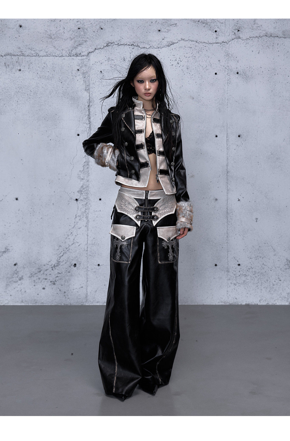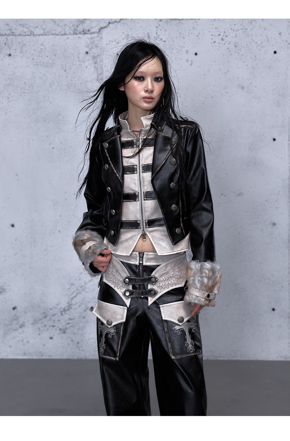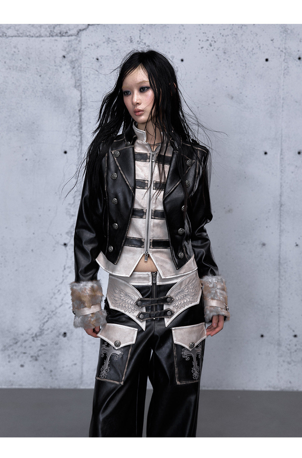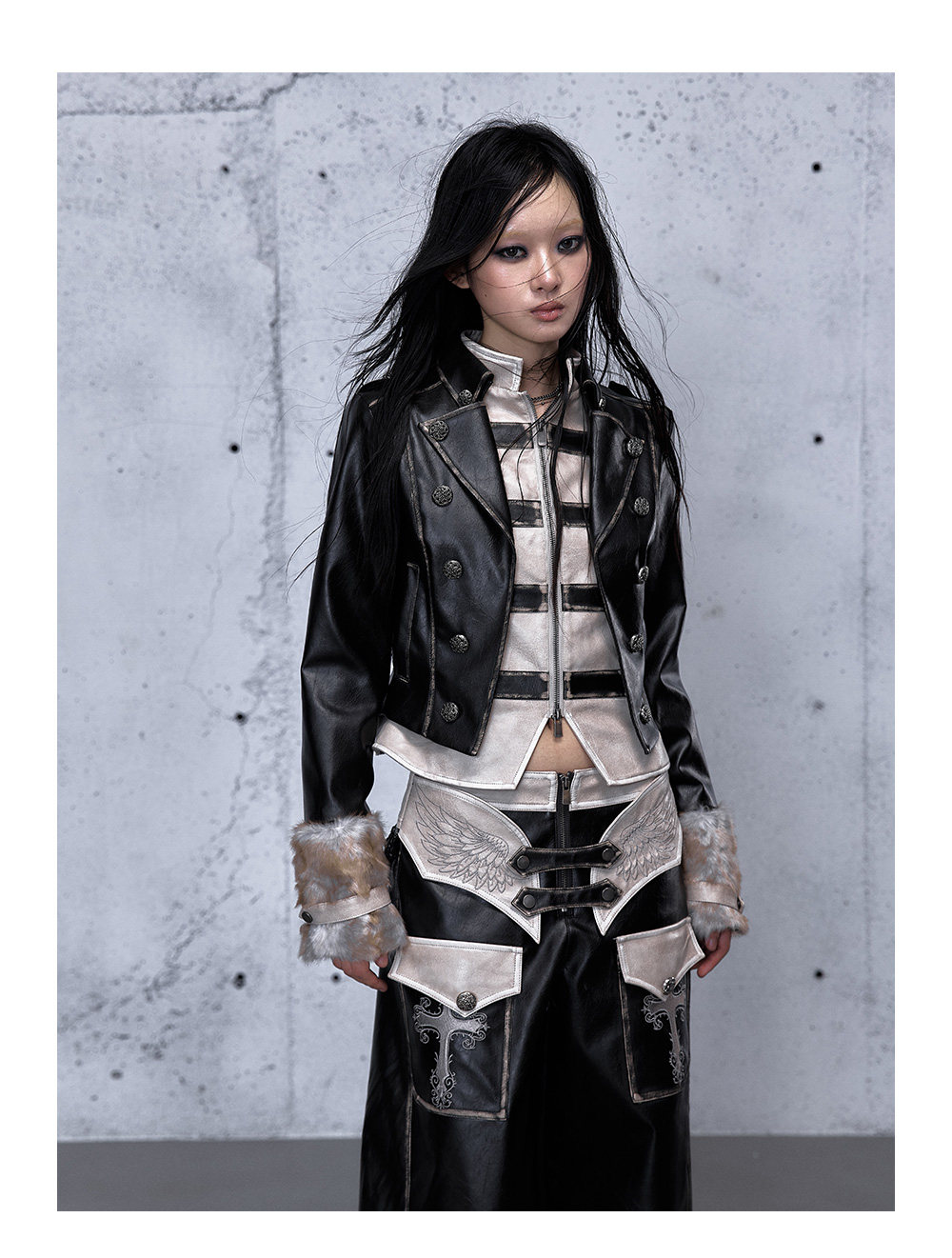 Standing-Collar Belt Detail Fake Fur Cuff PU Leather Jacket NA8980