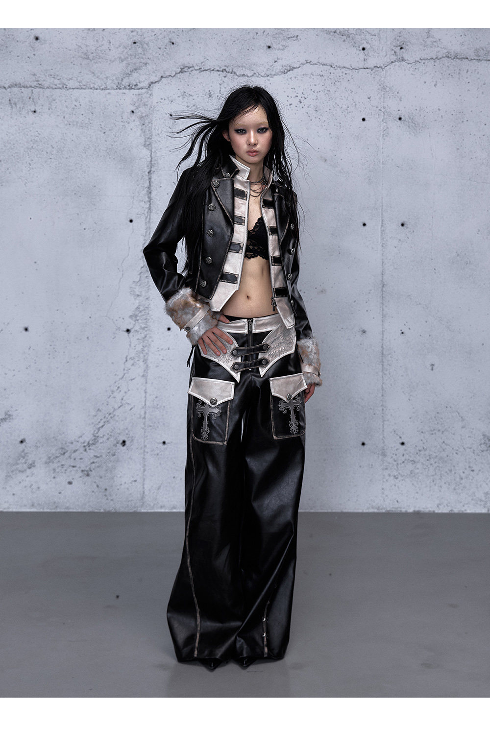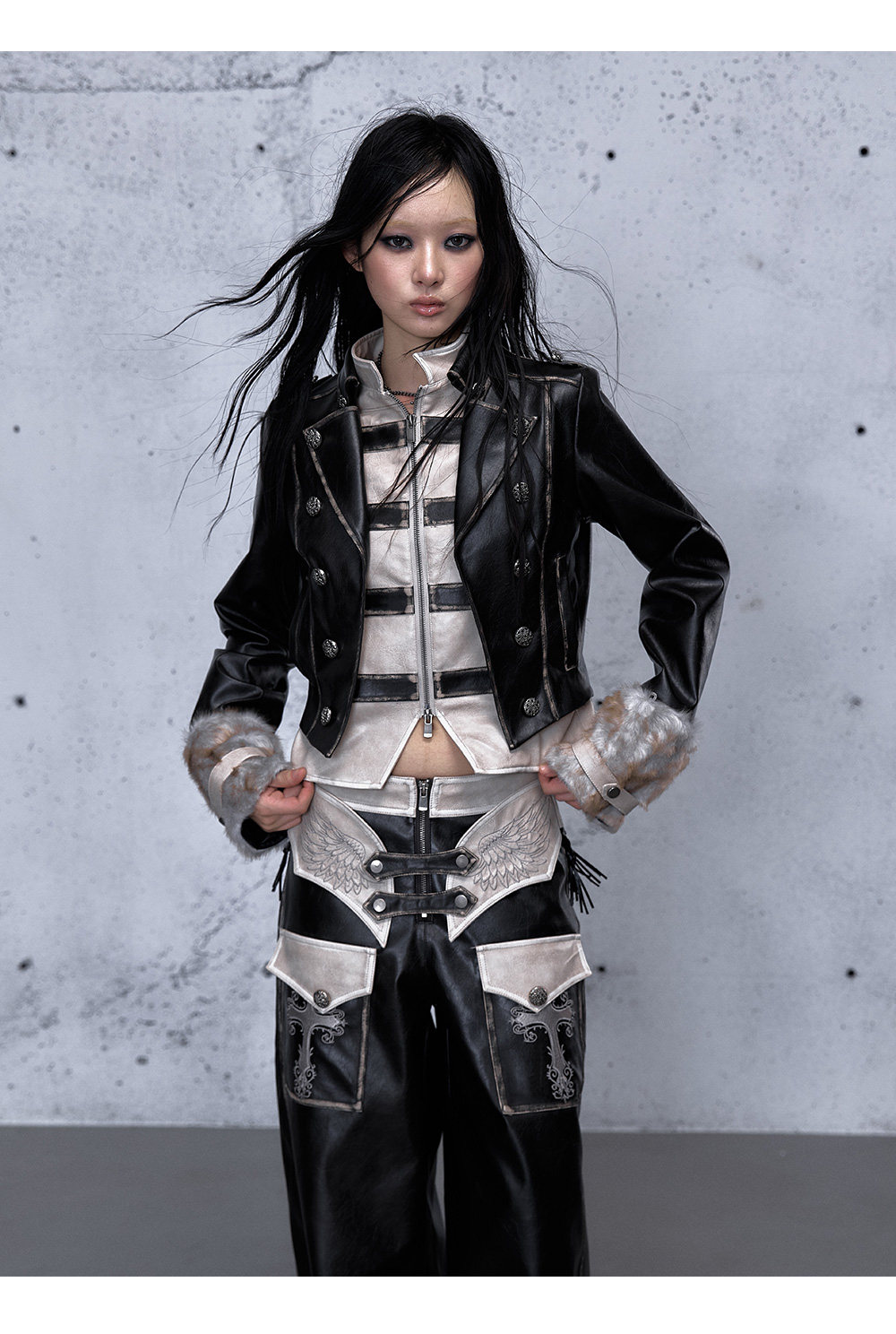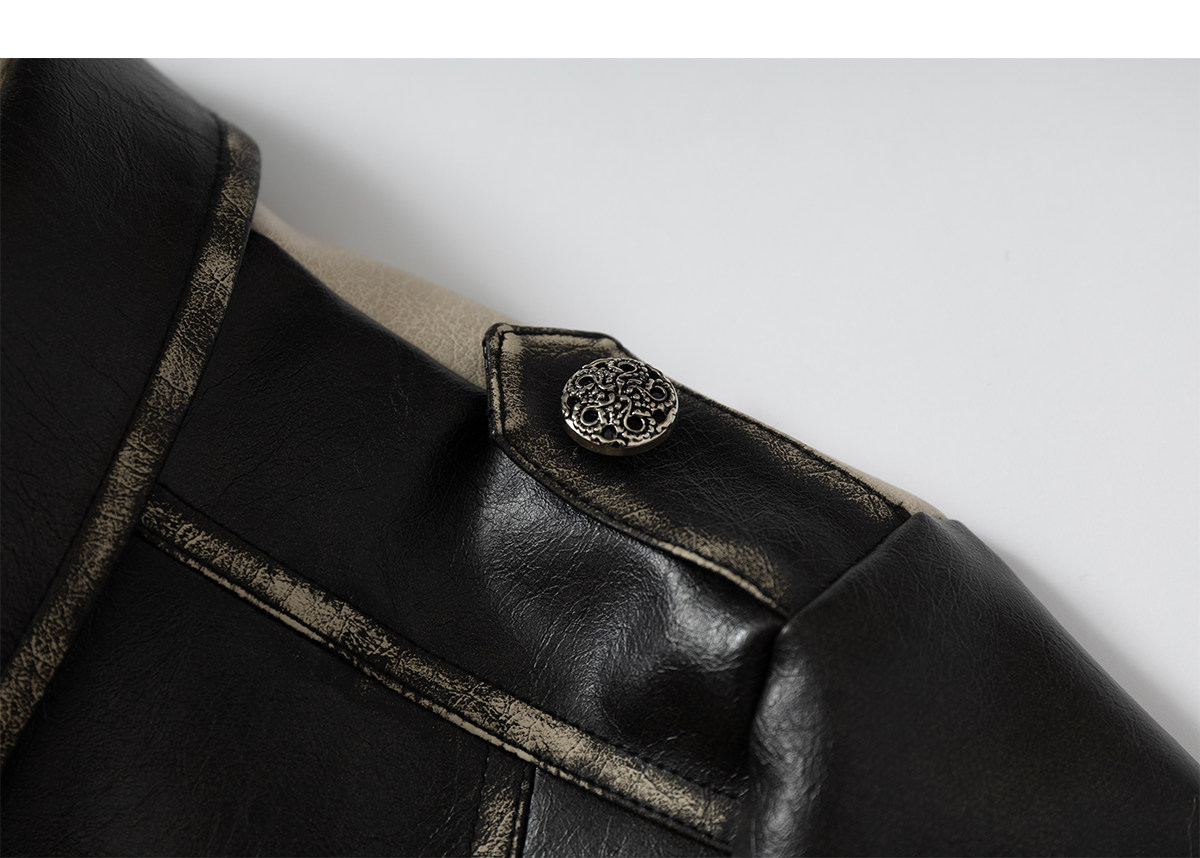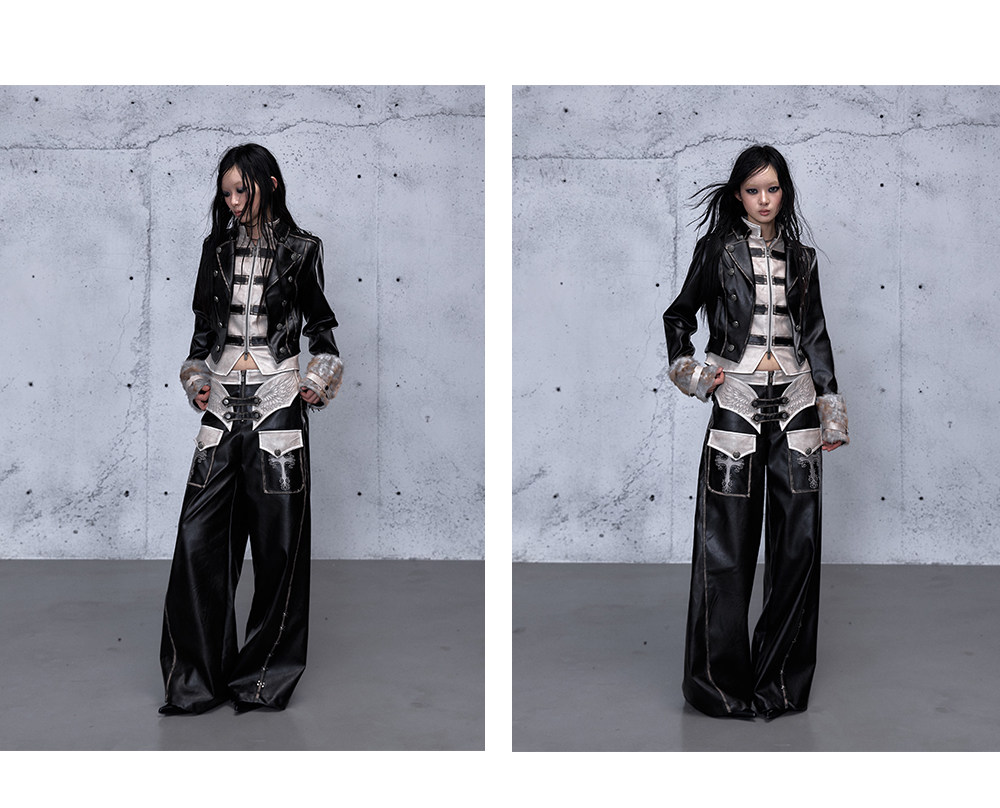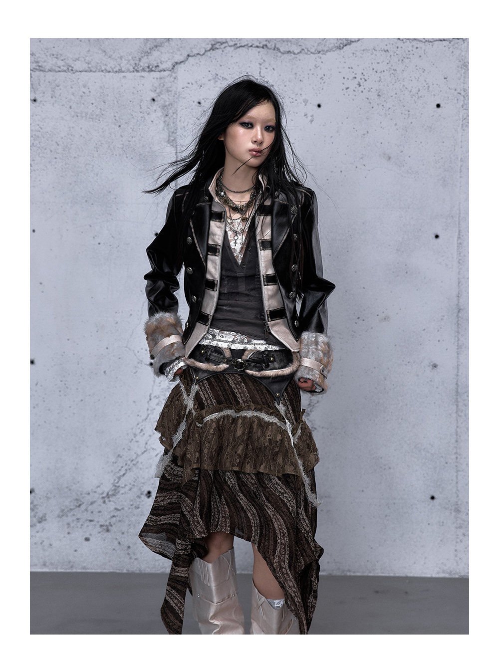 Standing-Collar Belt Detail Fake Fur Cuff PU Leather Jacket NA8980
