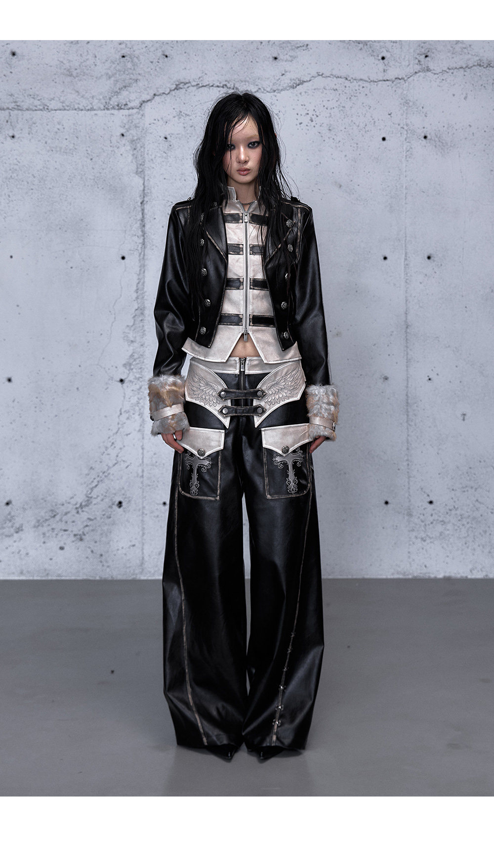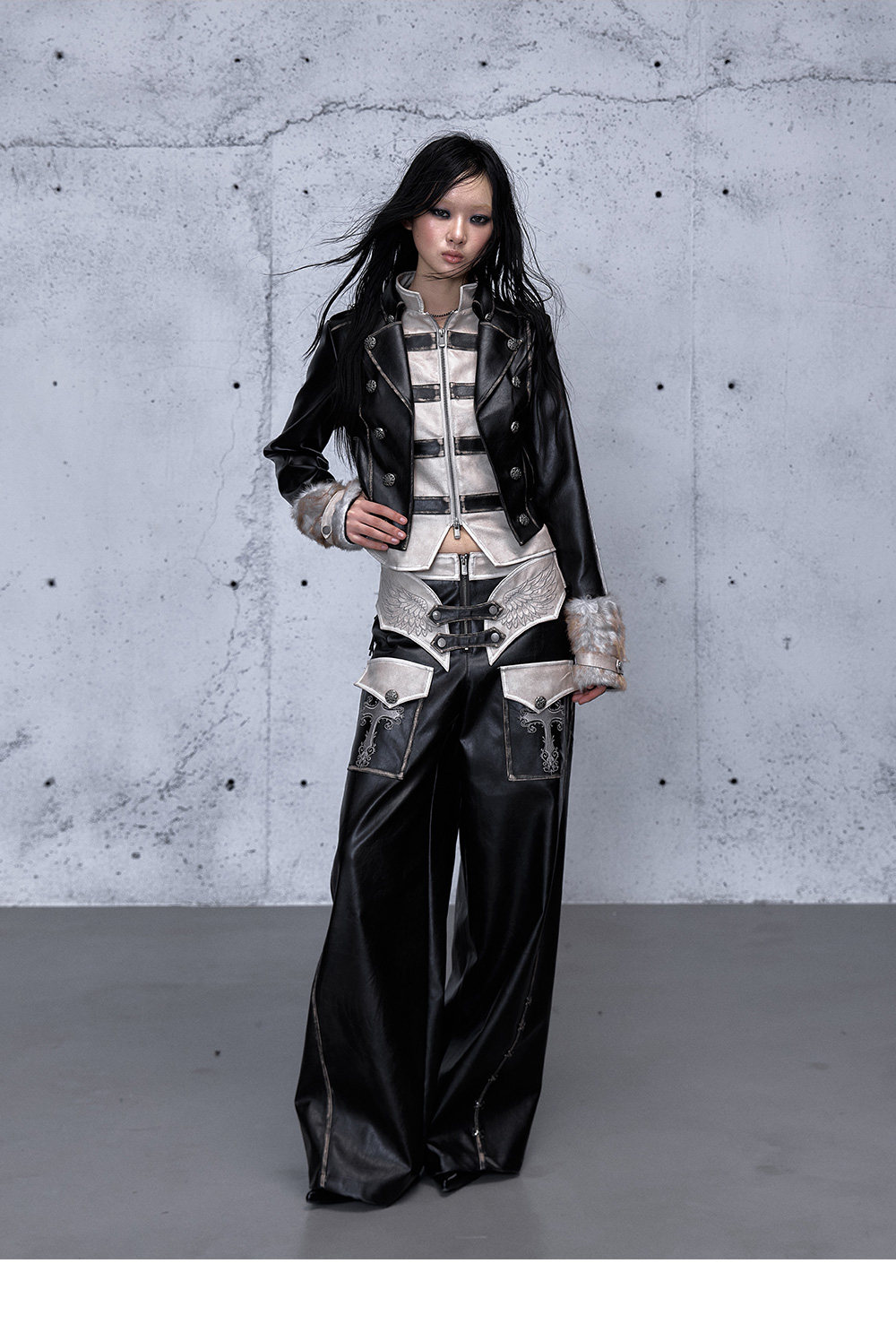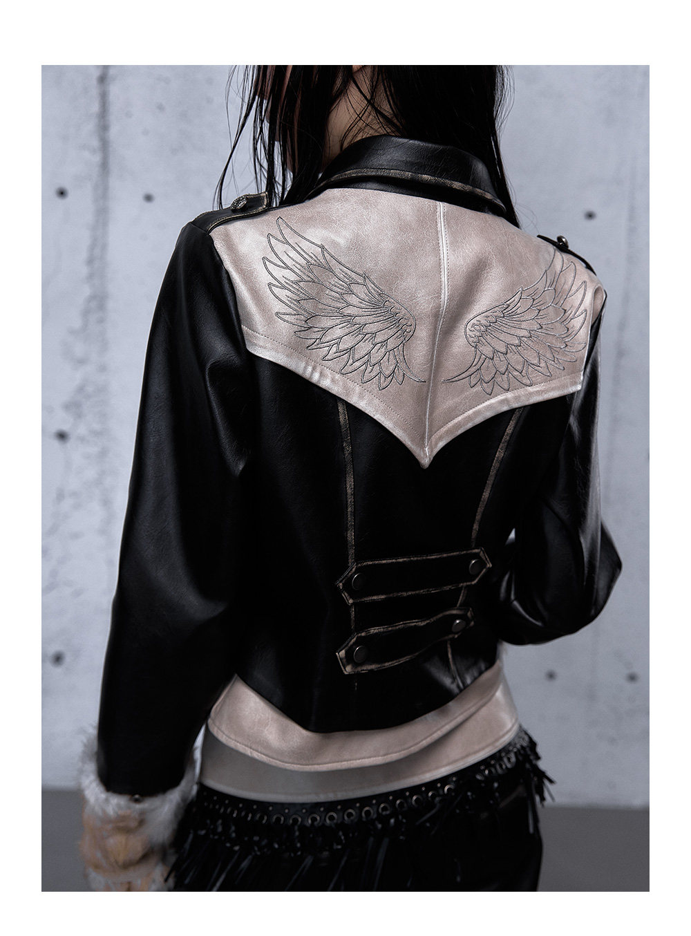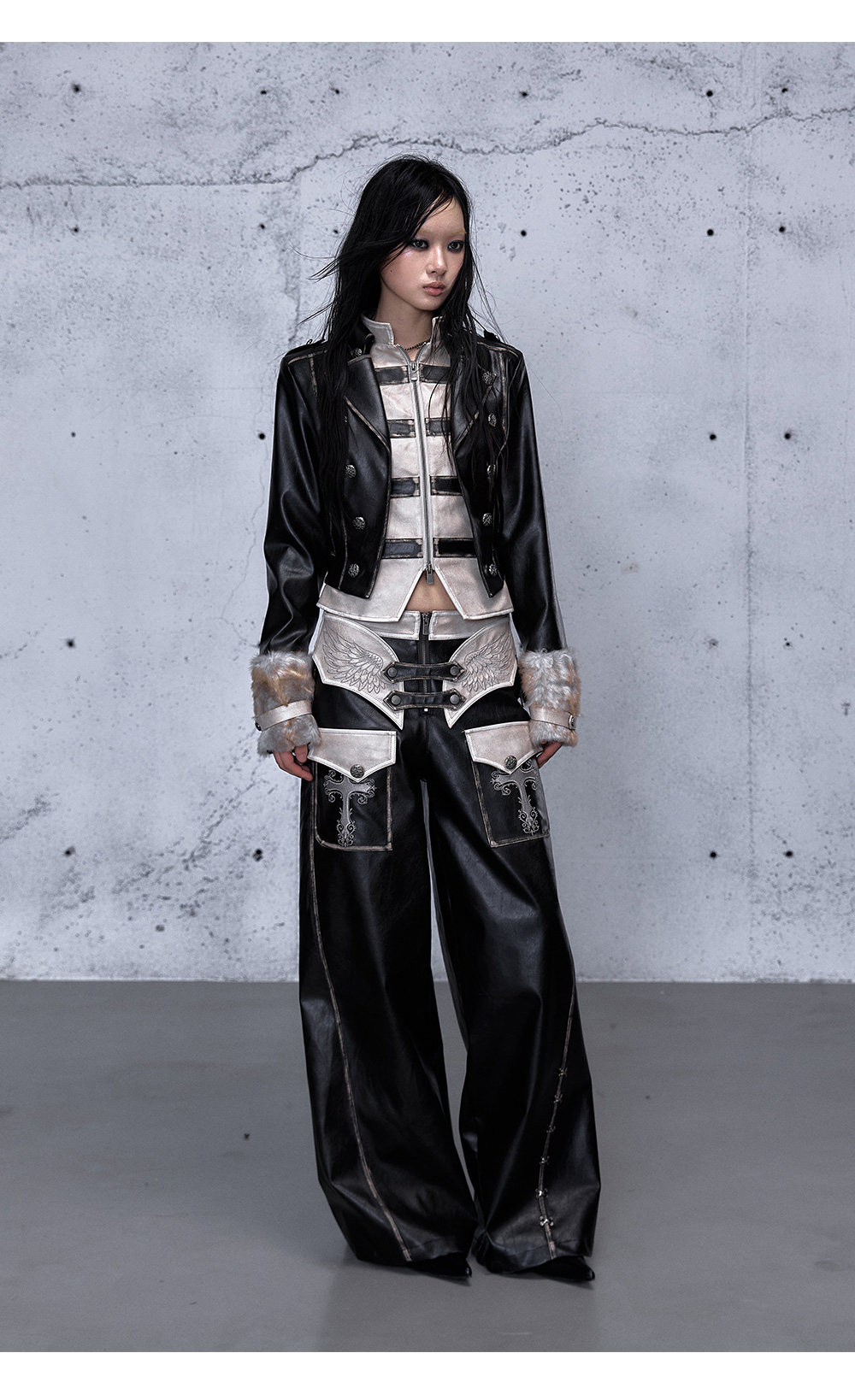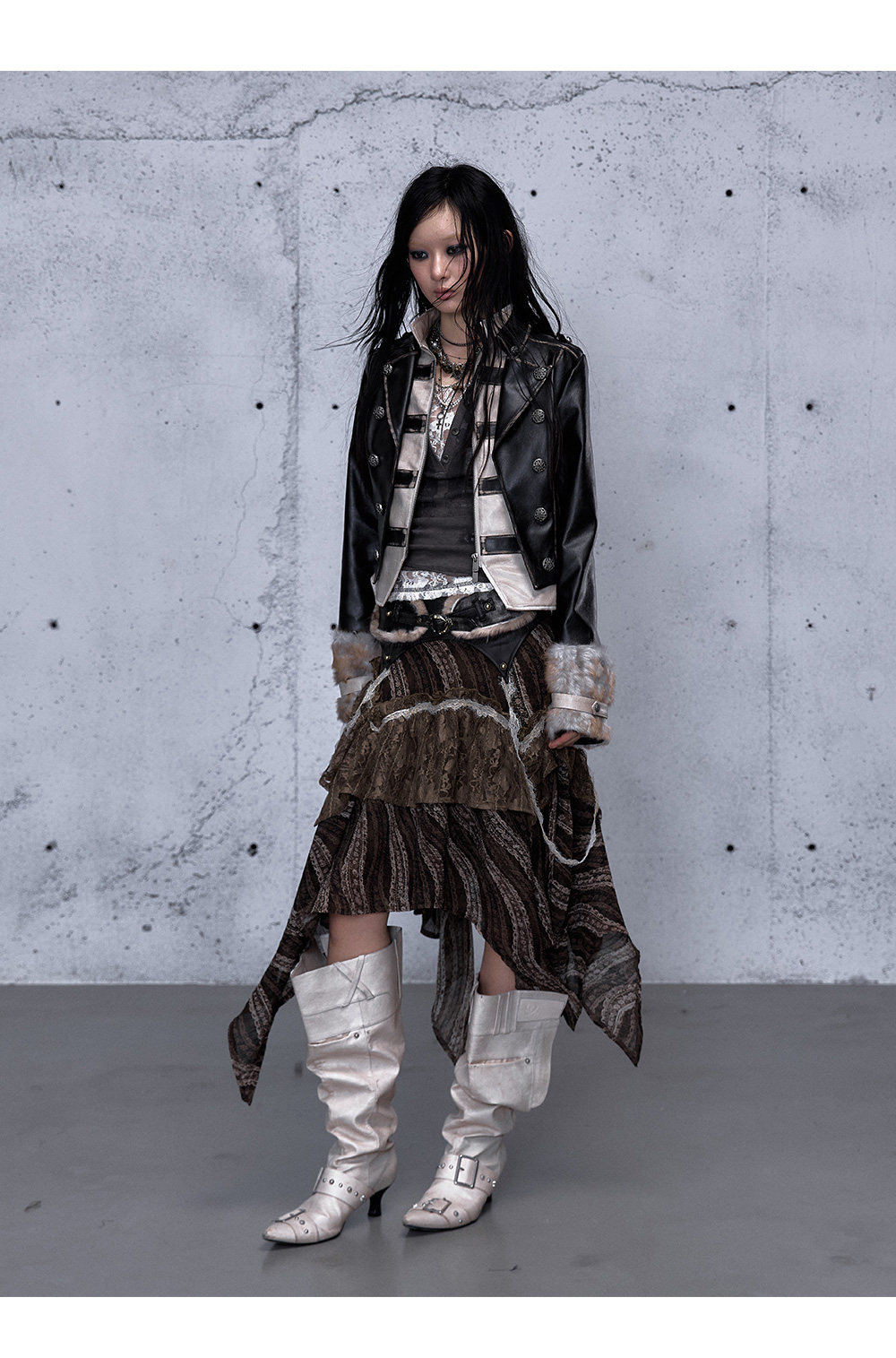 Standing-Collar Belt Detail Fake Fur Cuff PU Leather Jacket NA8980