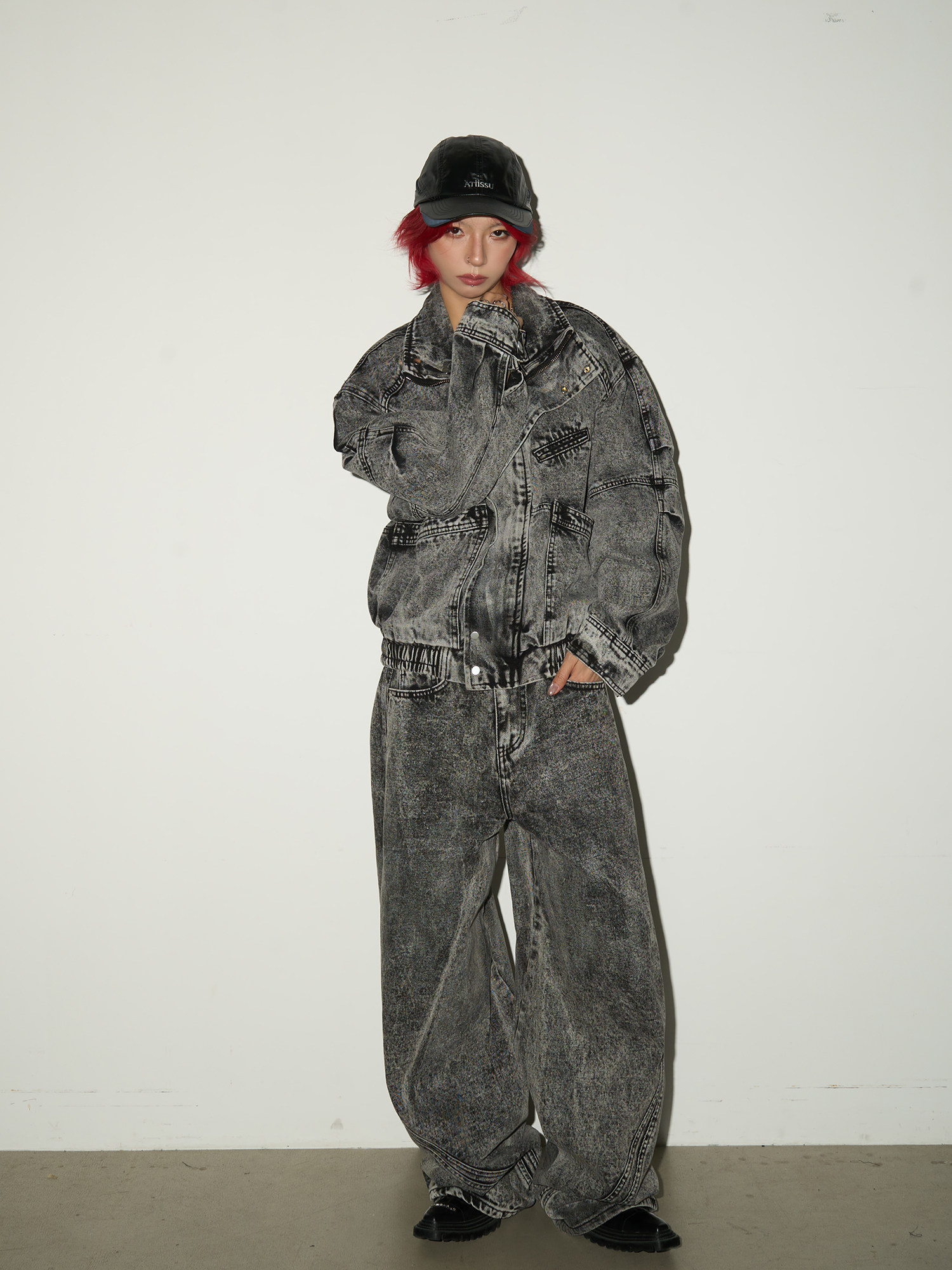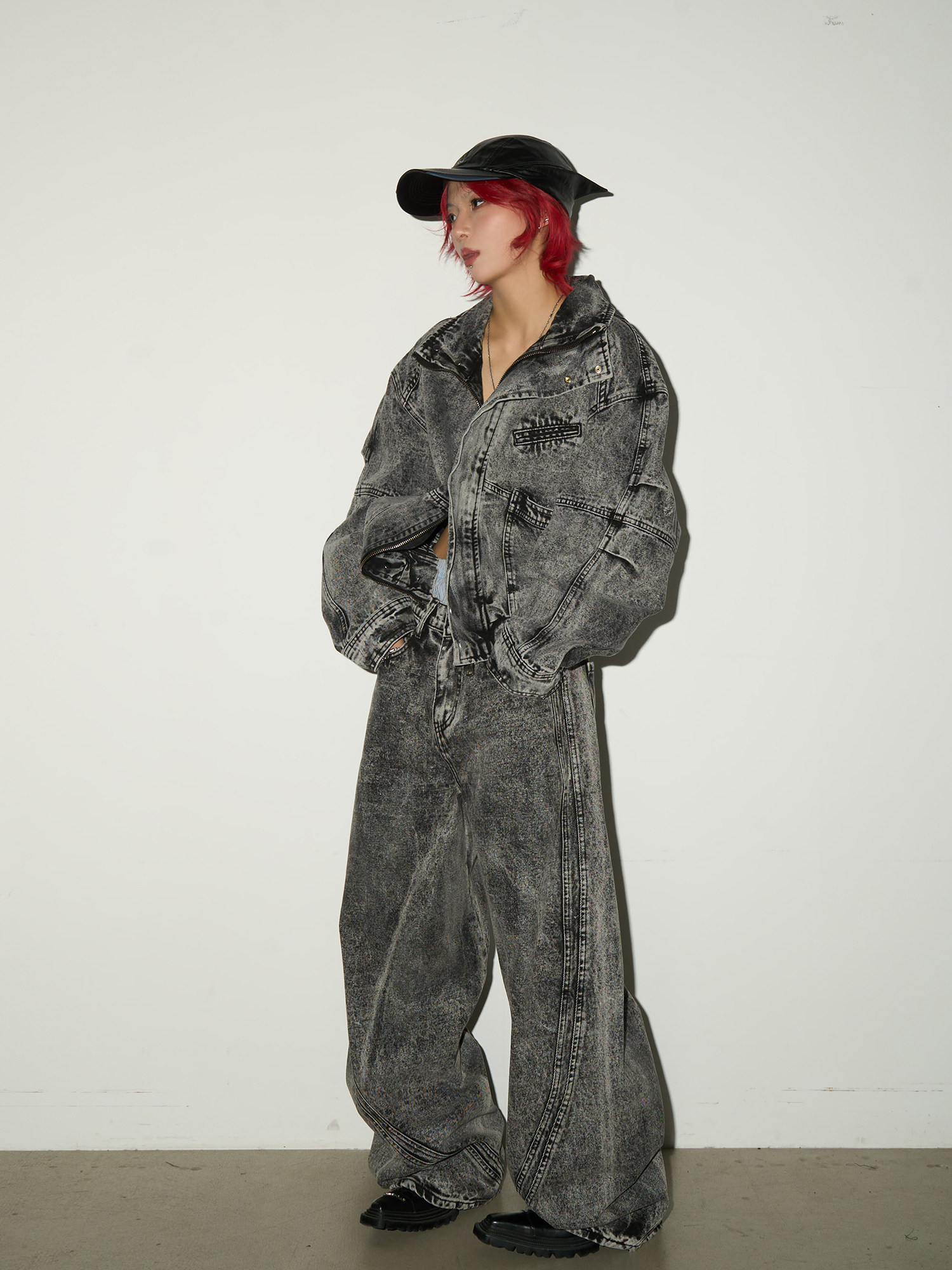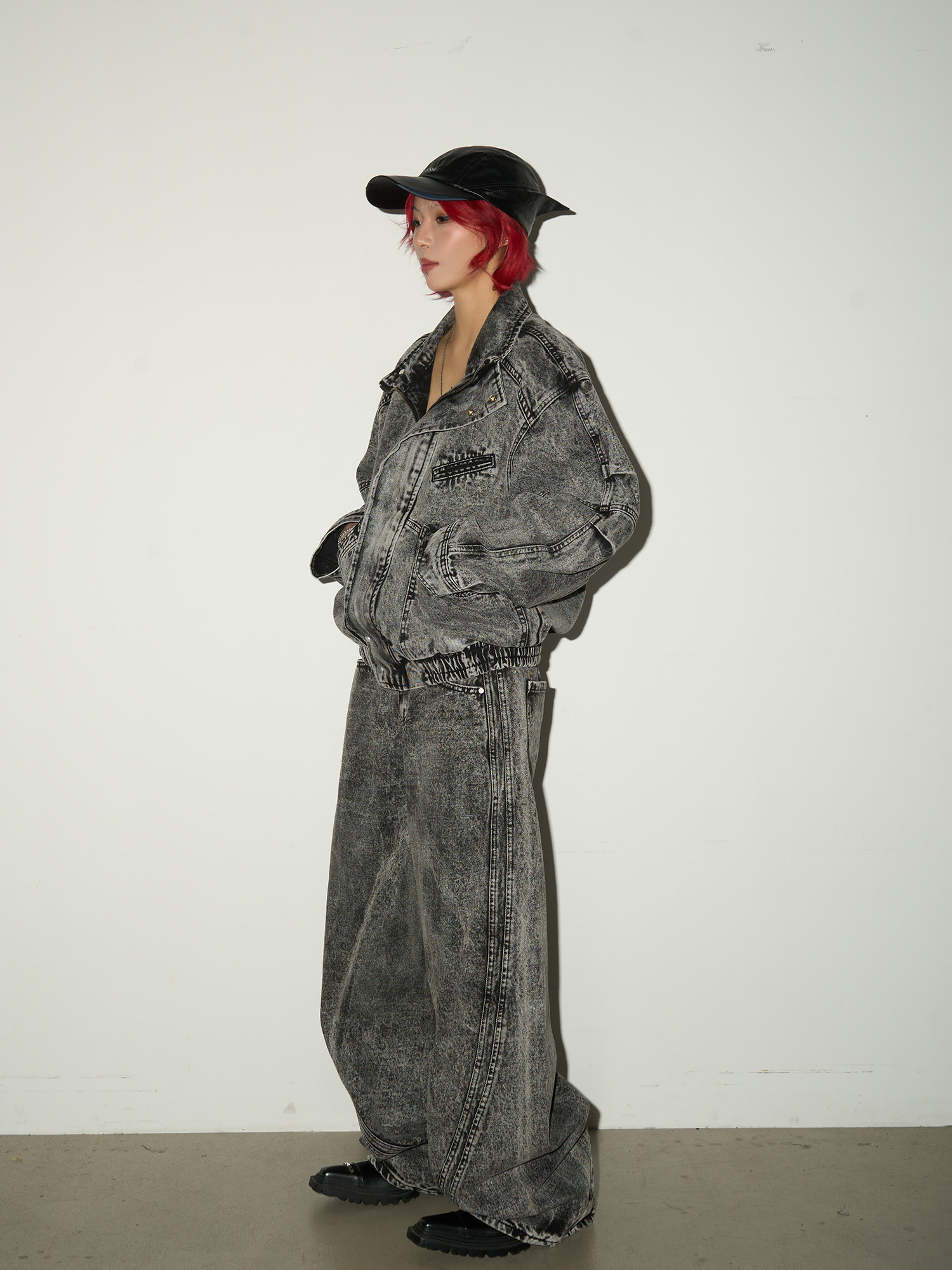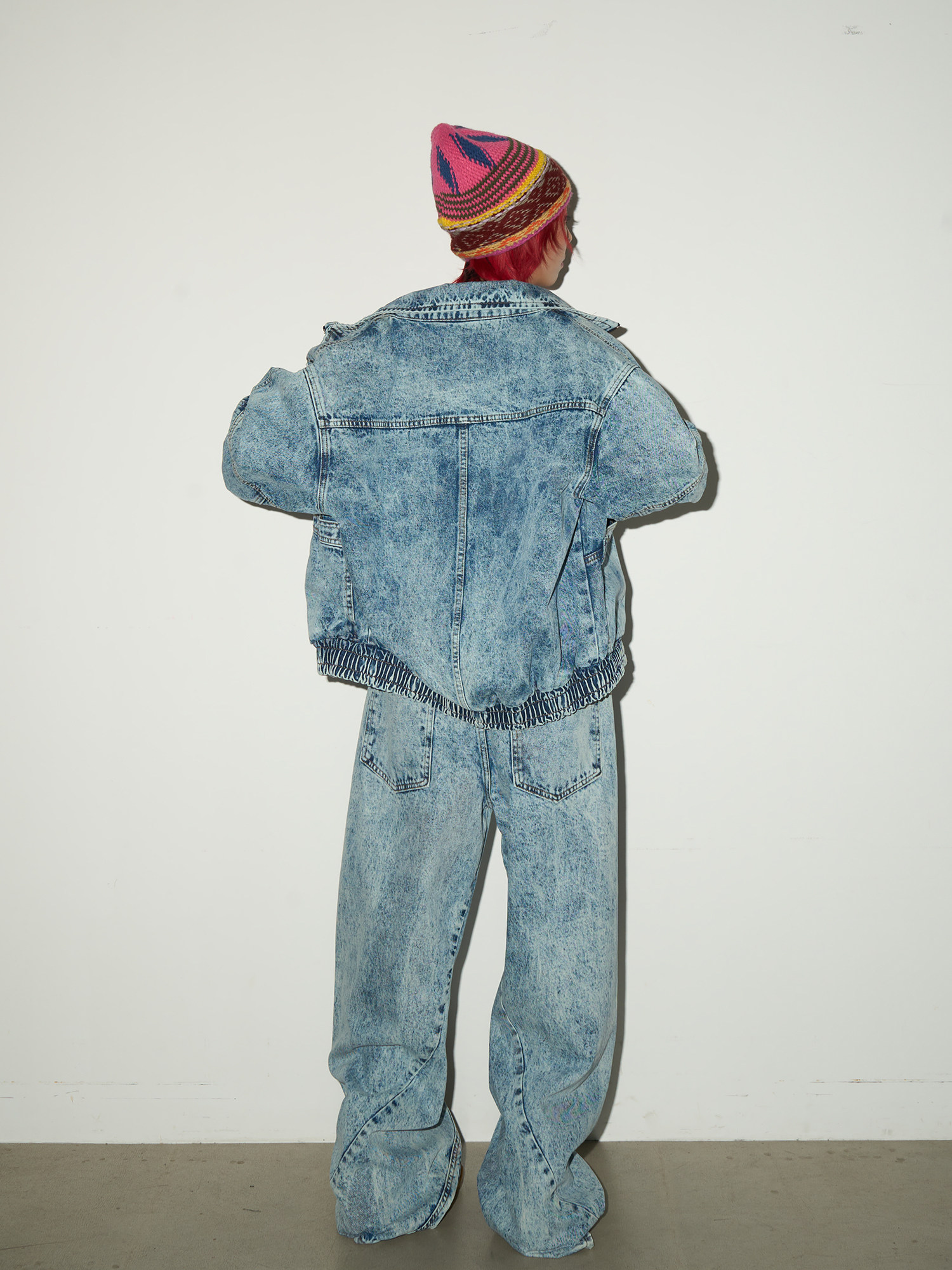Acid Wash Zipper Elastic Hem Jacket & Wide Leg Denim Jeans Setup NA9031