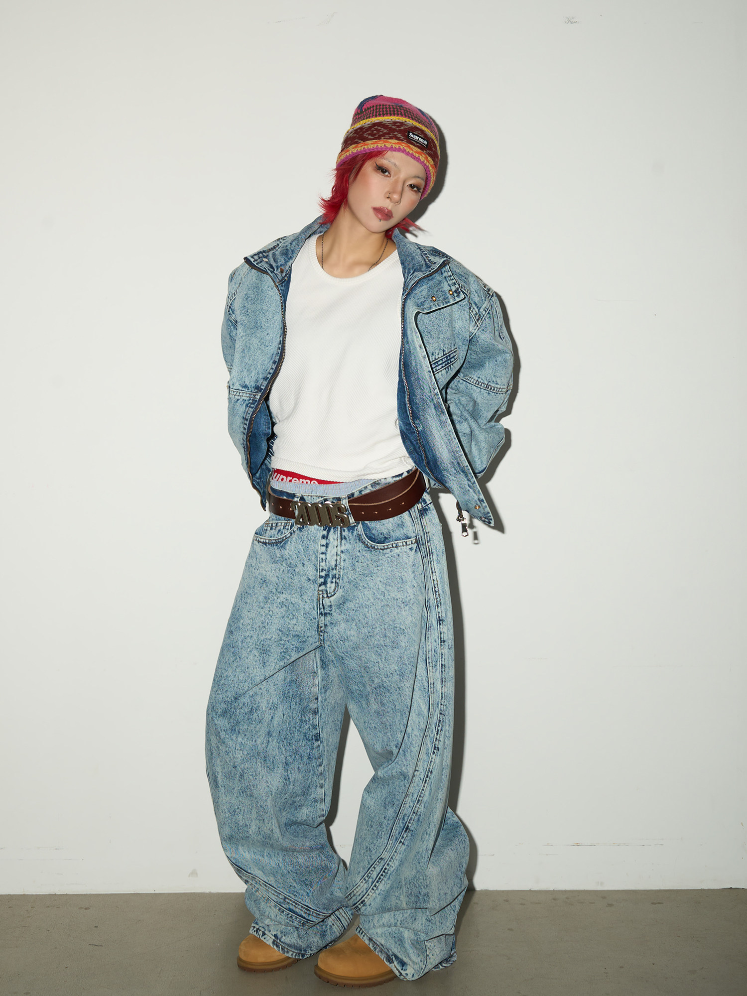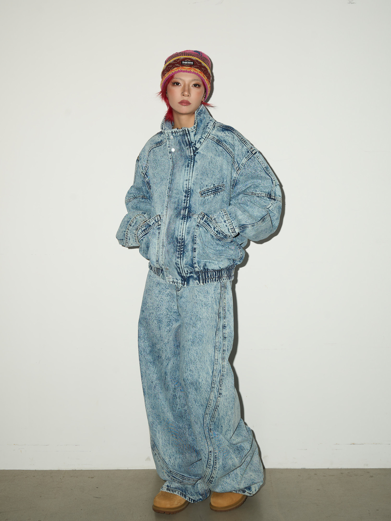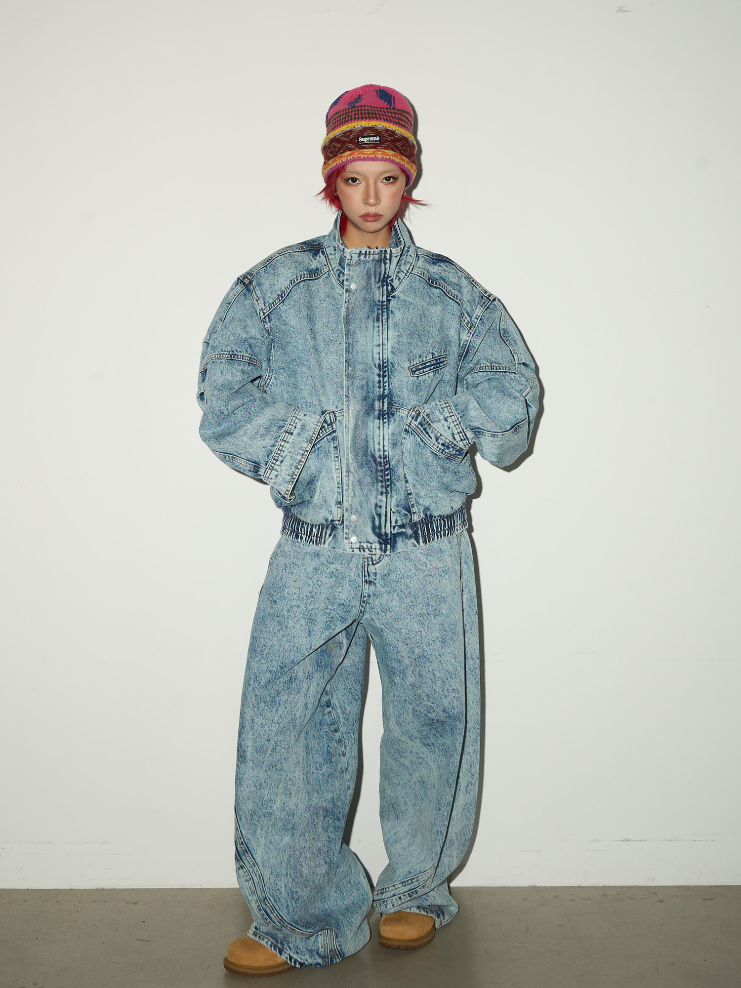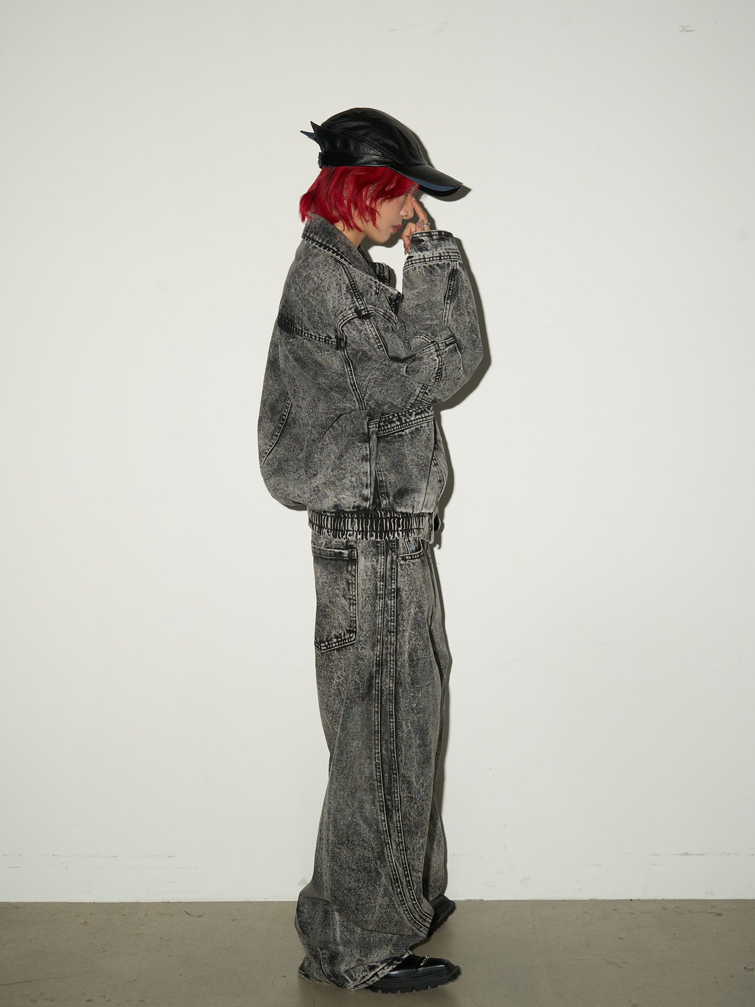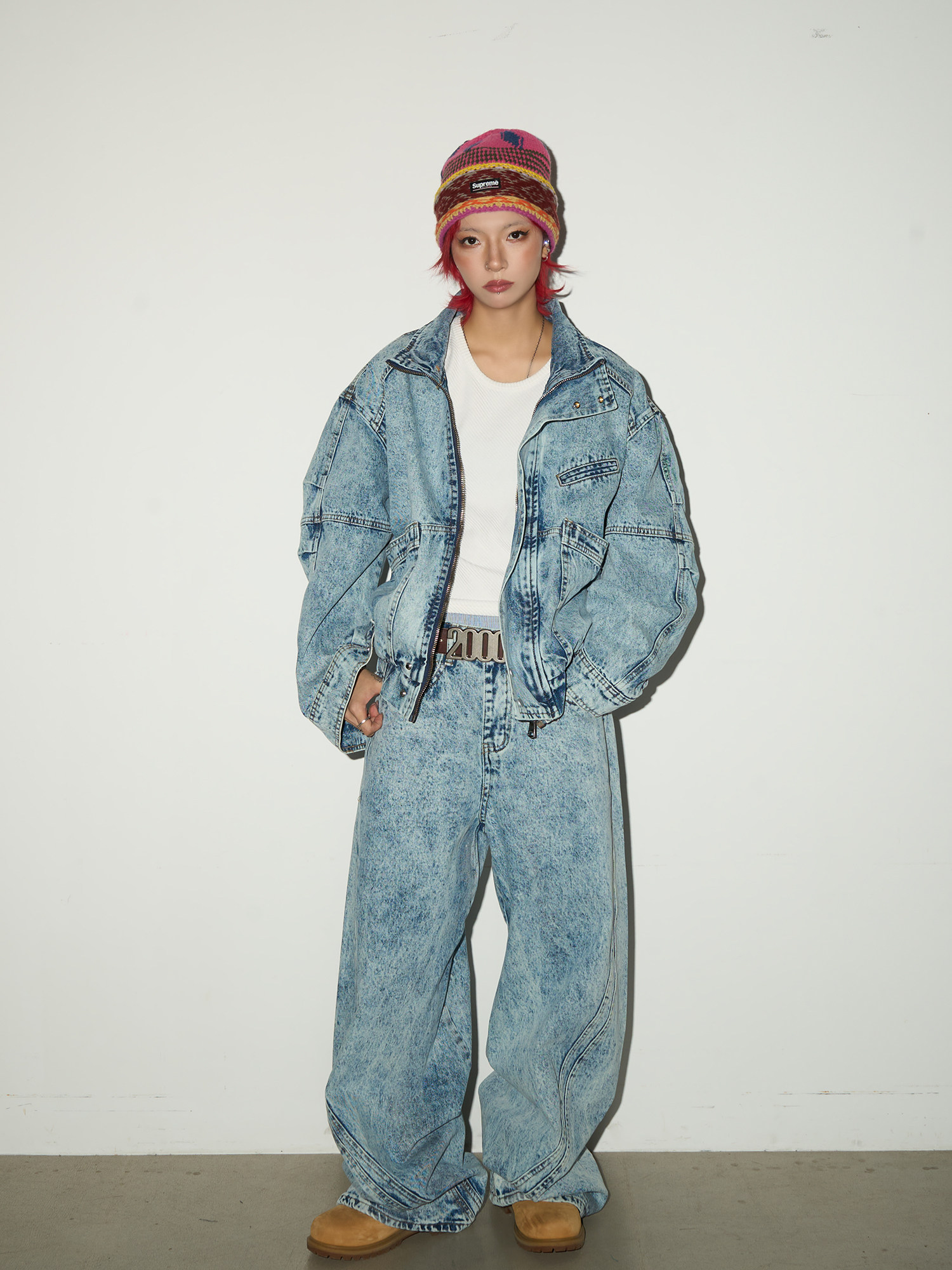 Acid Wash Zipper Elastic Hem Jacket & Wide Leg Denim Jeans Setup NA9031