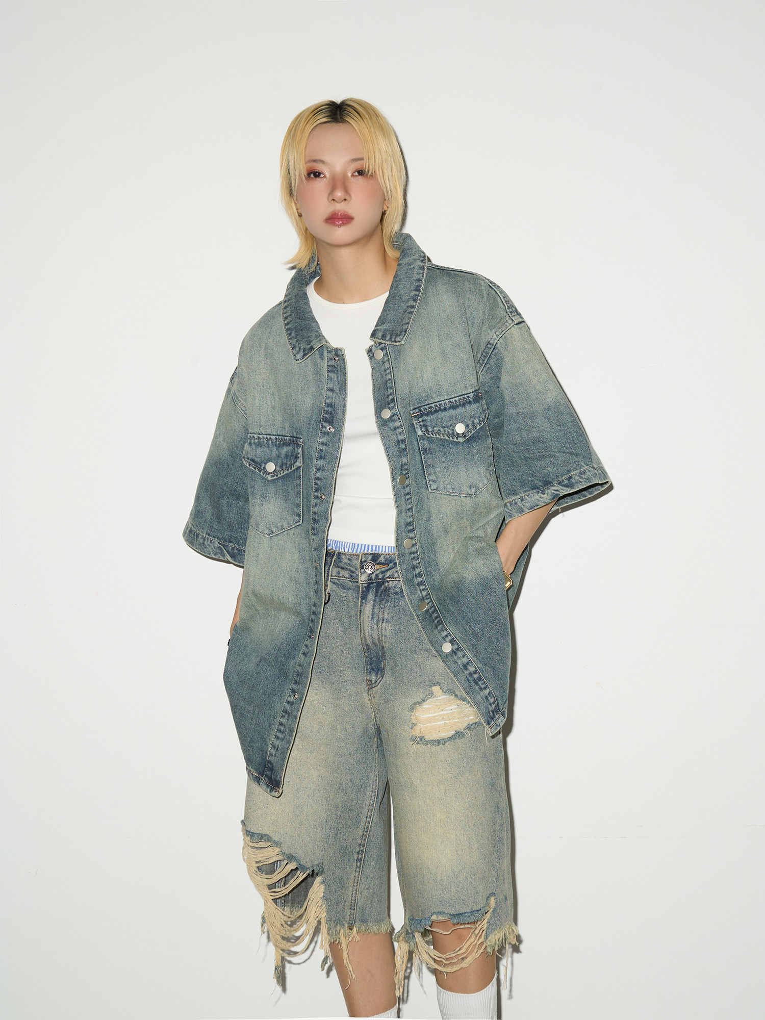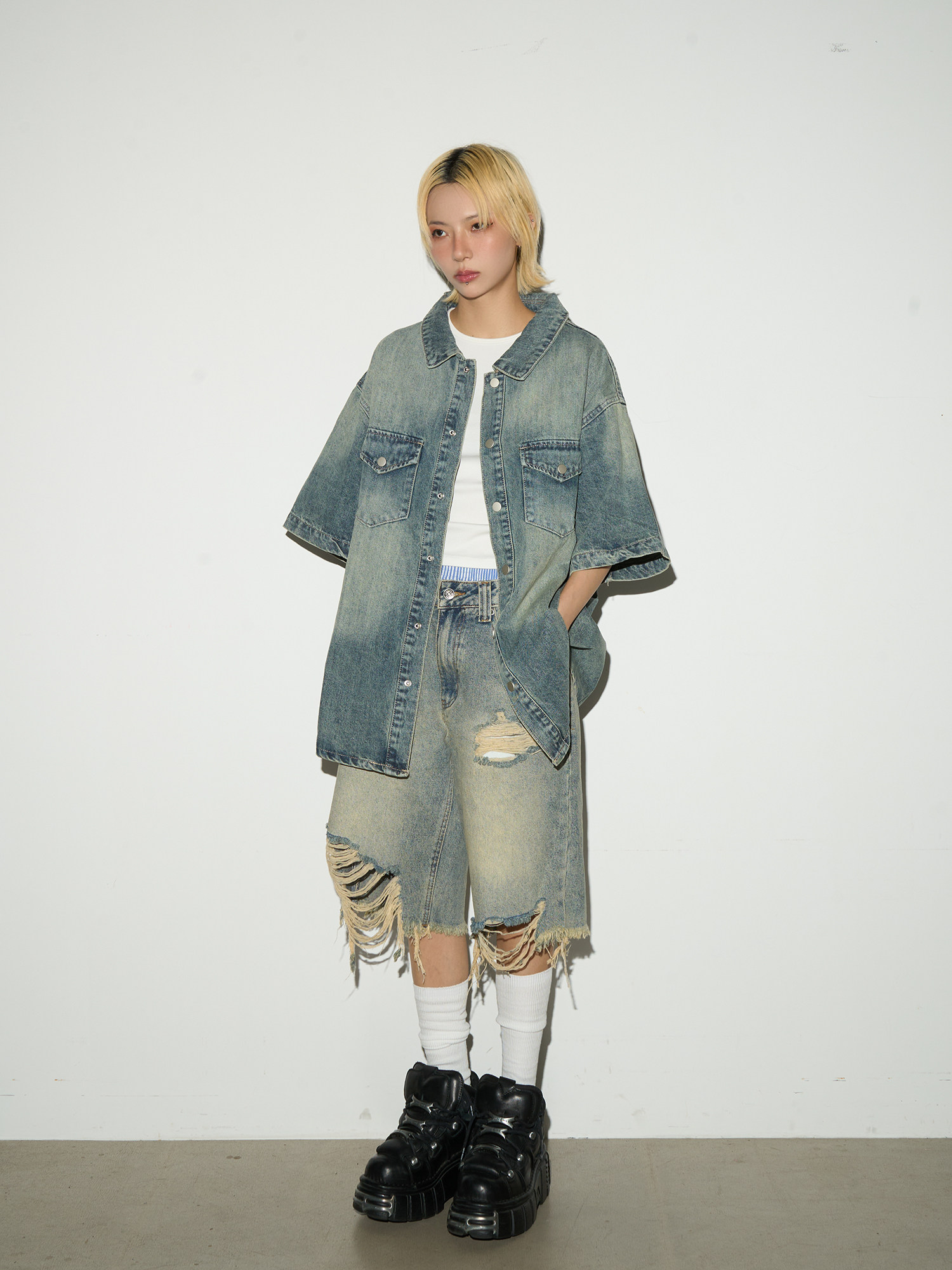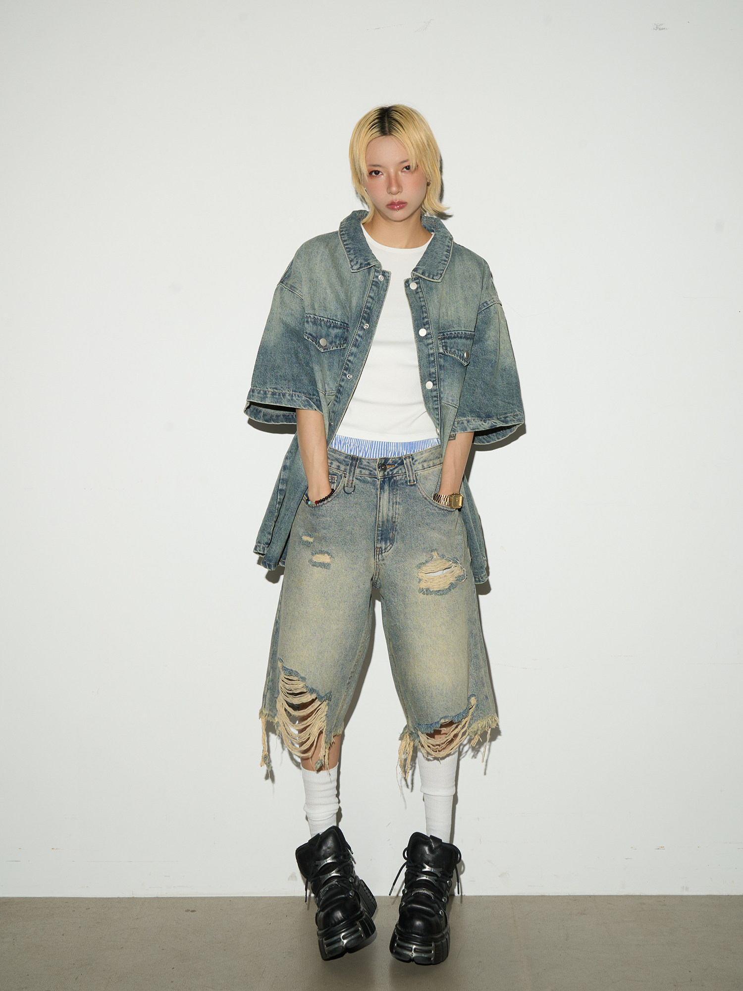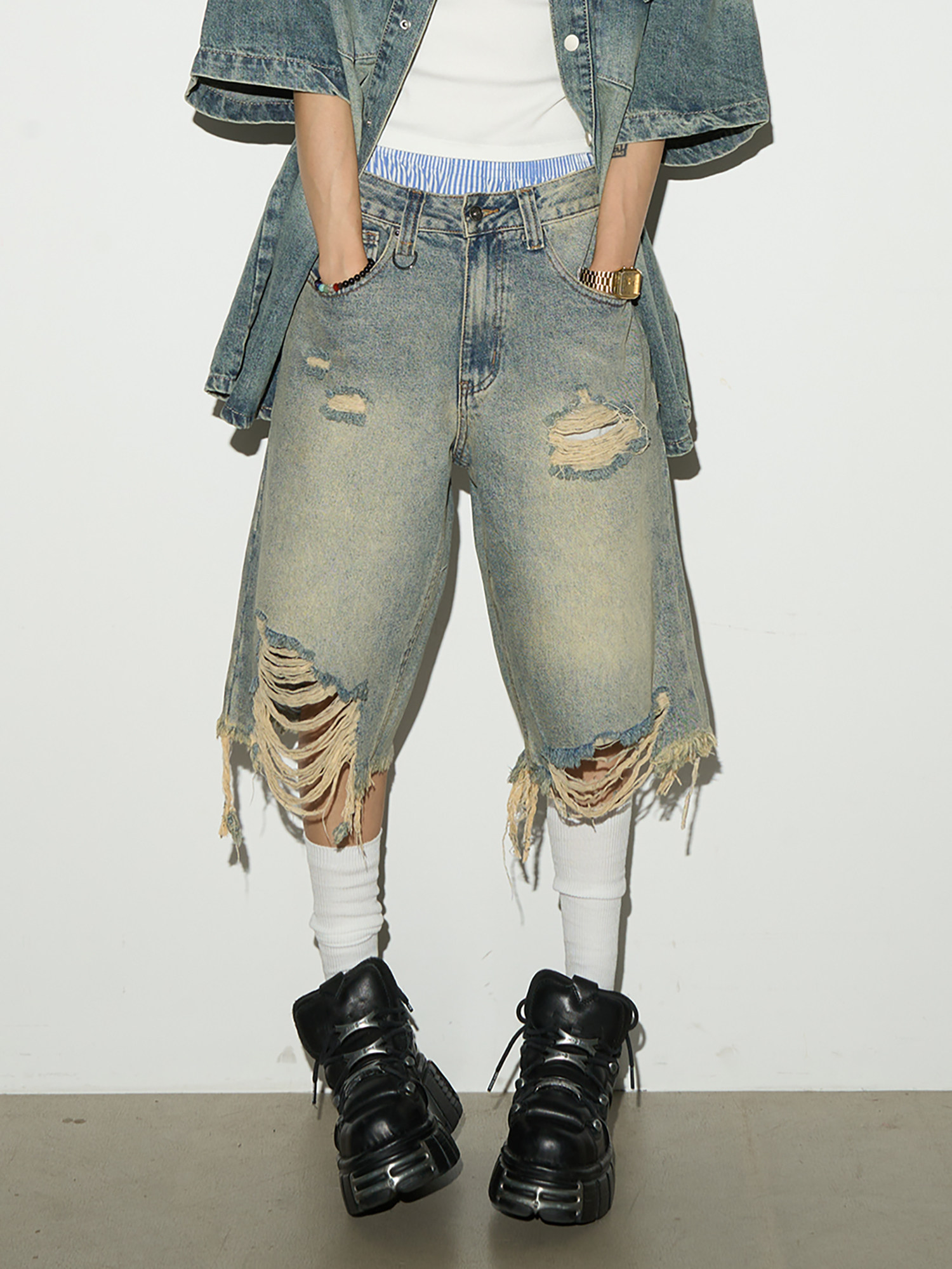Damage Washed Frayed Hem Half Denim Jeans NA9113