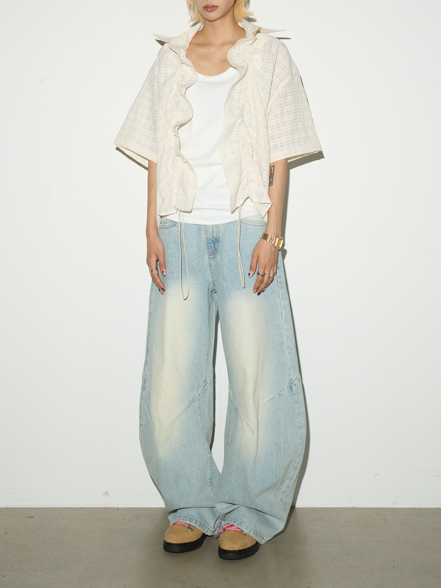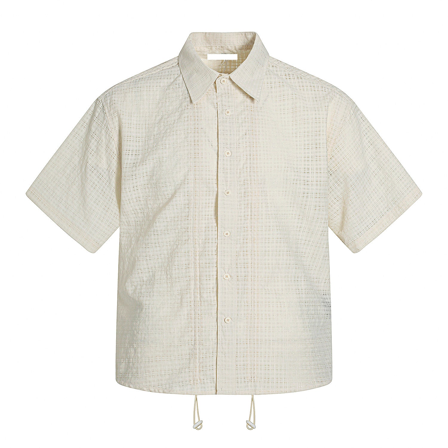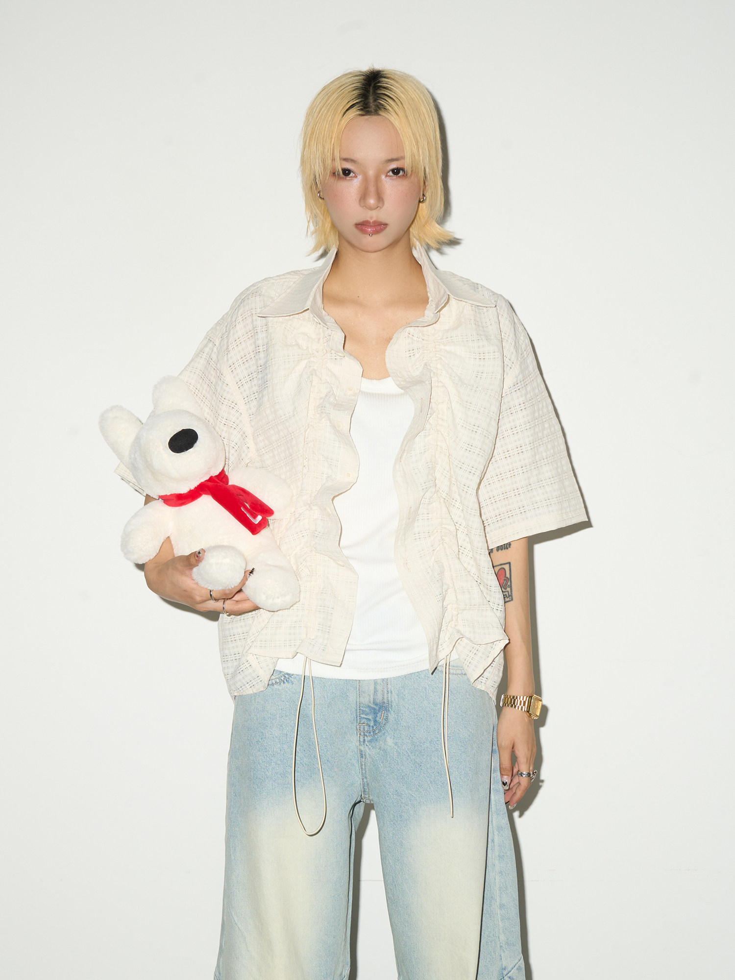 Ruffle Sheer Check Drawstring Hollow Short Sleeve Shirt NA9069
