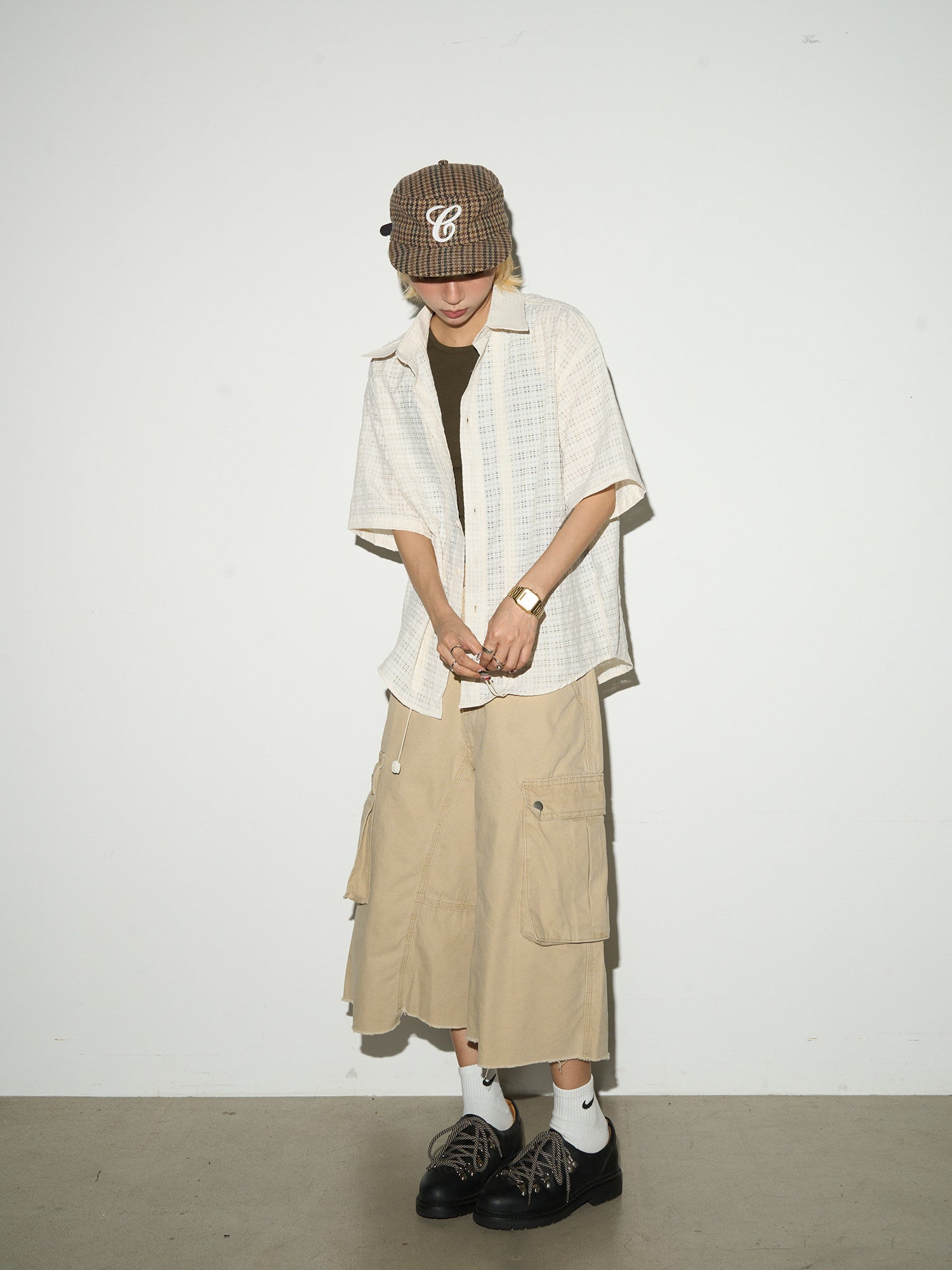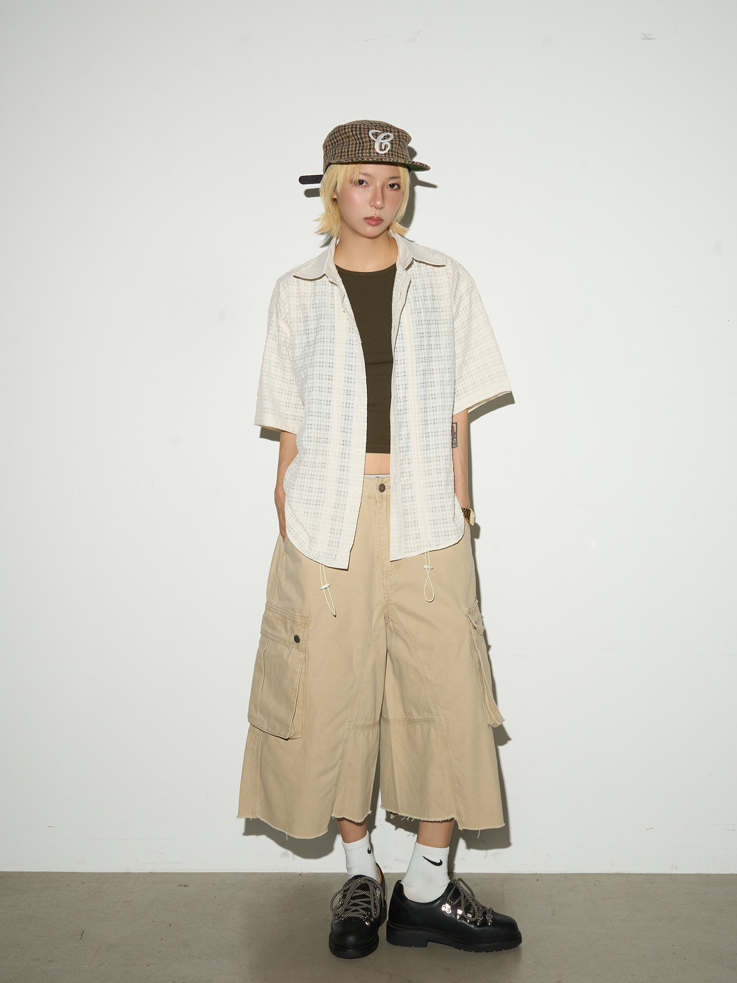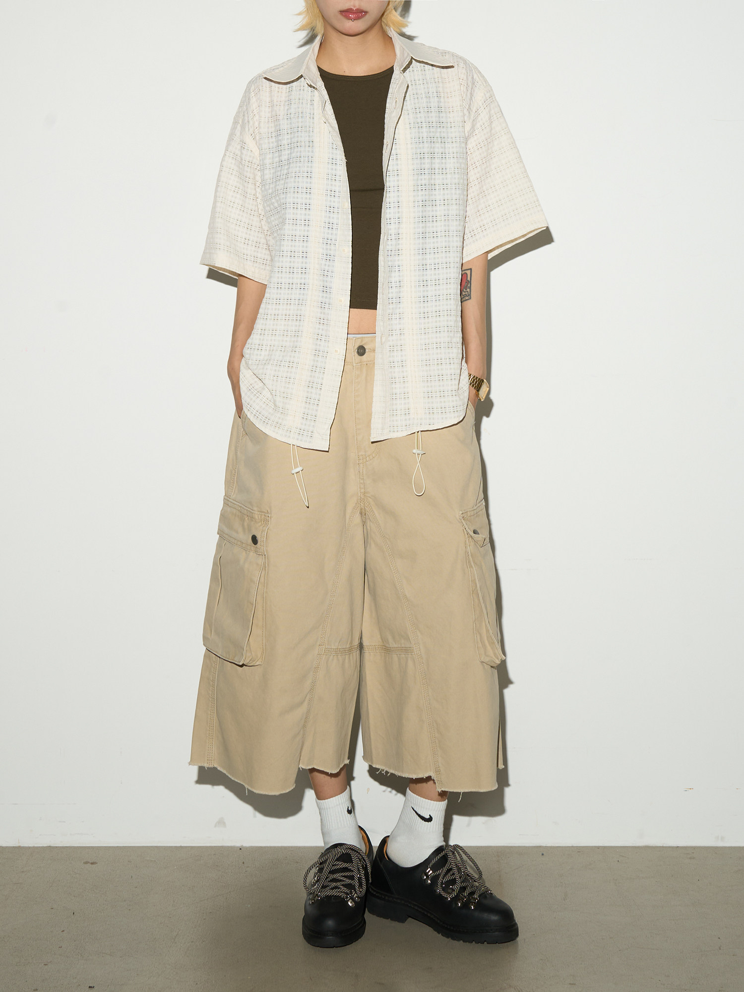Ruffle Sheer Check Drawstring Hollow Short Sleeve Shirt NA9069