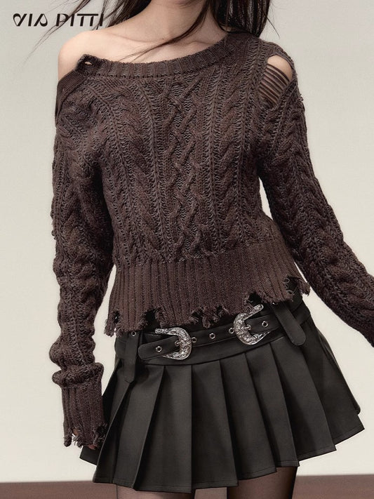 Round Neck Damaged Knit Sweater NA4792