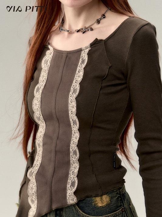 Lace Patchwork Knit Long Sleeve T-shirt NA4836