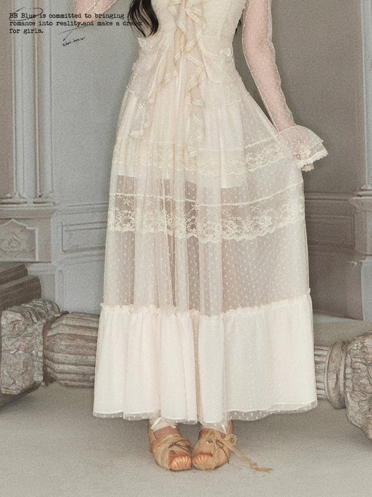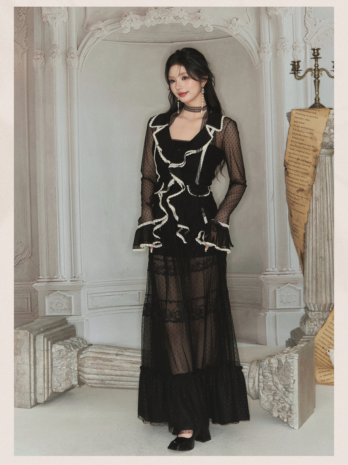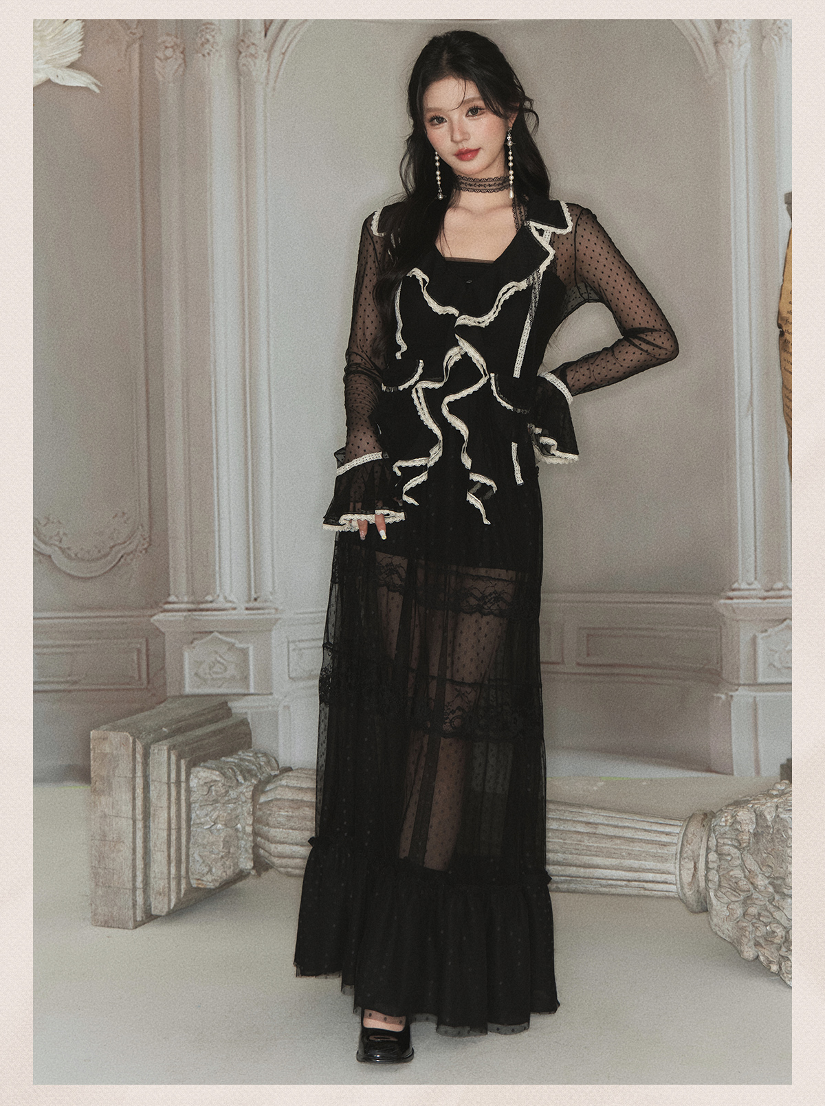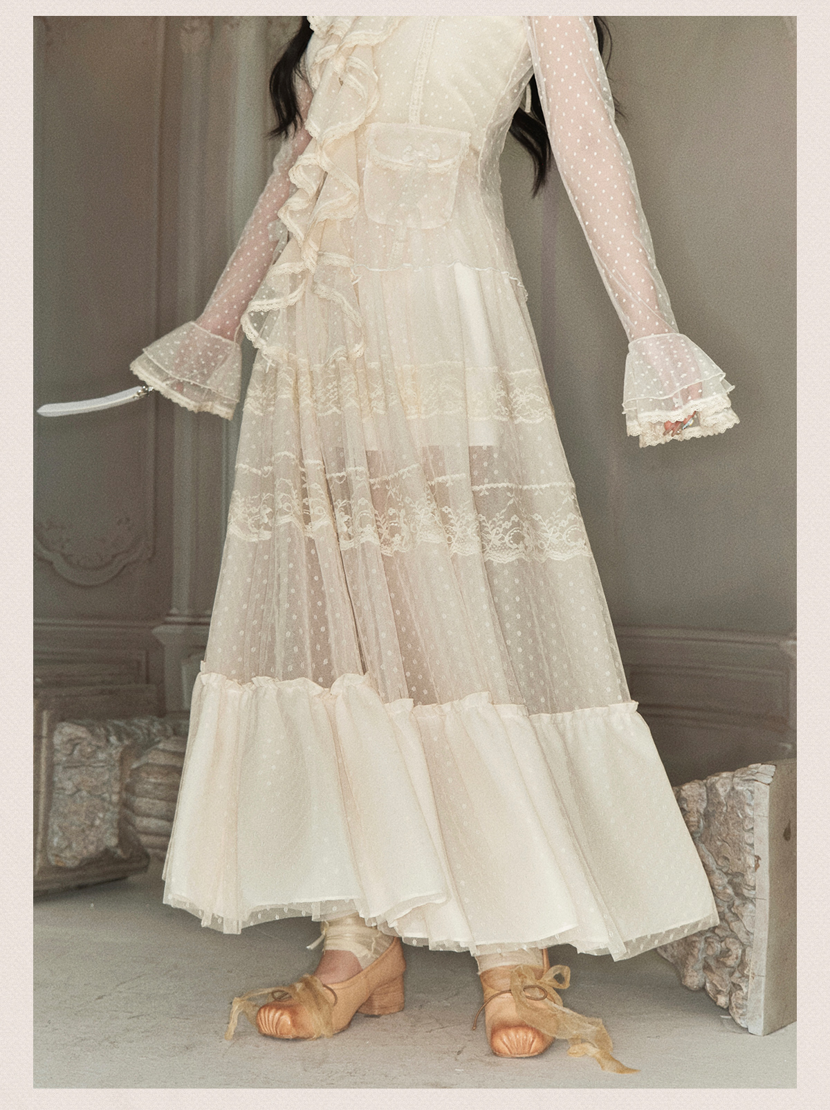 Elegant Polka Dot Lace Mesh Tiered High-Waist Long Skirt NA7421