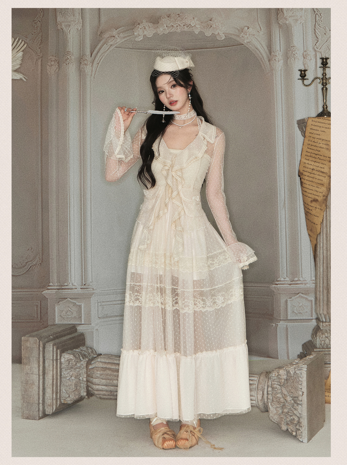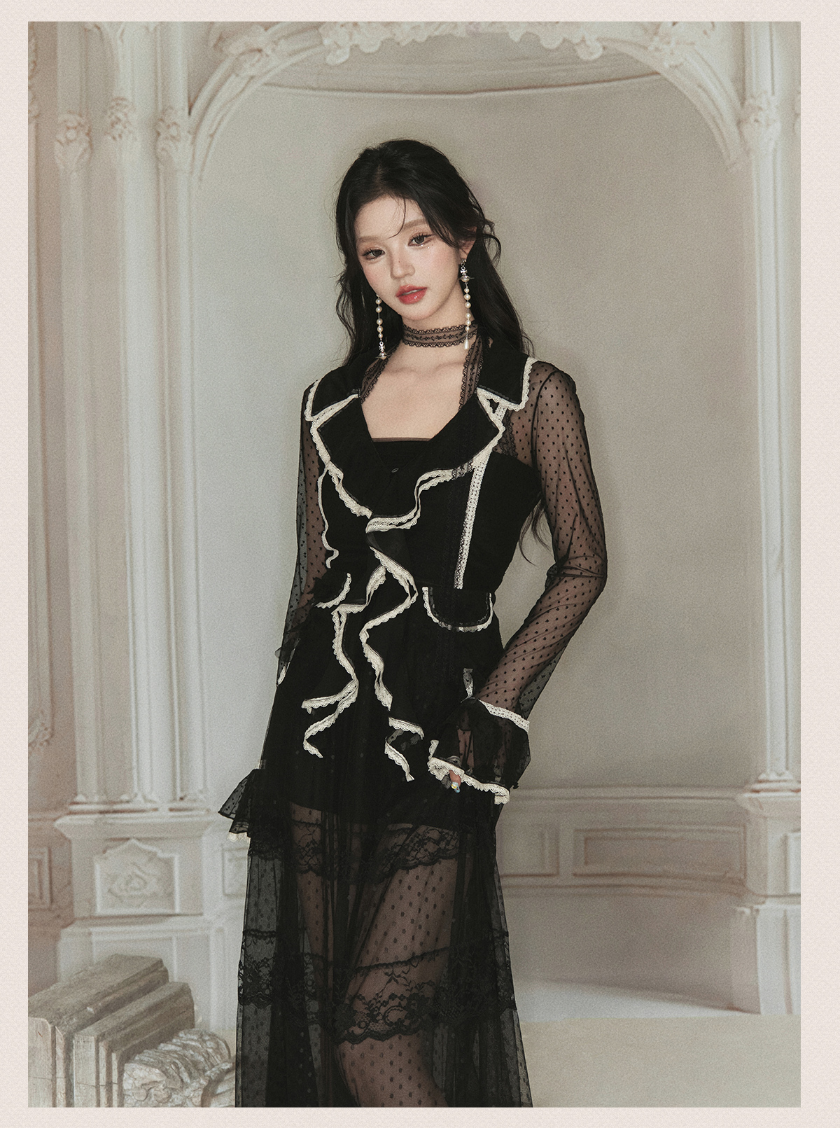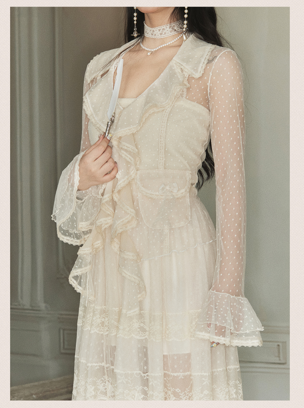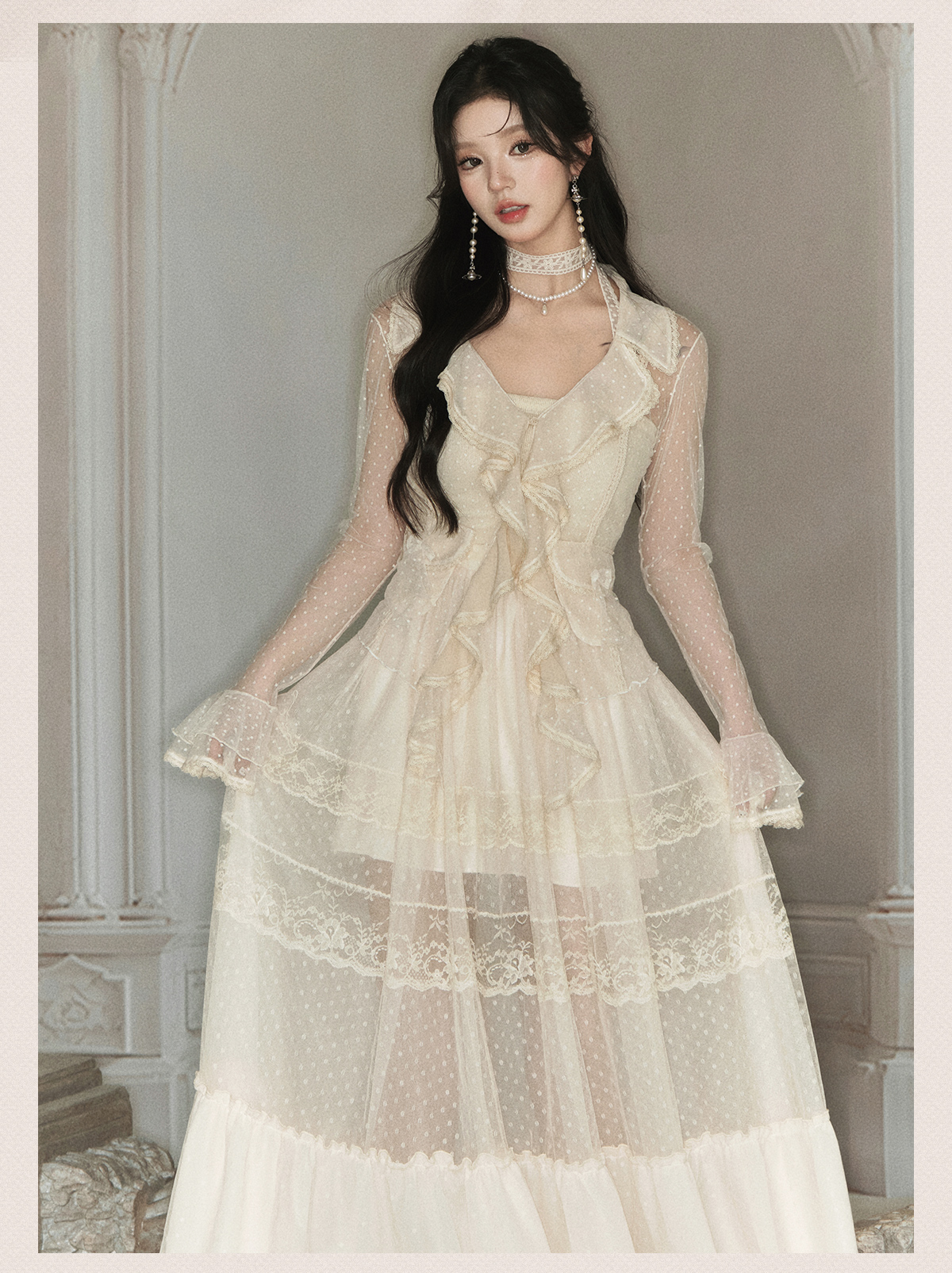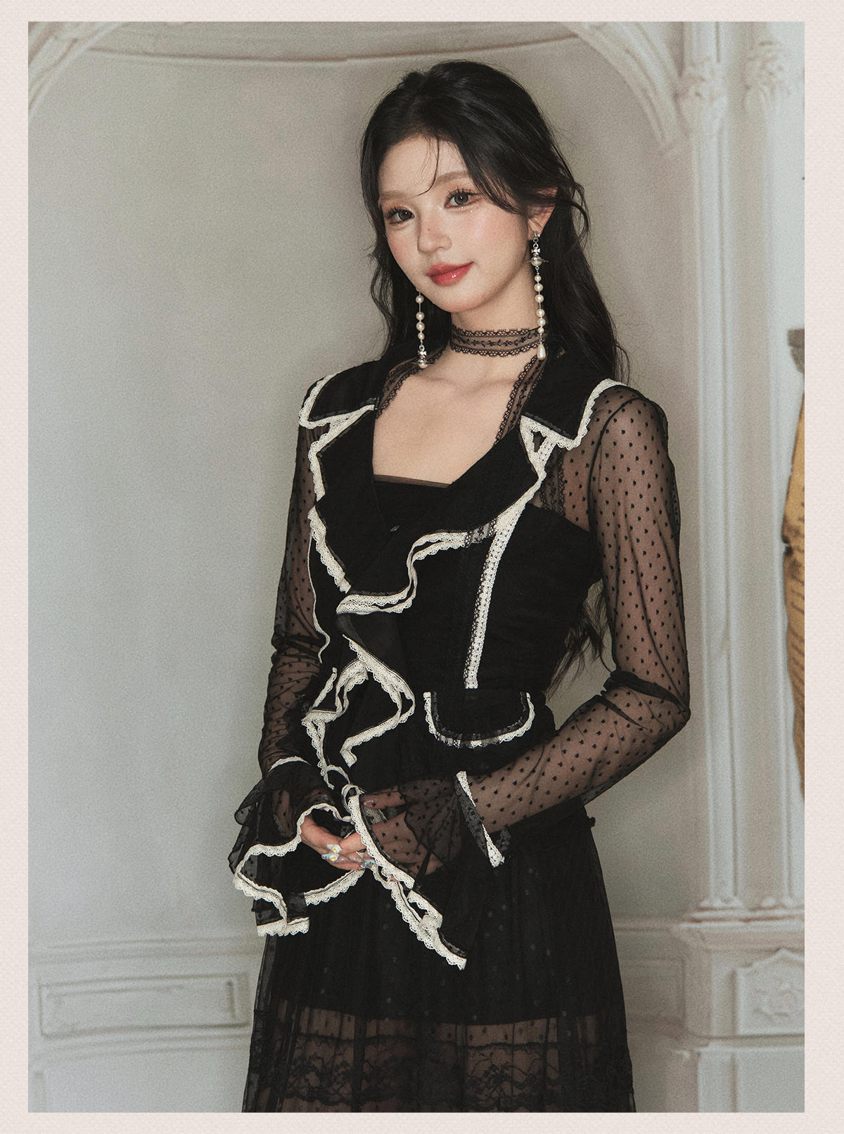 Elegant Polka Dot Lace Mesh Tiered High-Waist Long Skirt NA7421