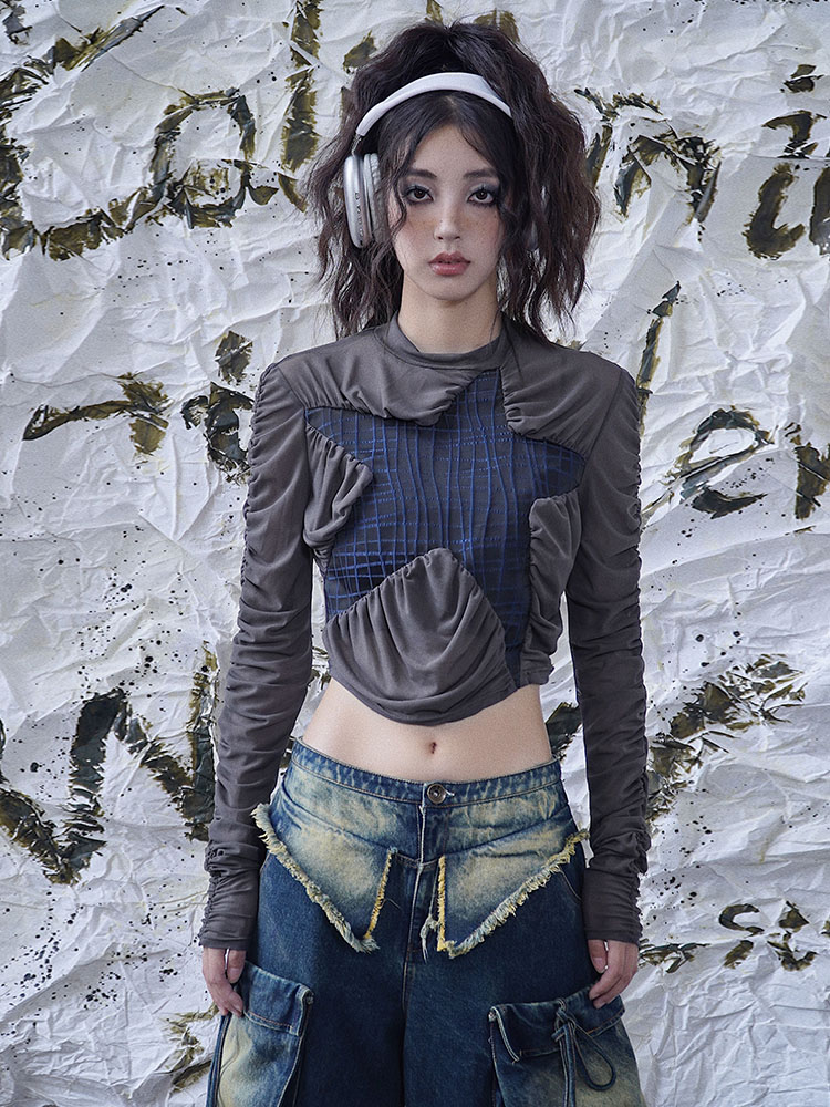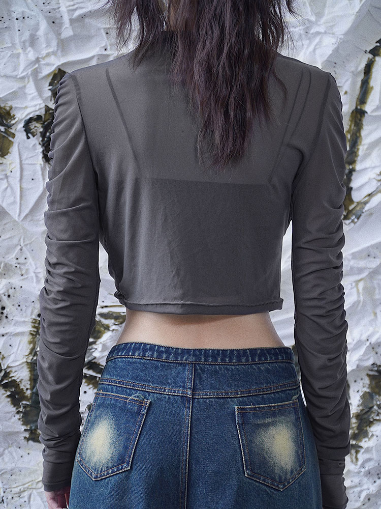 Sheer Mesh Ruched Patchwork Long Sleeve T-shirt NA7724