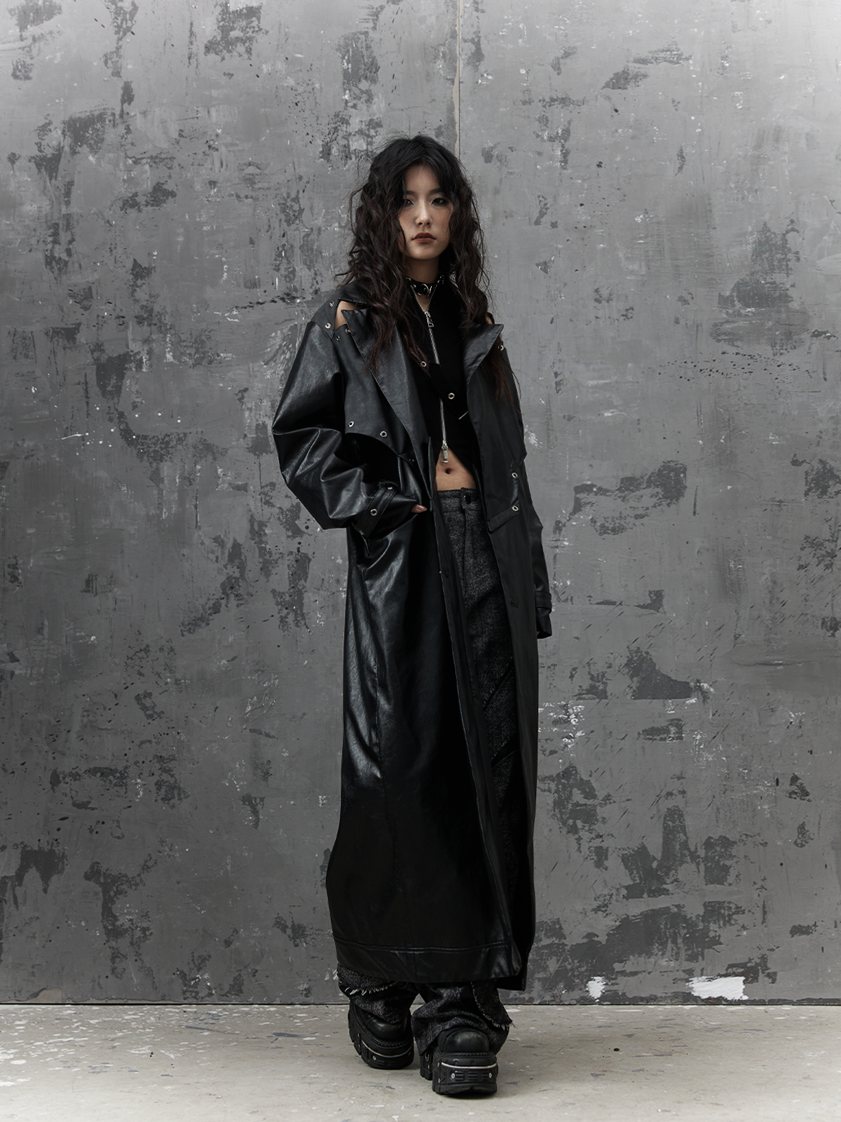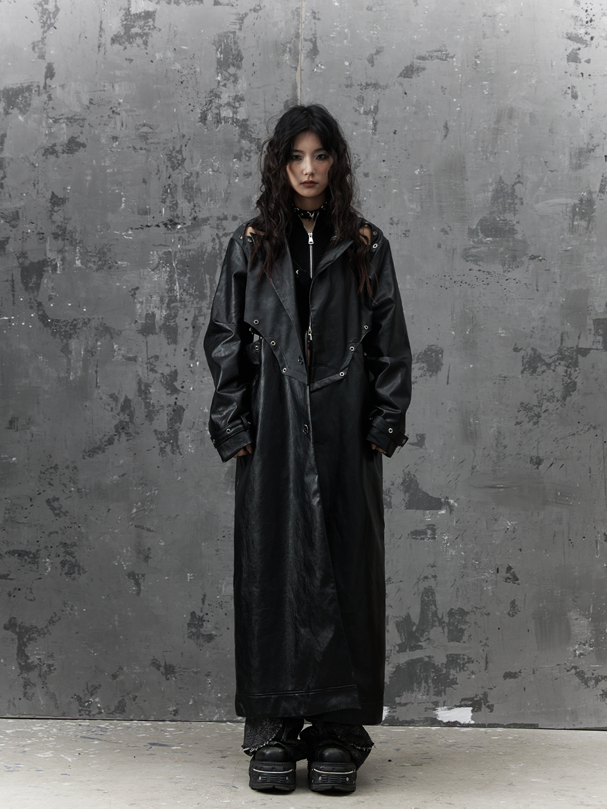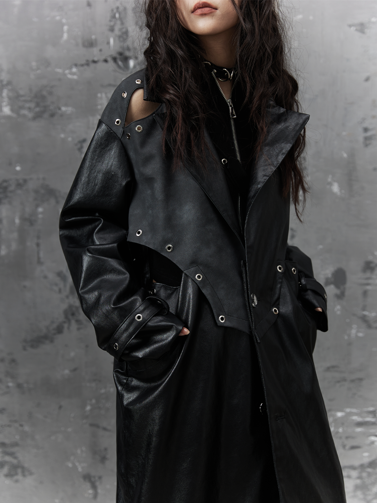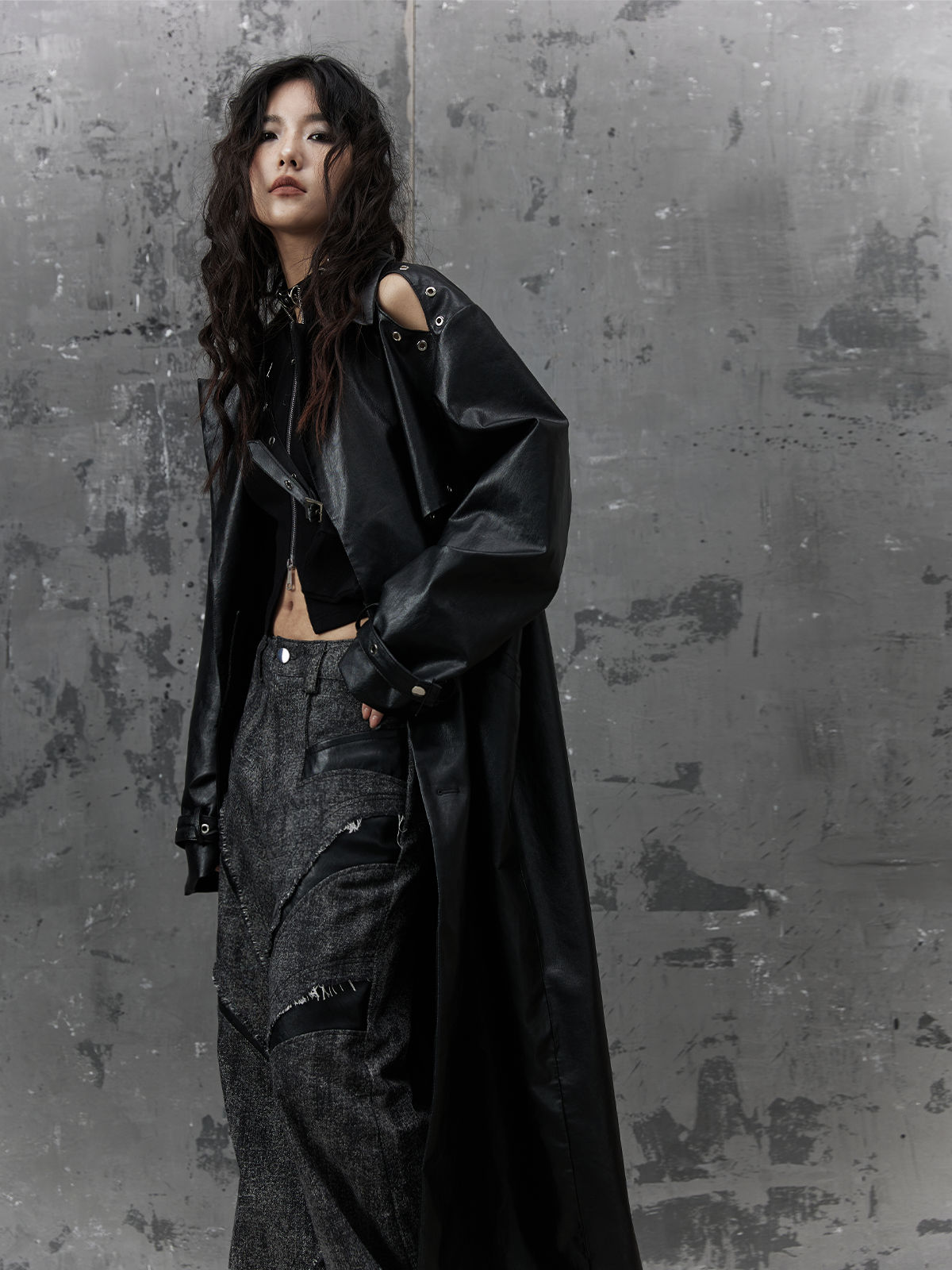 Cutout Patchwork Long PU Leather Trench Coat NA8173