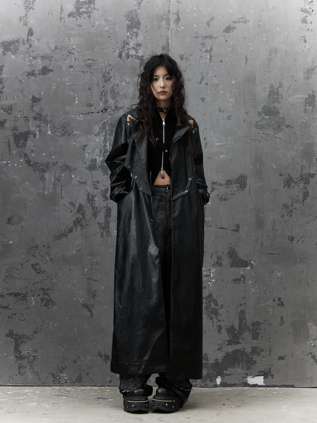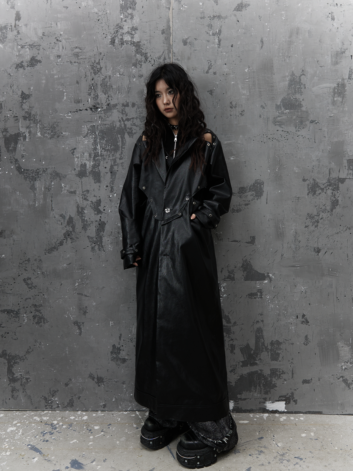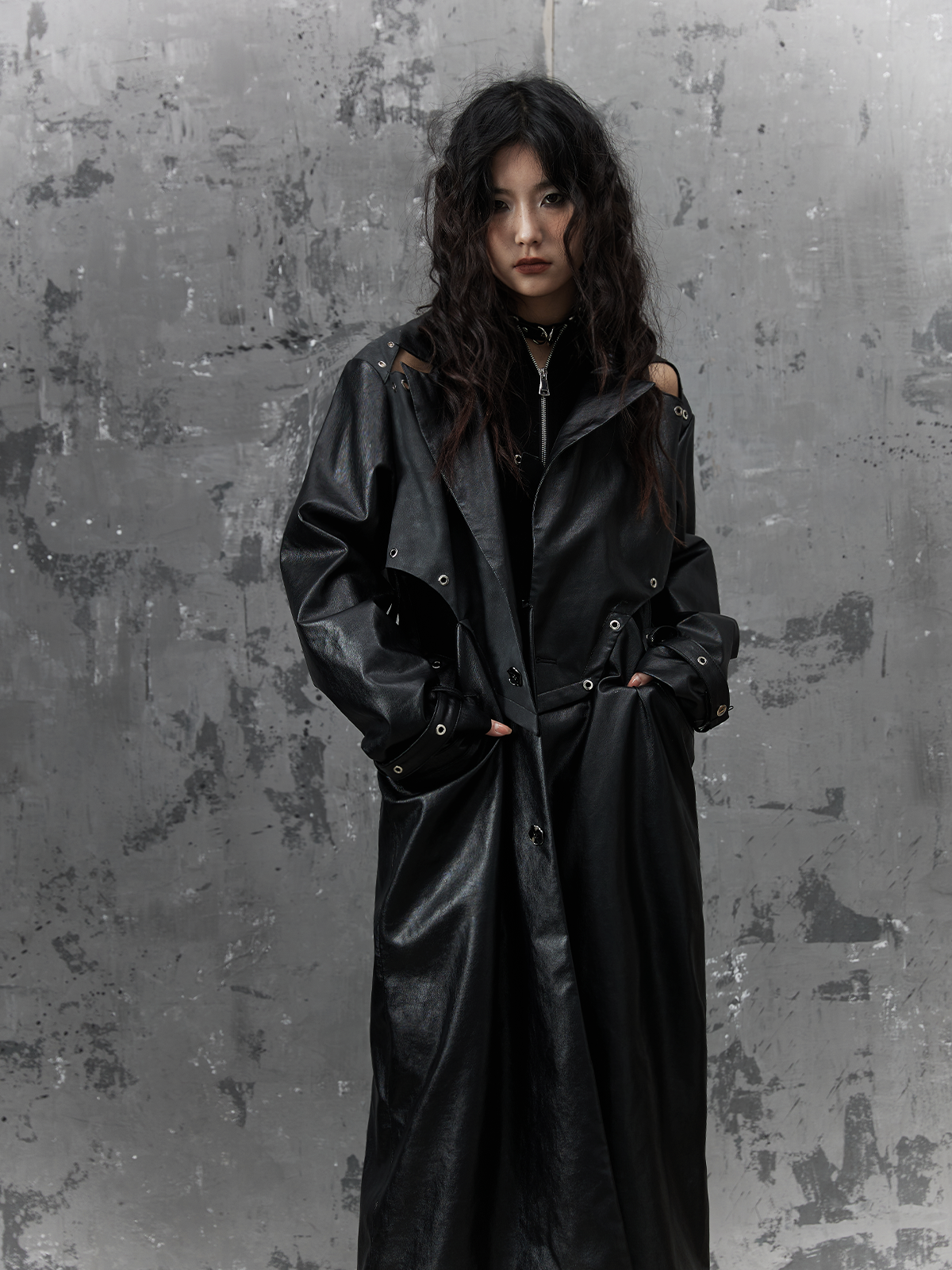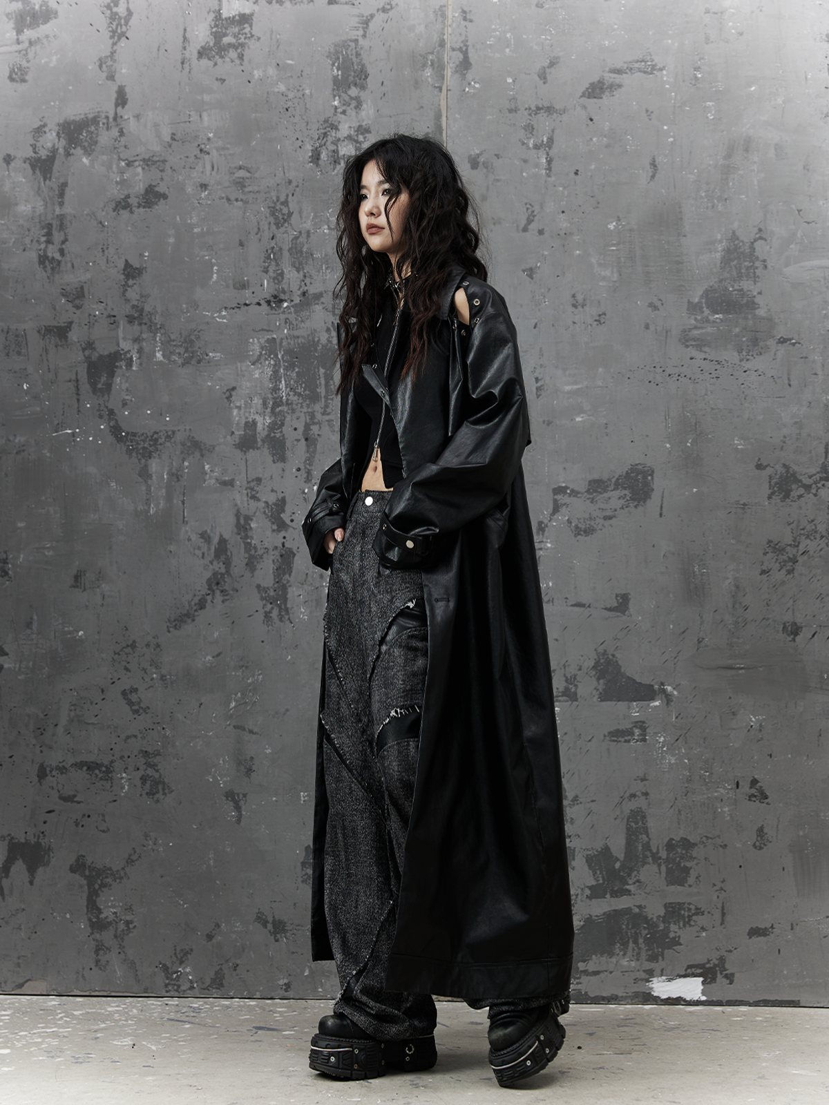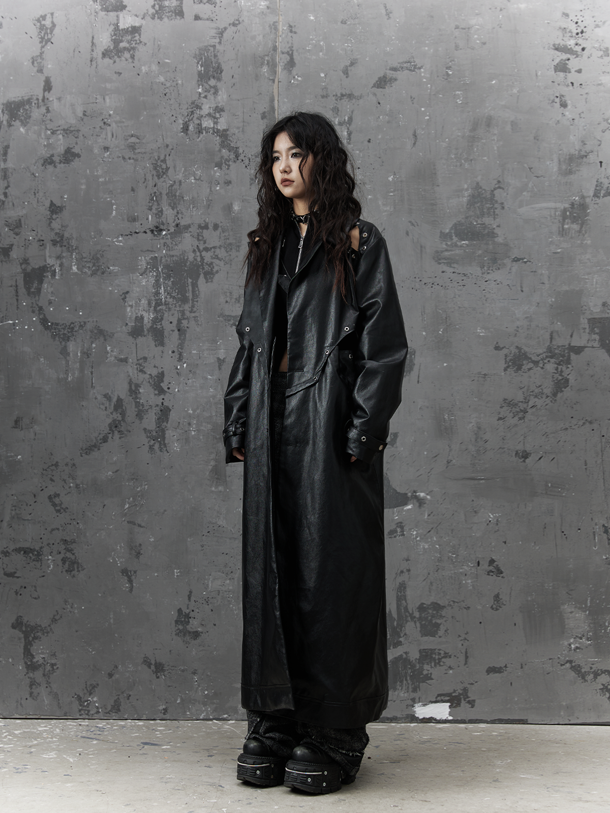 Cutout Patchwork Long PU Leather Trench Coat NA8173