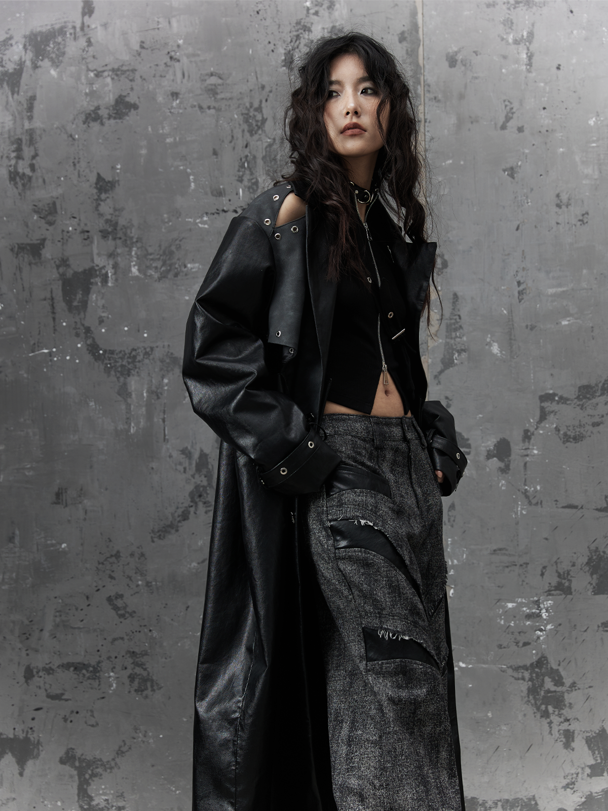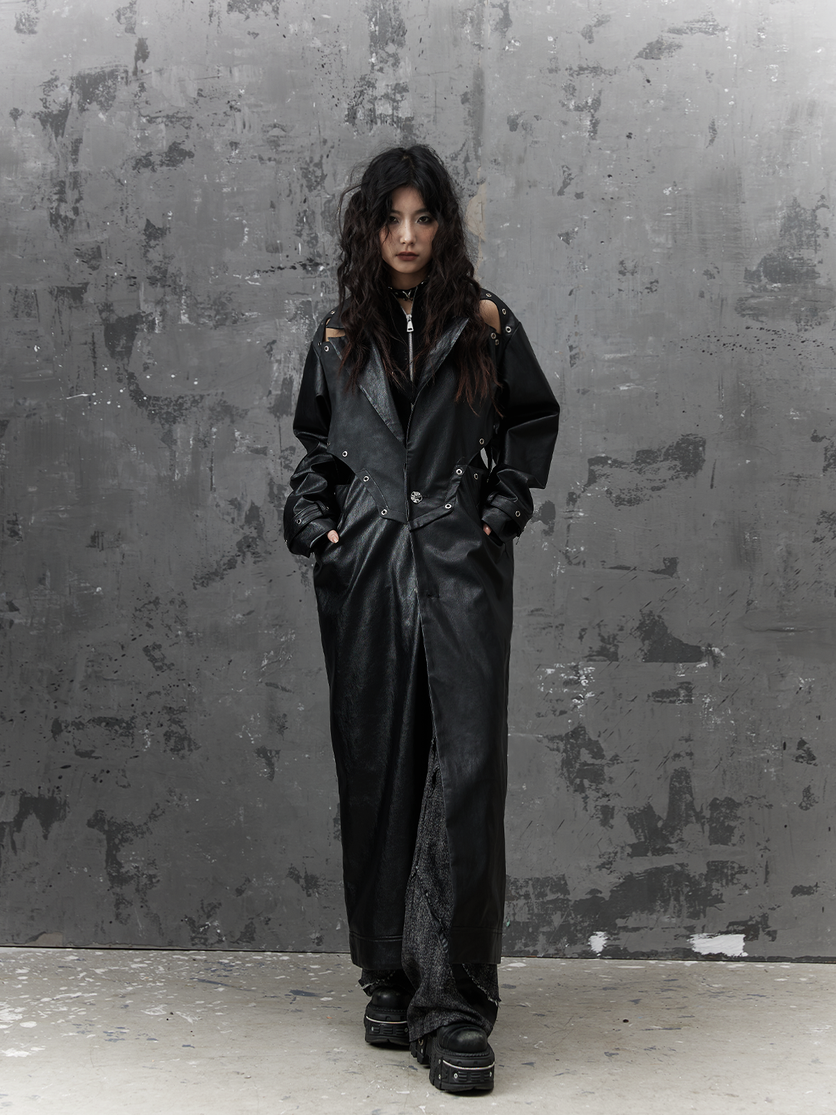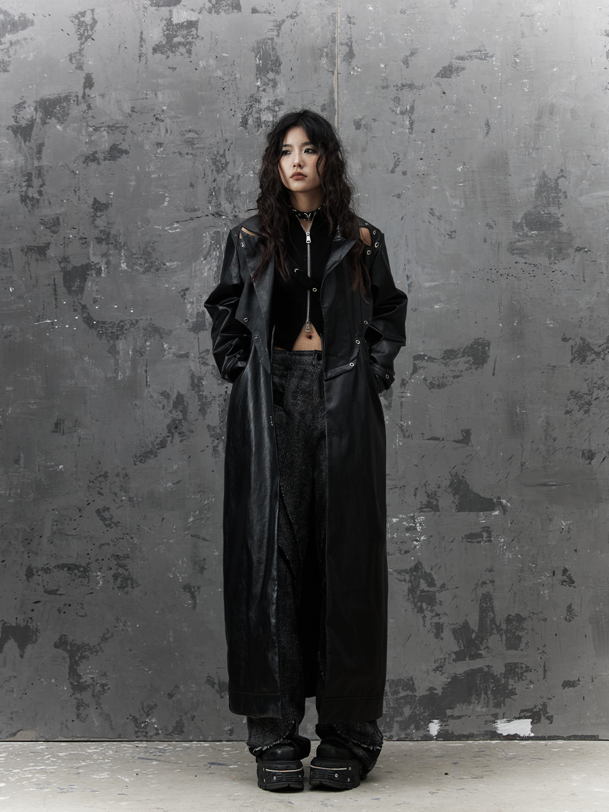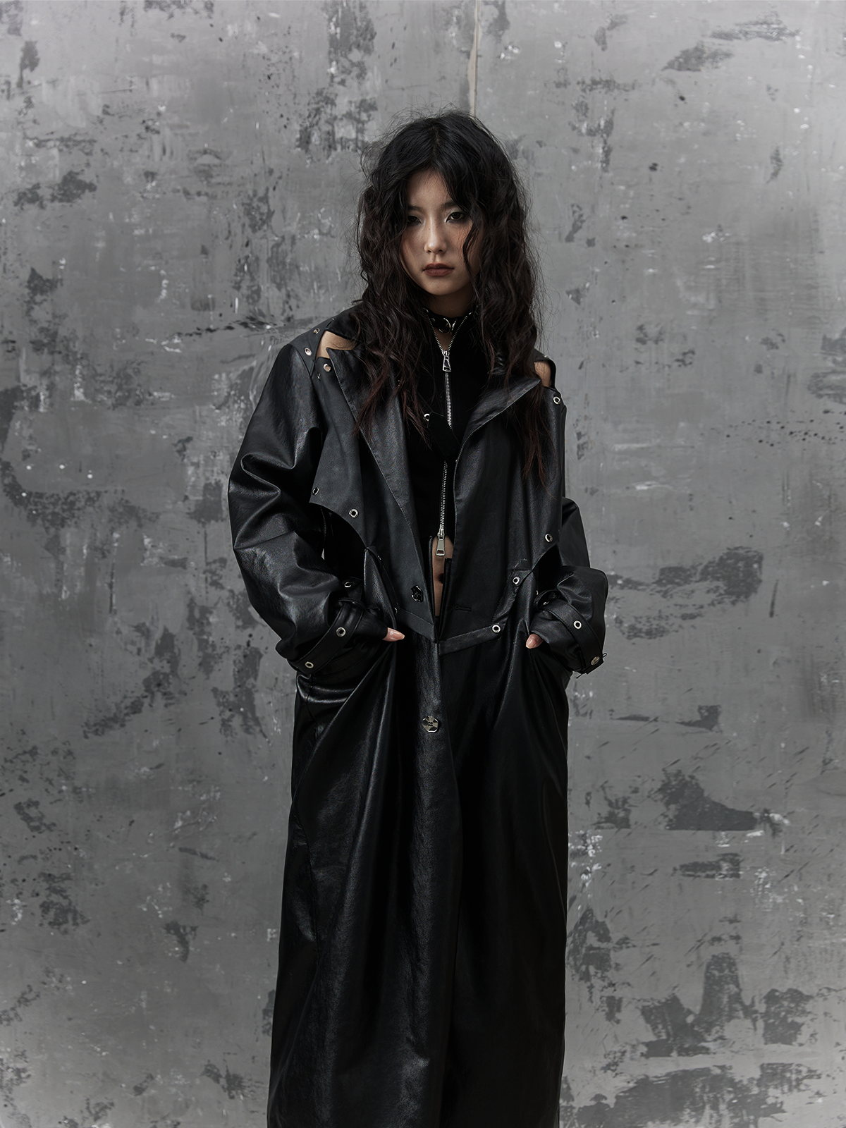 Cutout Patchwork Long PU Leather Trench Coat NA8173