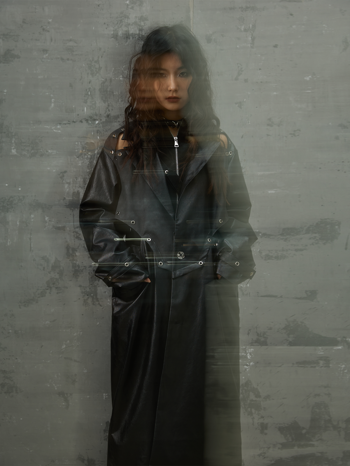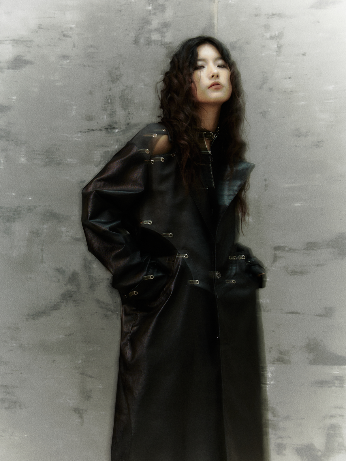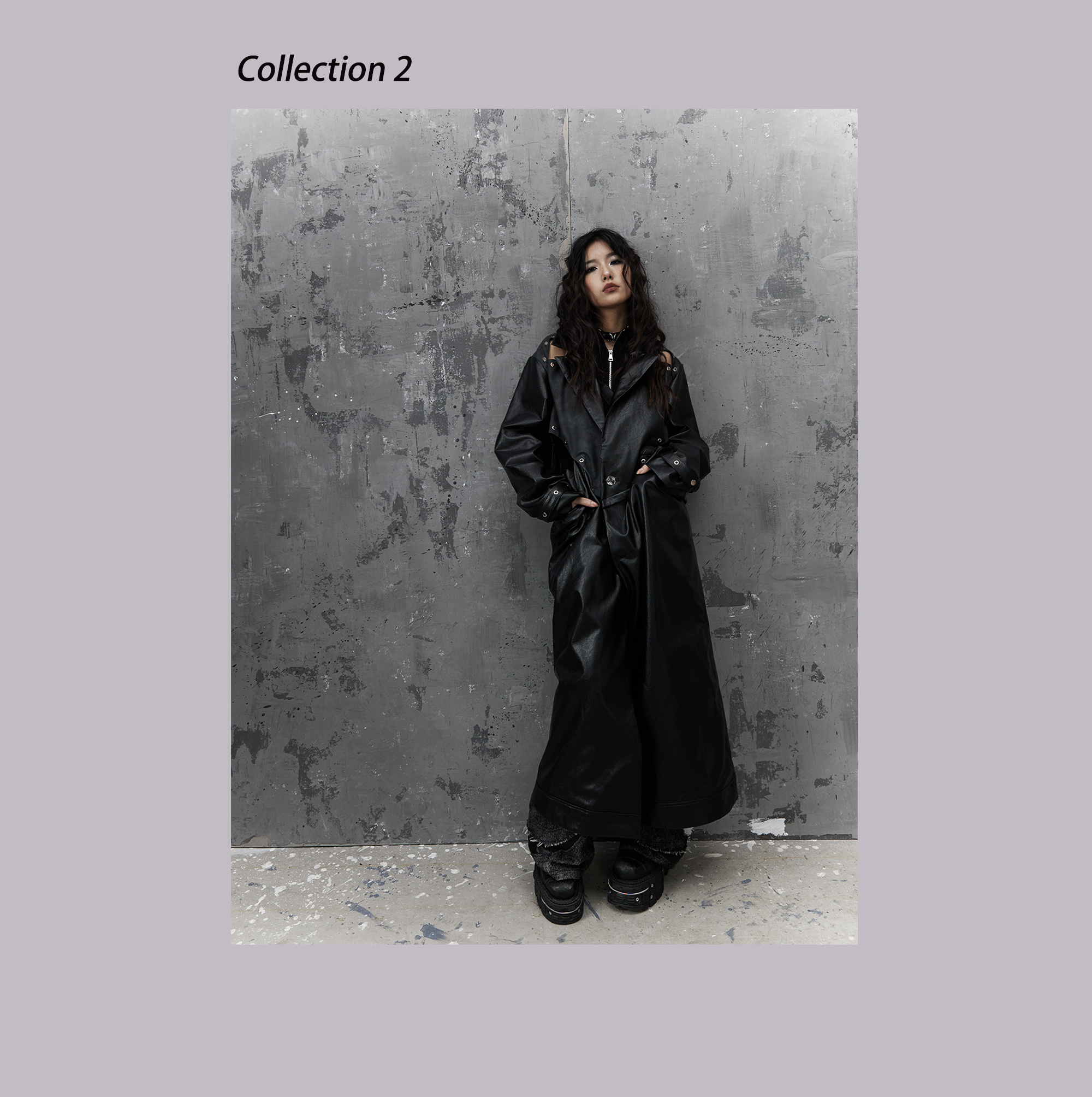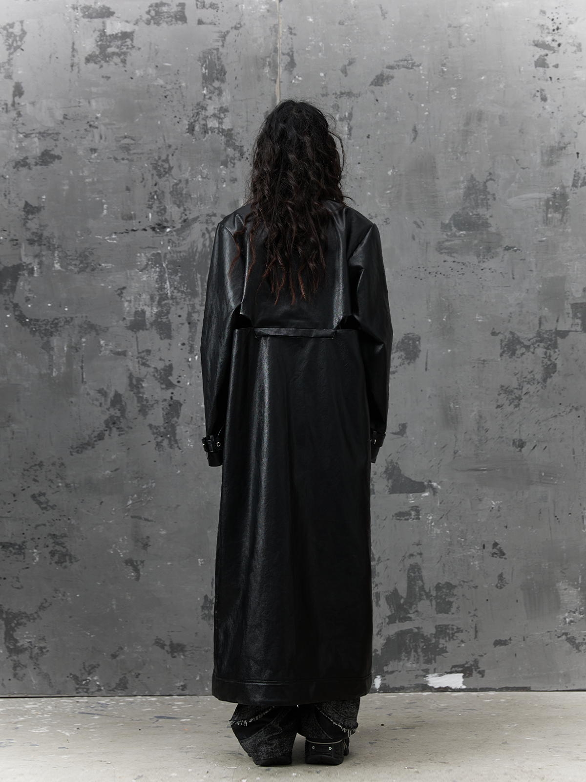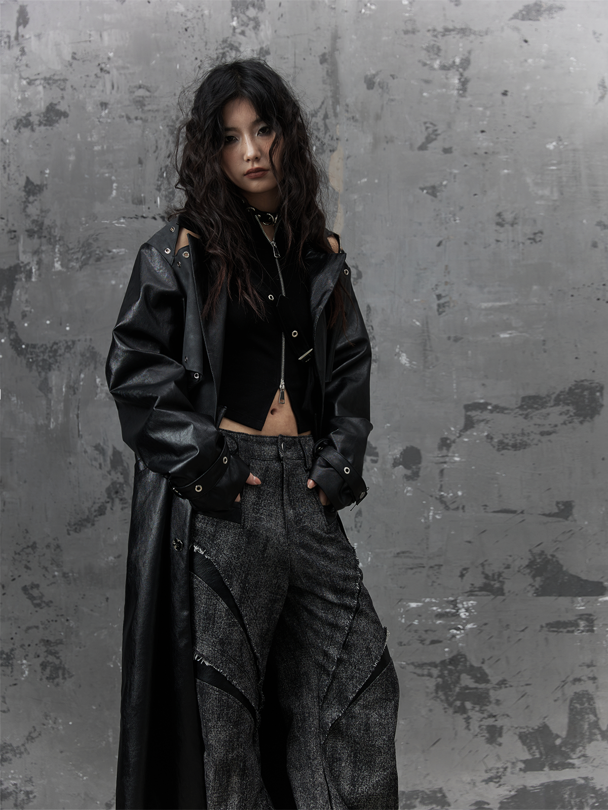 Cutout Patchwork Long PU Leather Trench Coat NA8173