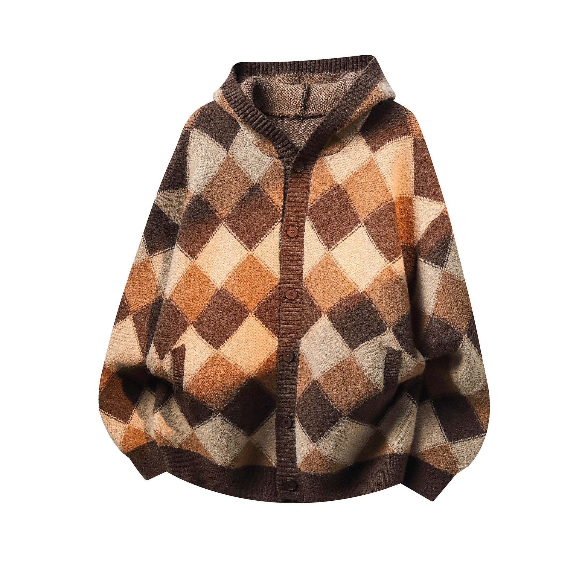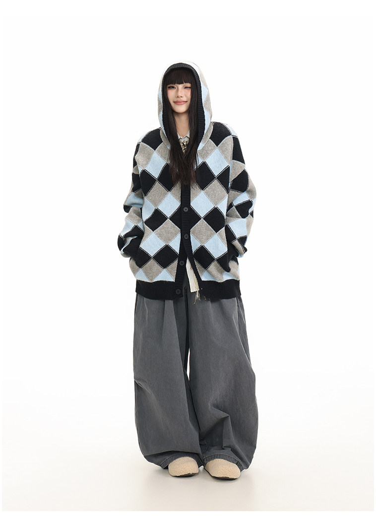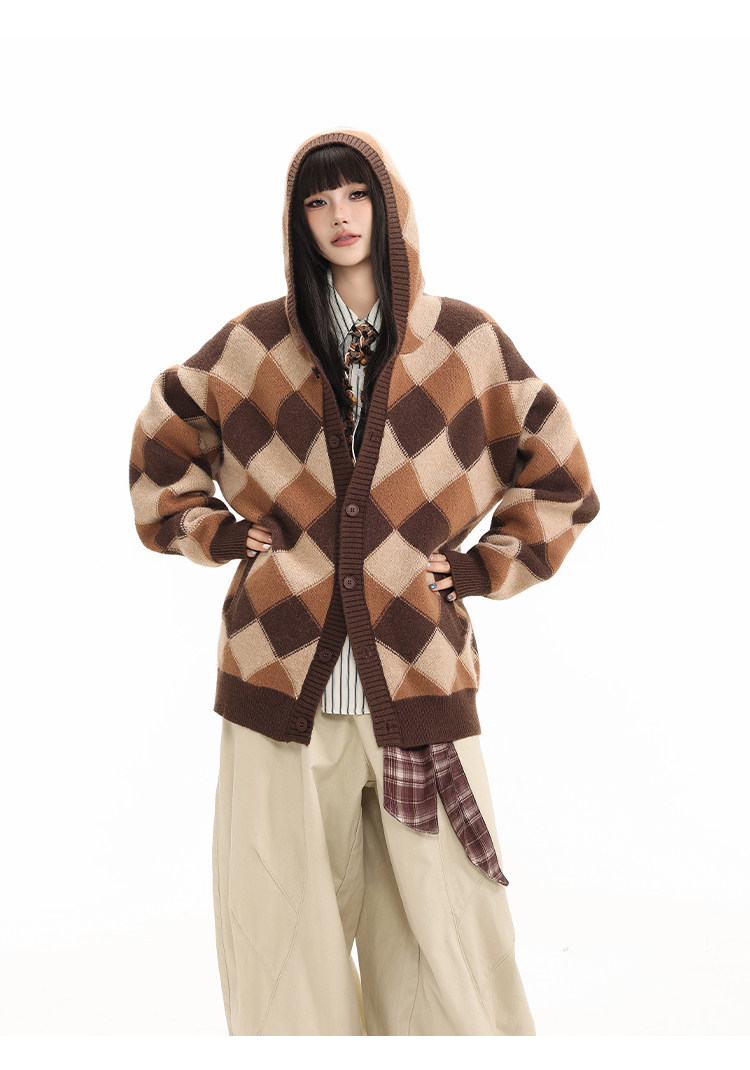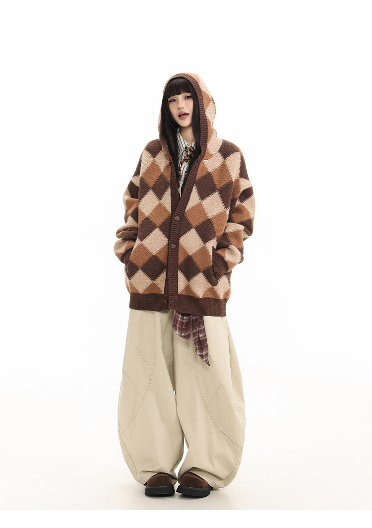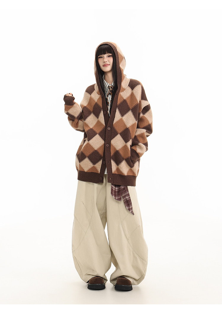 Heavyweight Diamond Pattern Oversize Hooded Knit Cardigan & Knit Sweater NA8871