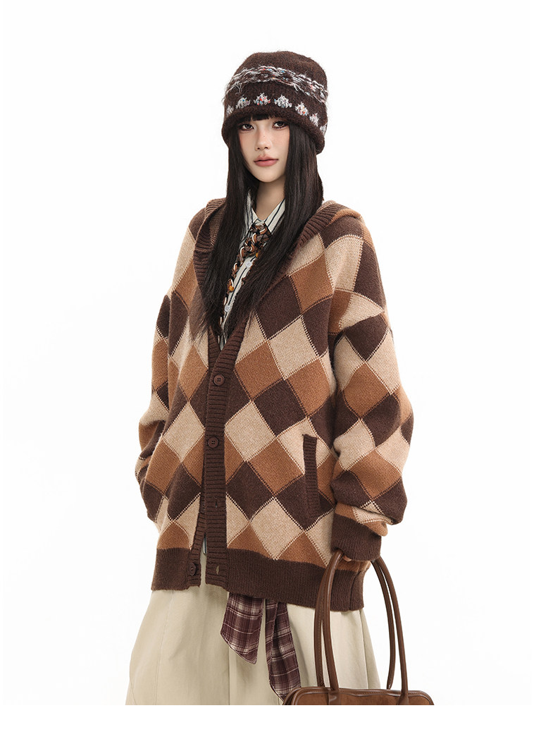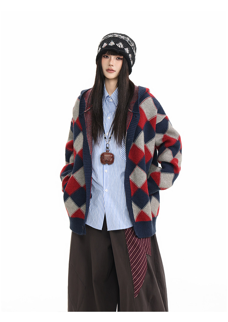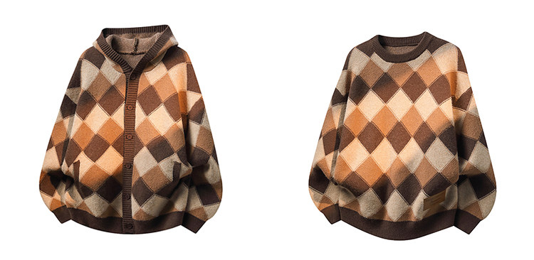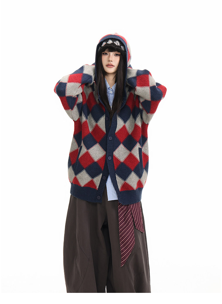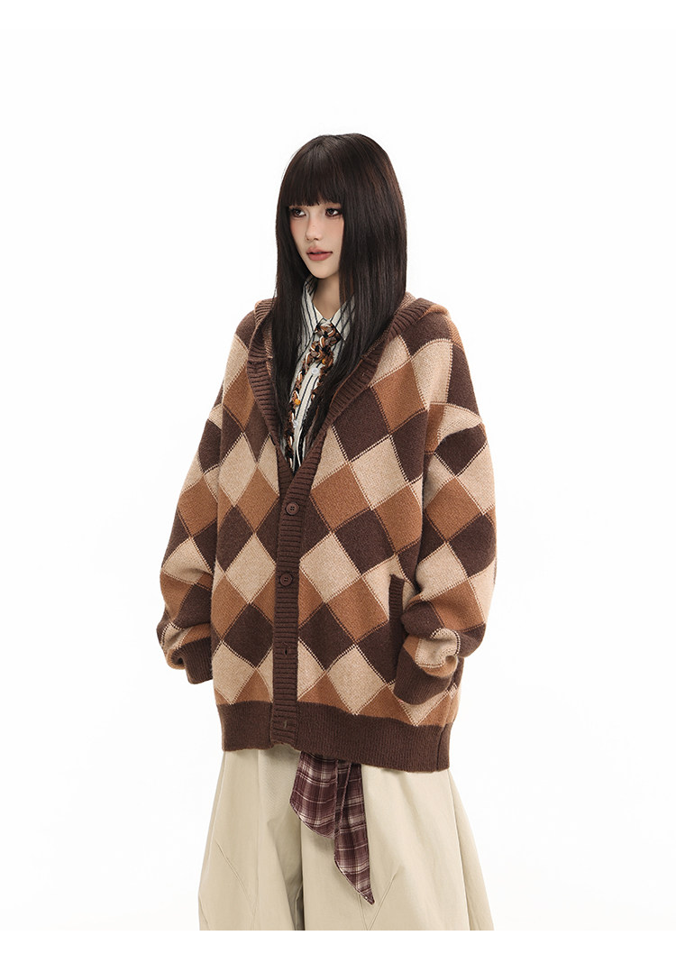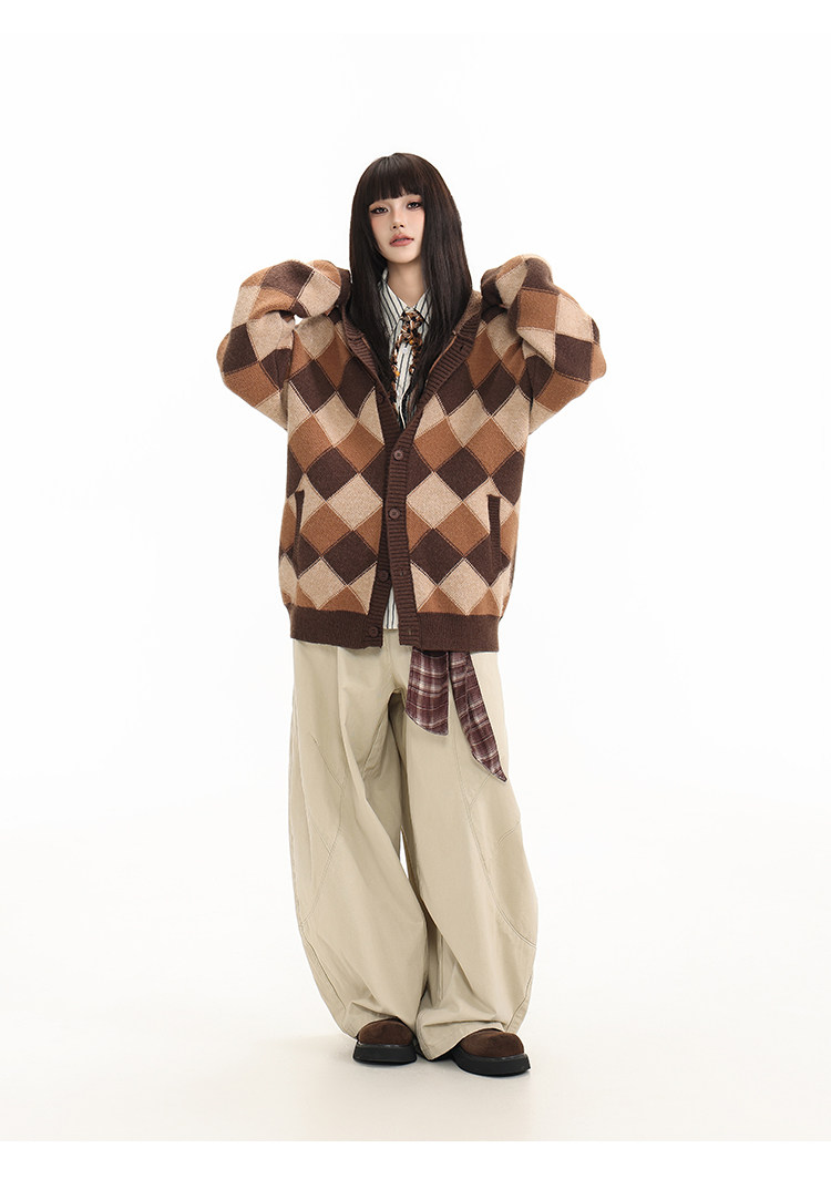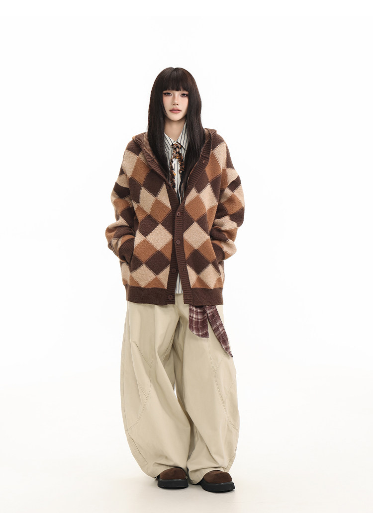 Heavyweight Diamond Pattern Oversize Hooded Knit Cardigan & Knit Sweater NA8871