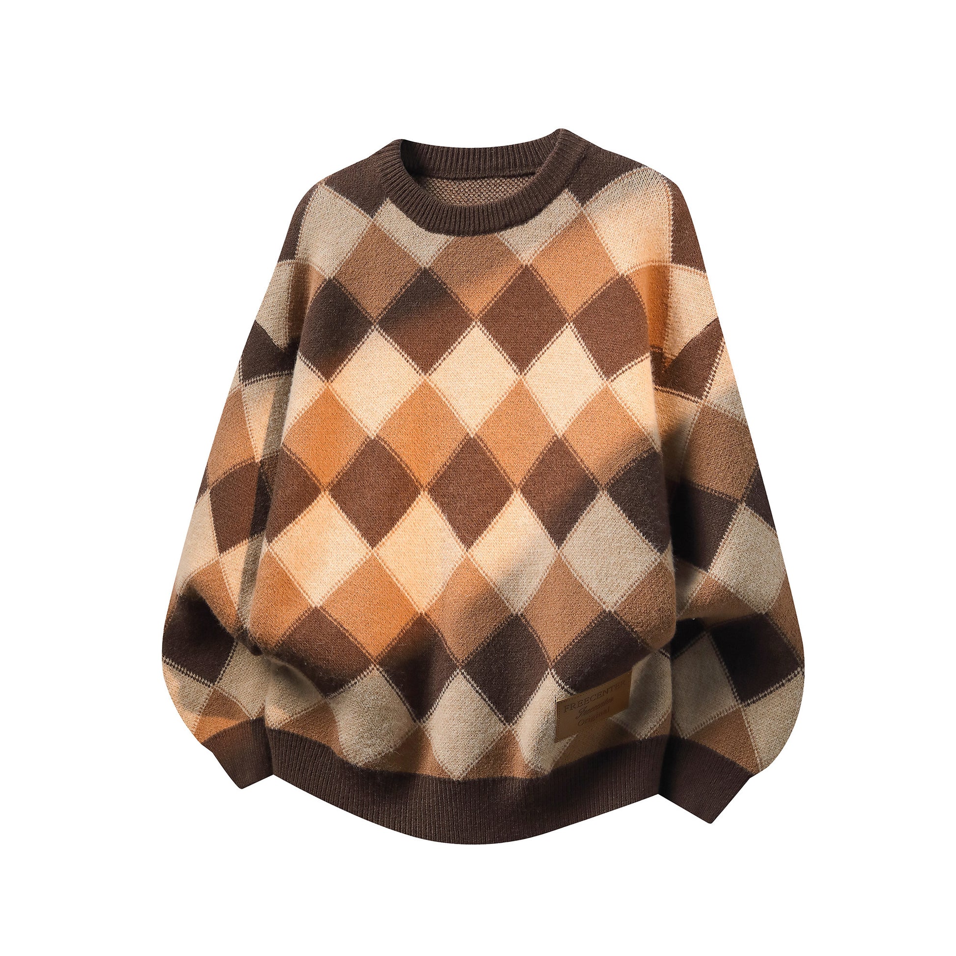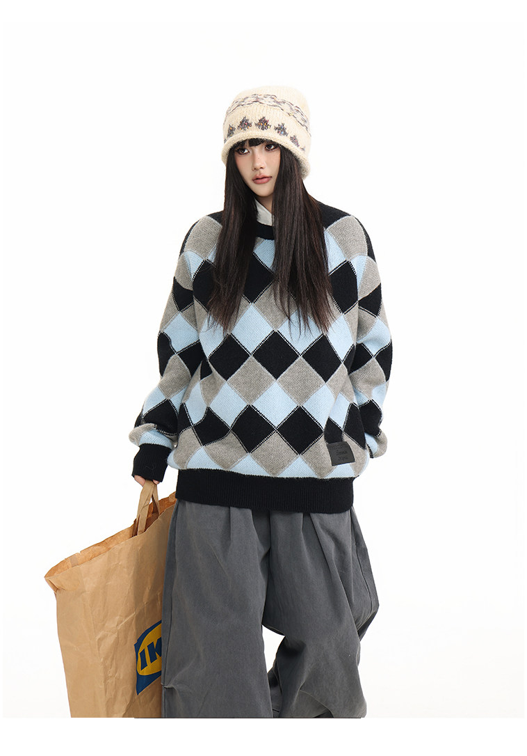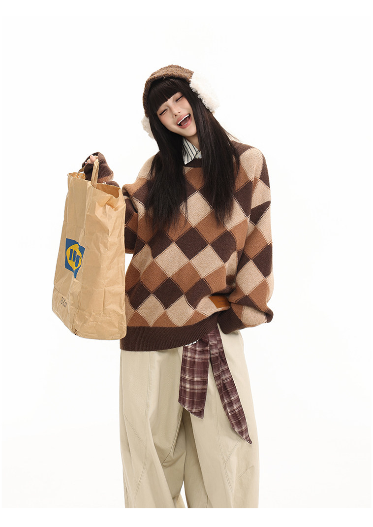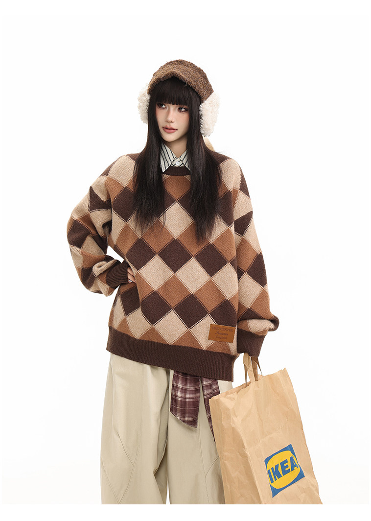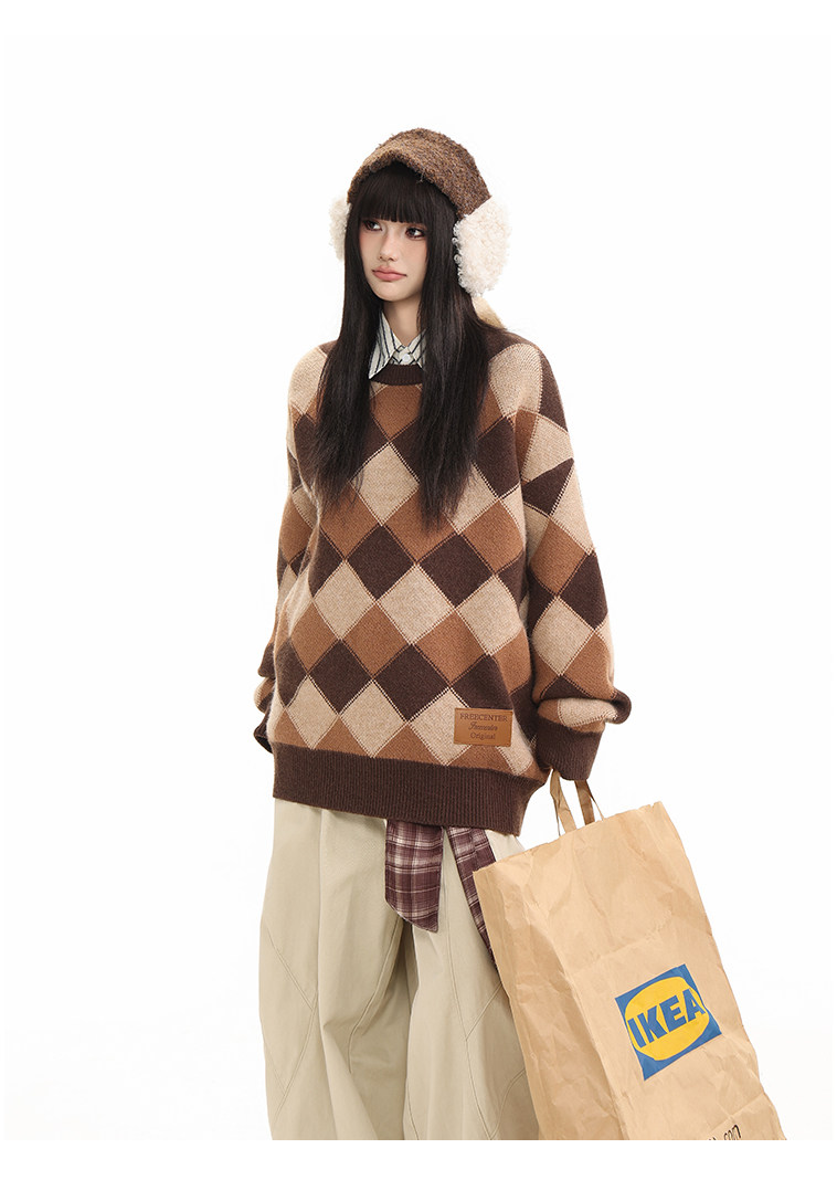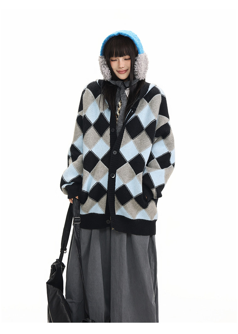 Heavyweight Diamond Pattern Oversize Hooded Knit Cardigan & Knit Sweater NA8871